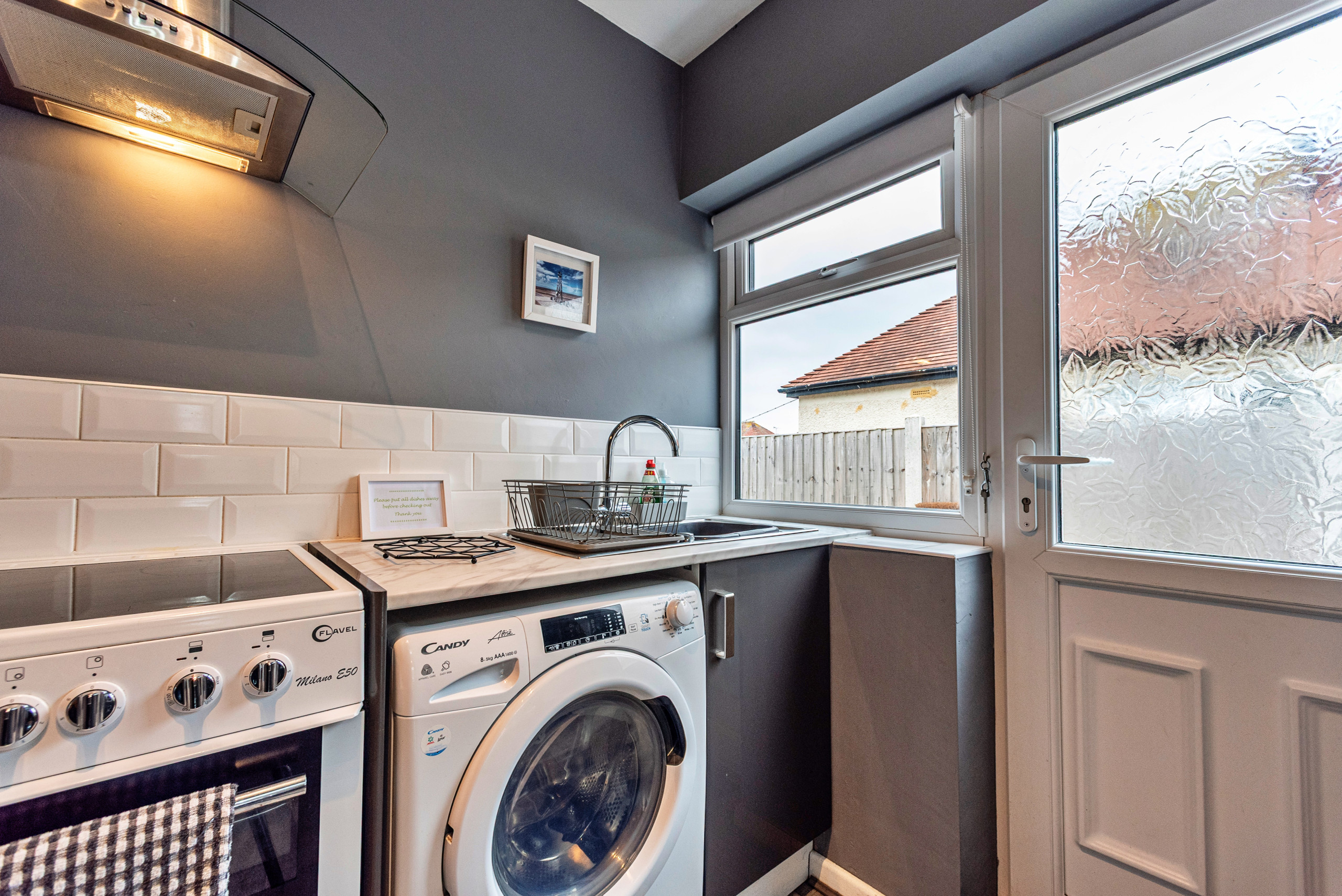 Die Küche ist ausgestattet in einen Kühlschrank, eine Mikrowelle, ein Backofen, Gefrierschrank, Geschirr/Besteck, Kochutensilien, einen Toaster und einen Wasserkocher.
