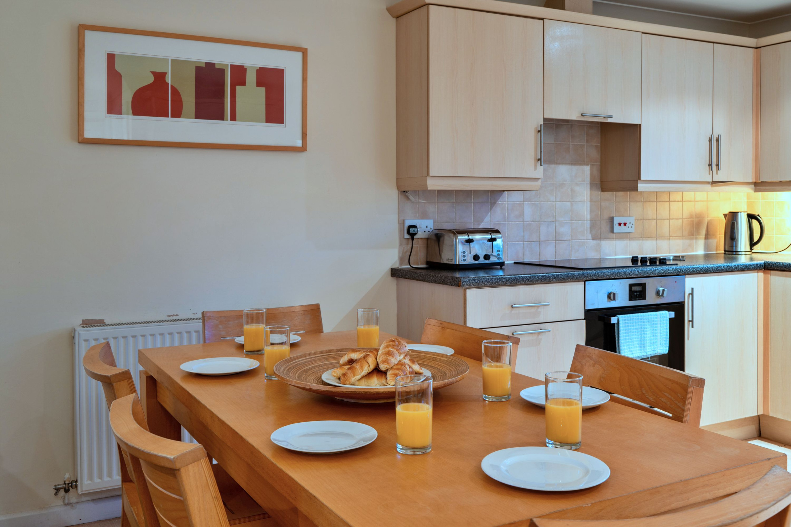 Die Küche ist ausgestattet in einen Kühlschrank, eine Mikrowelle, ein Backofen, eine Spülmaschine, Geschirr/Besteck, Kochutensilien, einen Toaster, einen Wasserkocher und Küchengeschirr.