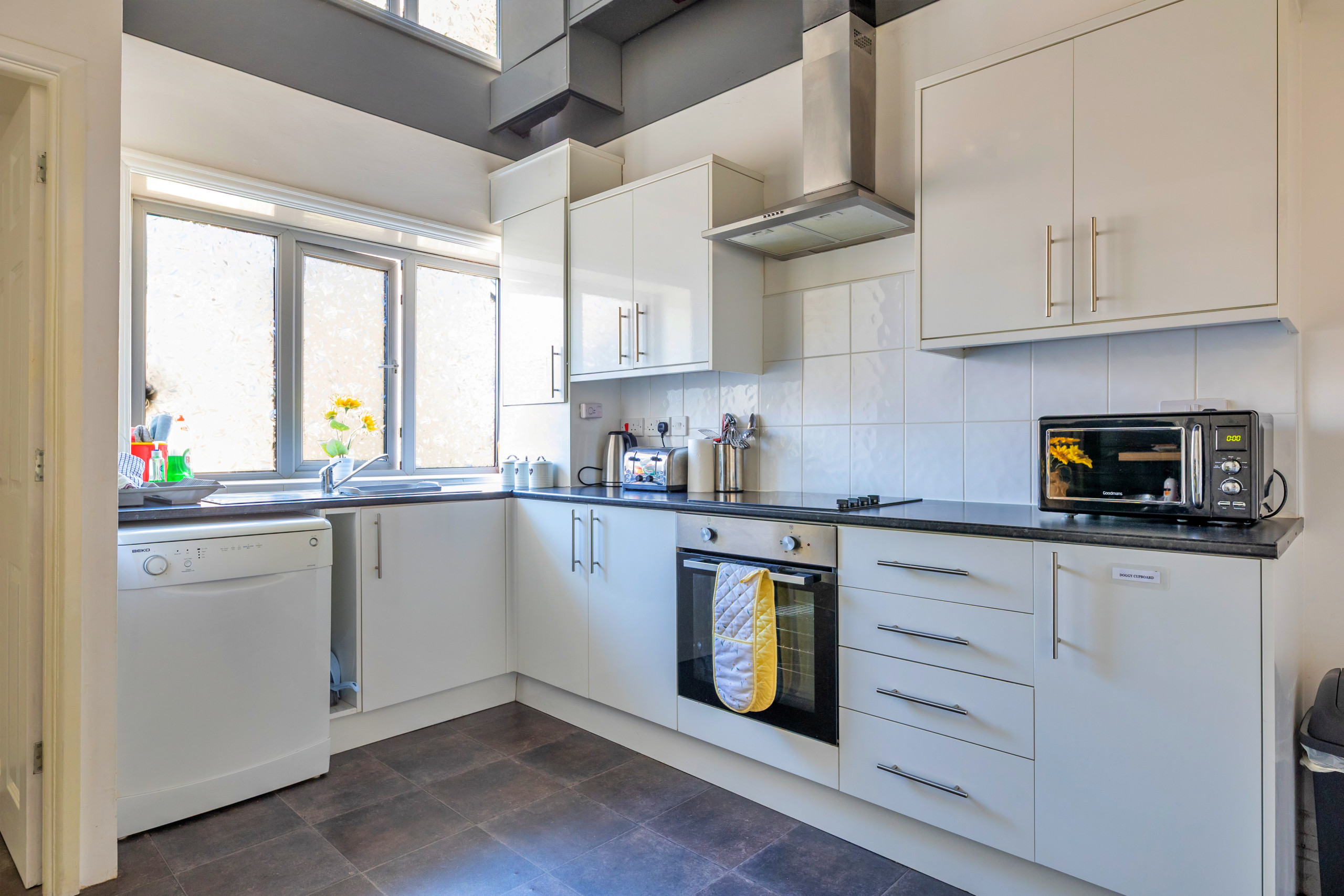 Die Küche ist ausgestattet in einen Kühlschrank, eine Mikrowelle, ein Backofen, Gefrierschrank, eine Spülmaschine, Geschirr/Besteck, Kochutensilien, einen Toaster und einen Wasserkocher.