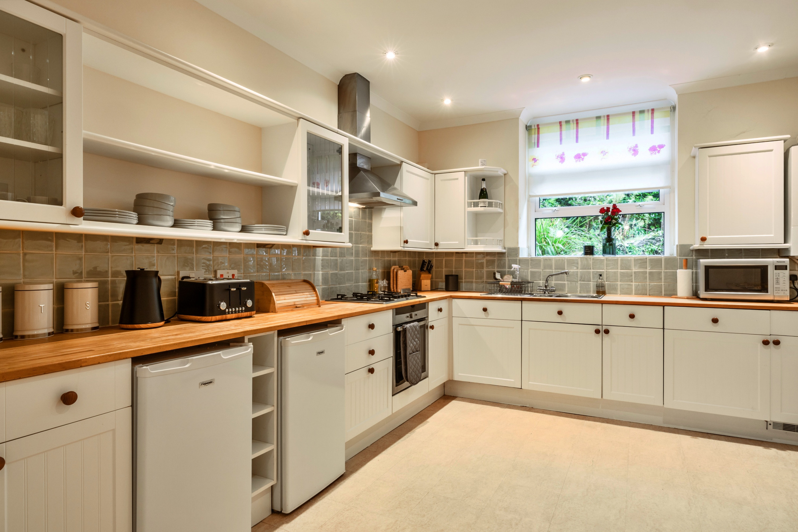 Die Küche ist ausgestattet in einen Kühlschrank, eine Mikrowelle, ein Backofen, Gefrierschrank, Geschirr/Besteck, Kochutensilien, einen Toaster und einen Wasserkocher.