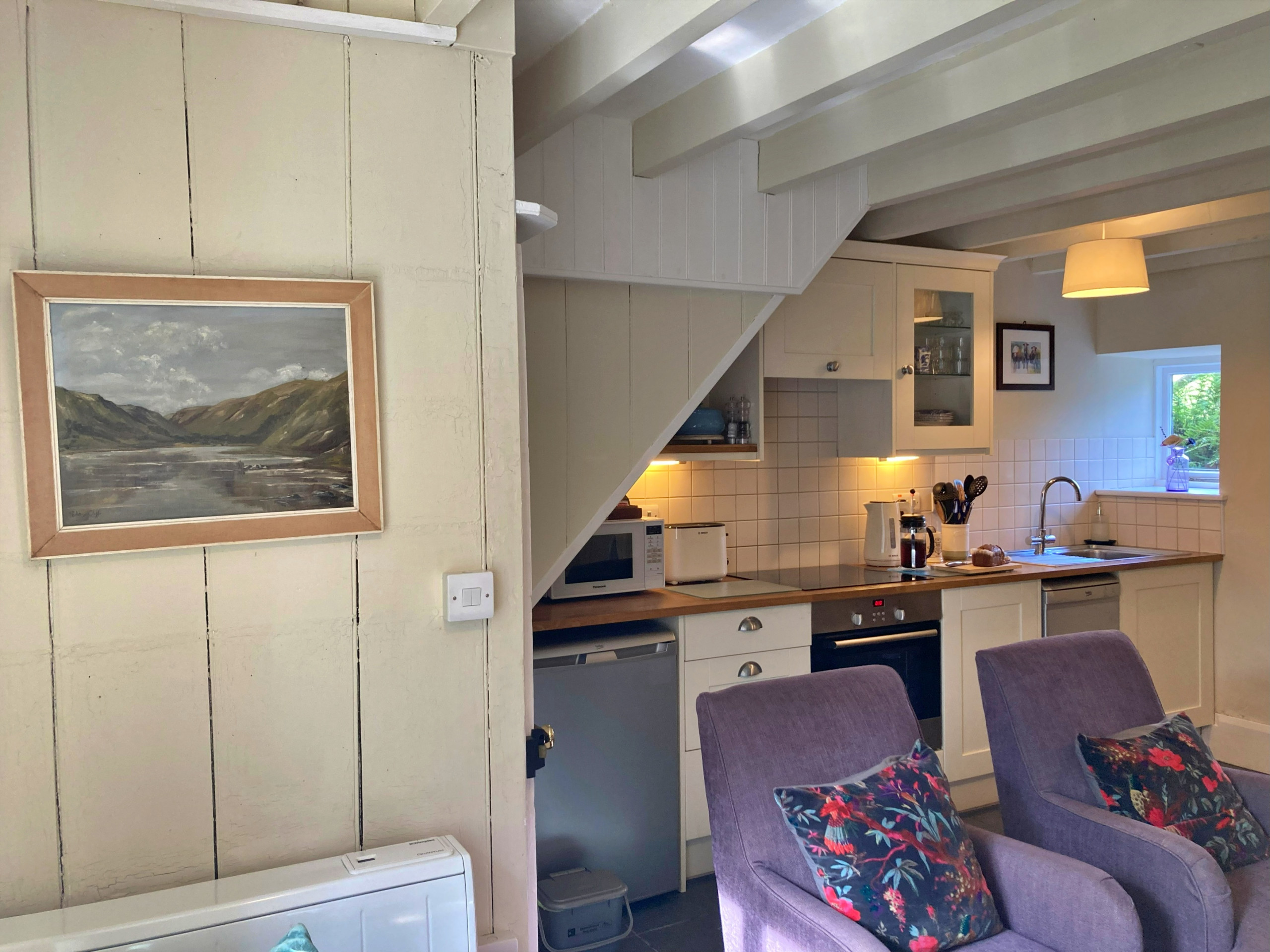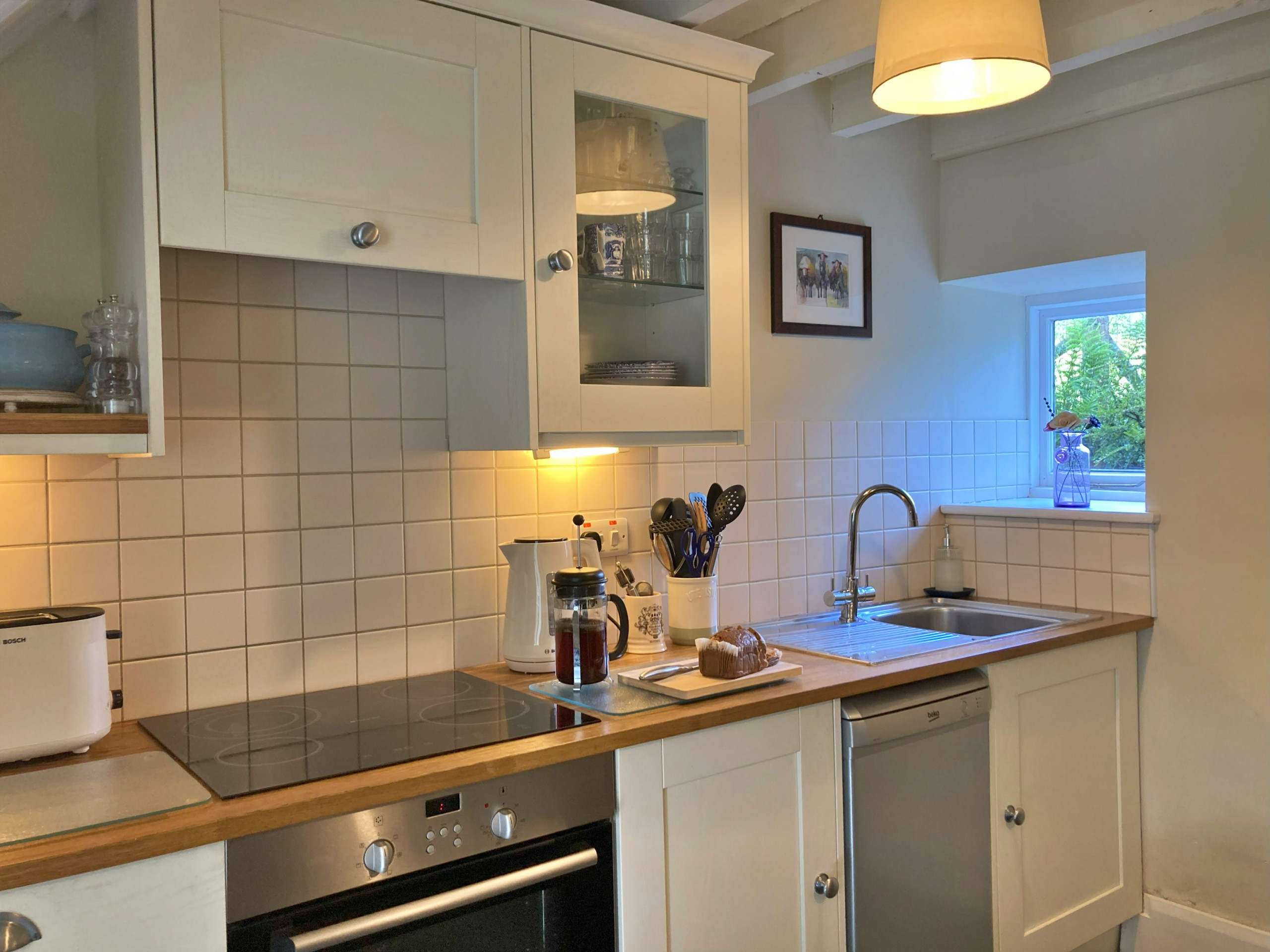 Die Küche ist ausgestattet in einen Kühlschrank, eine Mikrowelle, ein Backofen, Gefrierschrank, eine Spülmaschine, Geschirr/Besteck, Kochutensilien, eine Kaffeemaschine, einen Toaster und einen Wasserkocher.
