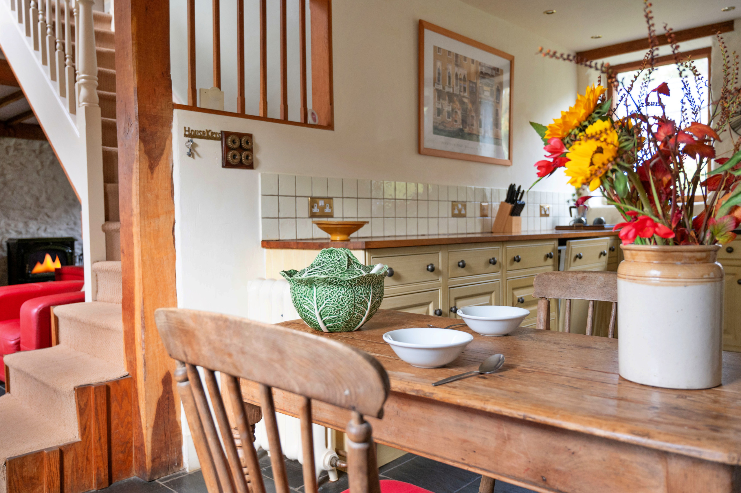 Die Küche ist ausgestattet in einen Kühlschrank, eine Mikrowelle, ein Backofen, Gefrierschrank, Geschirr/Besteck, Kochutensilien, einen Toaster und einen Wasserkocher.