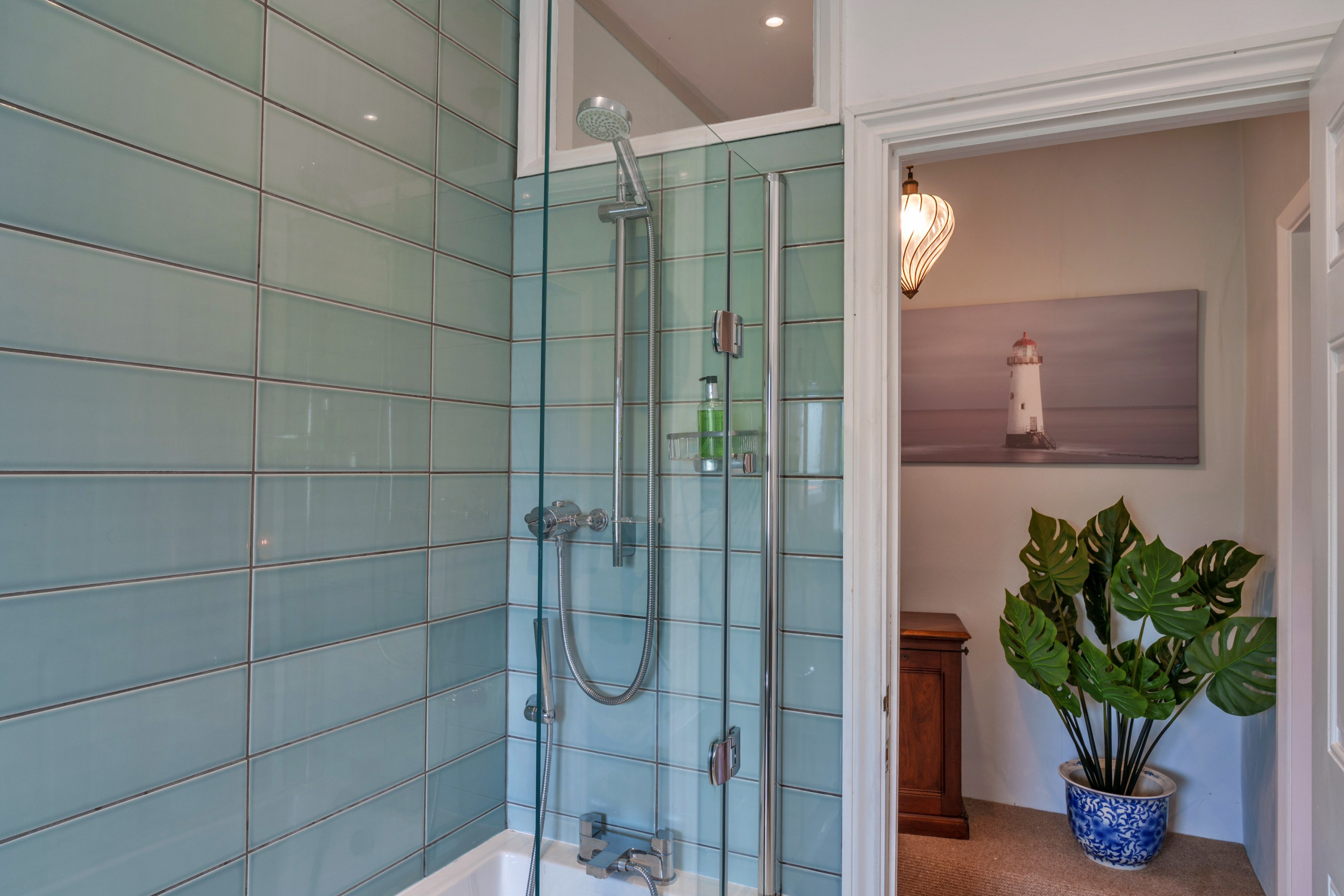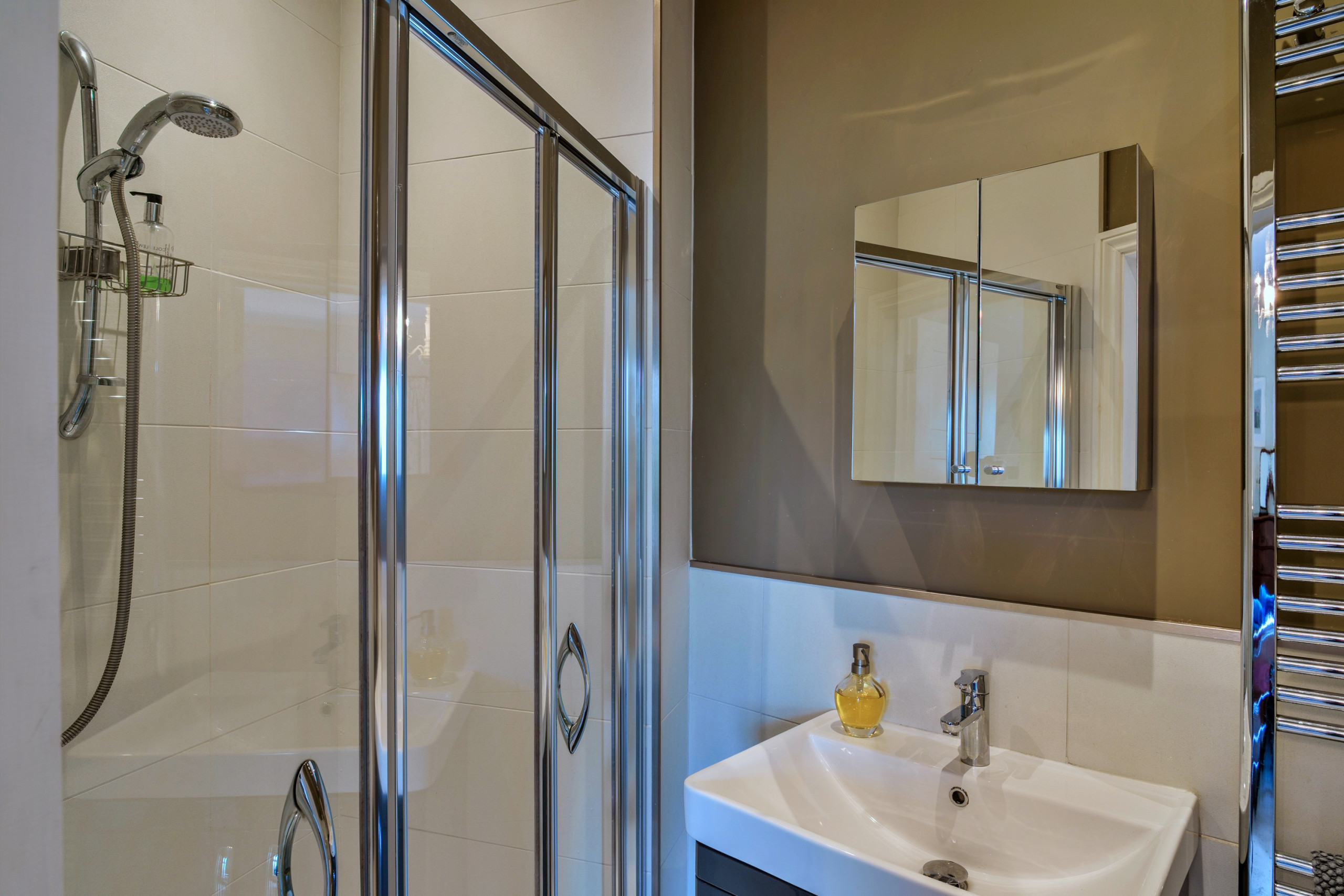 The shower head in the en-suite bathroom is rather high and difficult to lower because of the soap basket below |