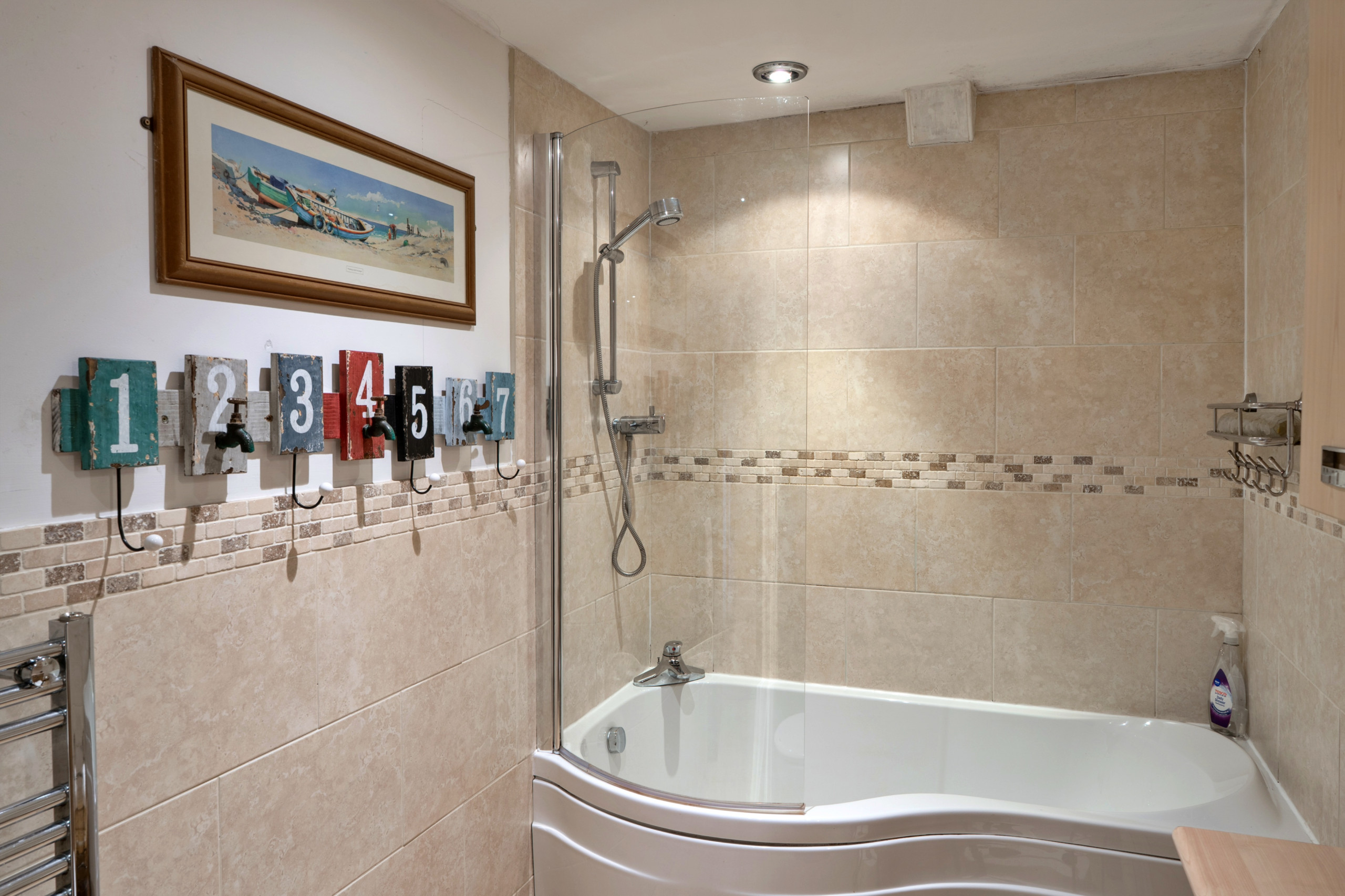 Die Küche ist ausgestattet in einen Kühlschrank, eine Mikrowelle, ein Backofen, Gefrierschrank, eine Spülmaschine, Geschirr/Besteck, Kochutensilien, einen Toaster und einen Wasserkocher.