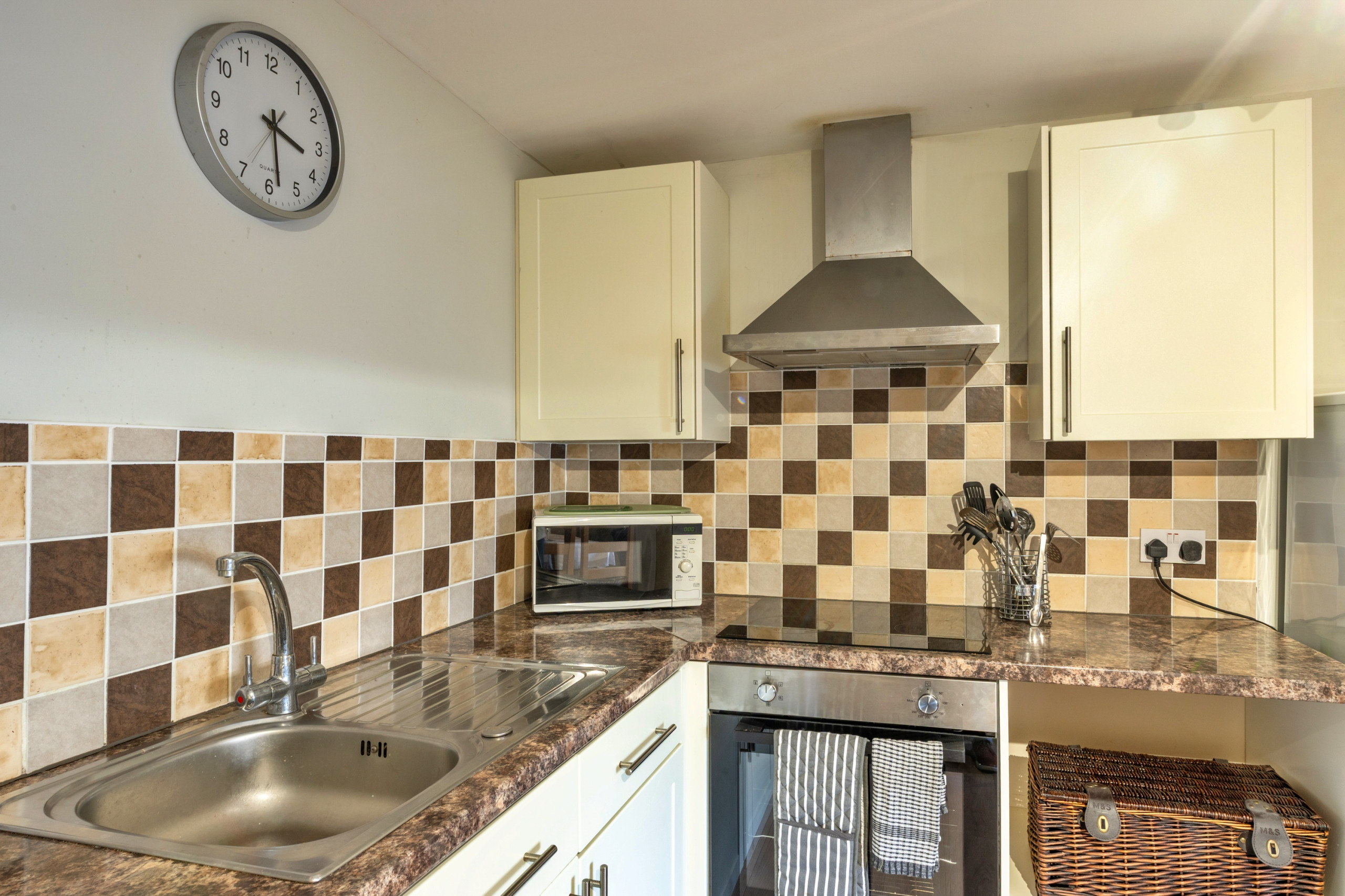 Die Küche ist ausgestattet in einen Kühlschrank, eine Mikrowelle, ein Backofen, Gefrierschrank, eine Spülmaschine, Geschirr/Besteck, Kochutensilien, einen Toaster und einen Wasserkocher.
