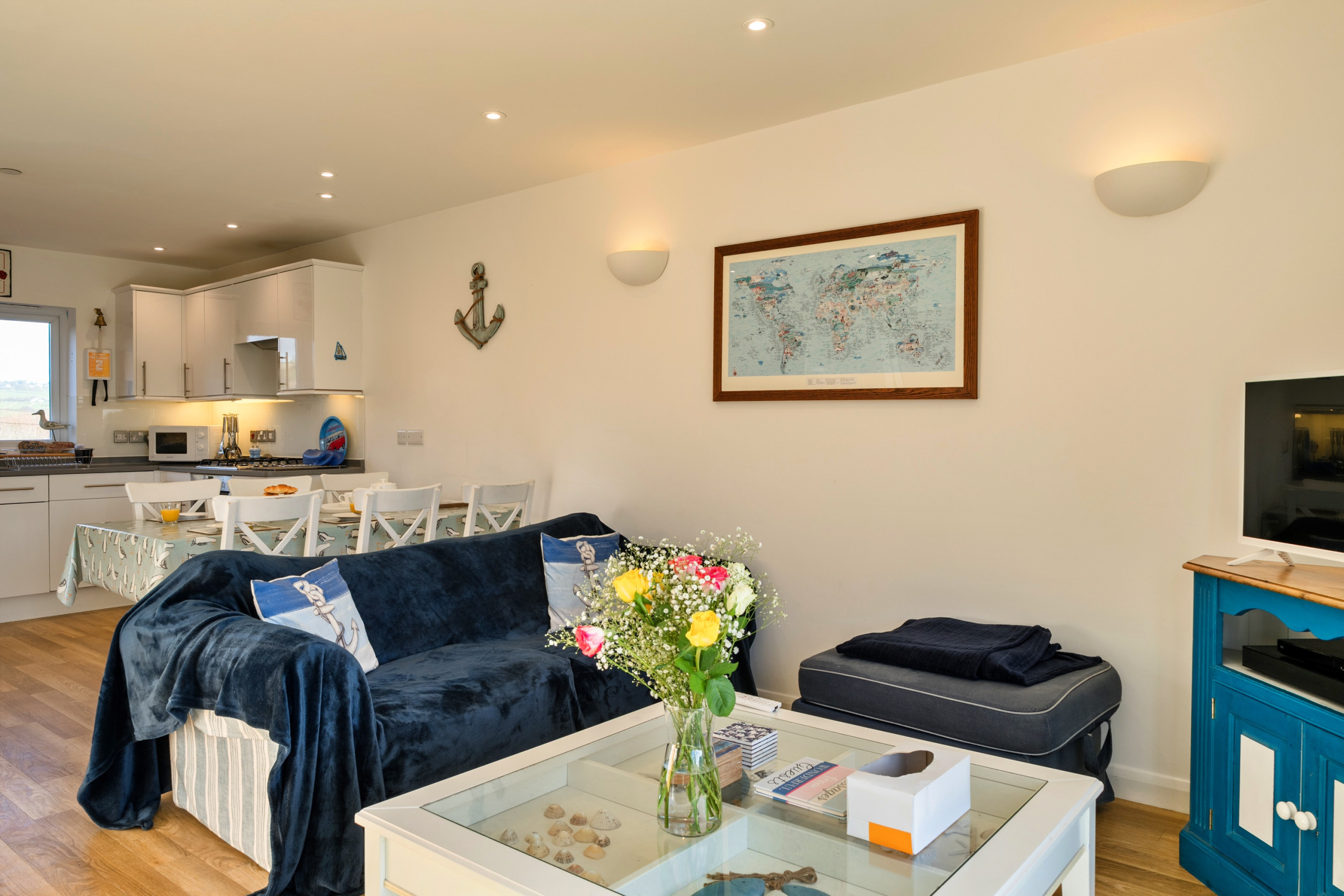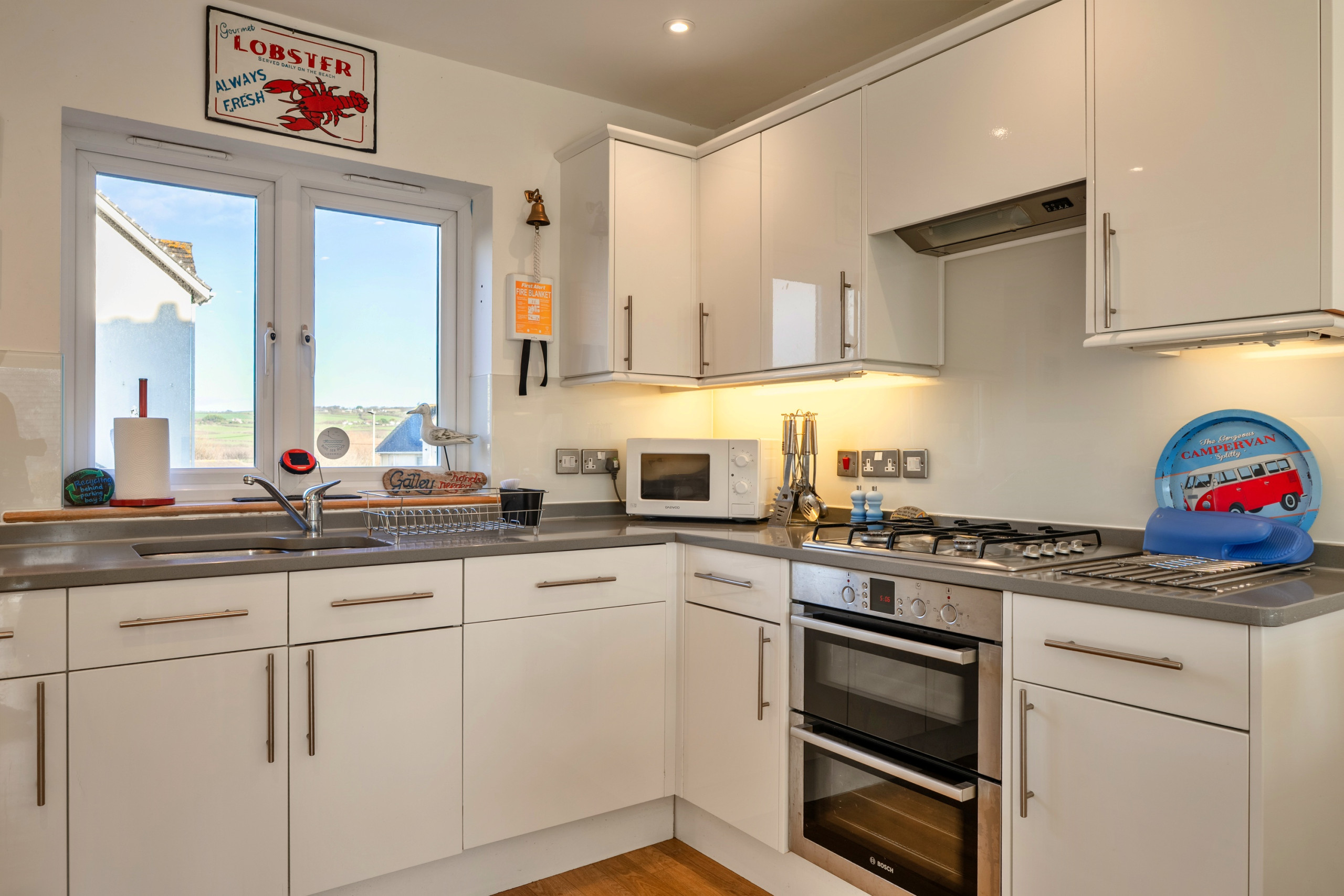 The entrance leads into a welcoming ground floor, where a fantastic play den provides endless entertainment with table football, PlayStation 3, toys, games and comfy bean bags. This floor also includes a useful utility room and a large shower room. On the first floor, a bright open-plan living space brings everyone together. The well-equipped kitchen, generous dining area and comfortable sitting area flow seamlessly, and patio doors open out to the enclosed garden, ideal for outdoor dining or simply relaxing in the sea air.