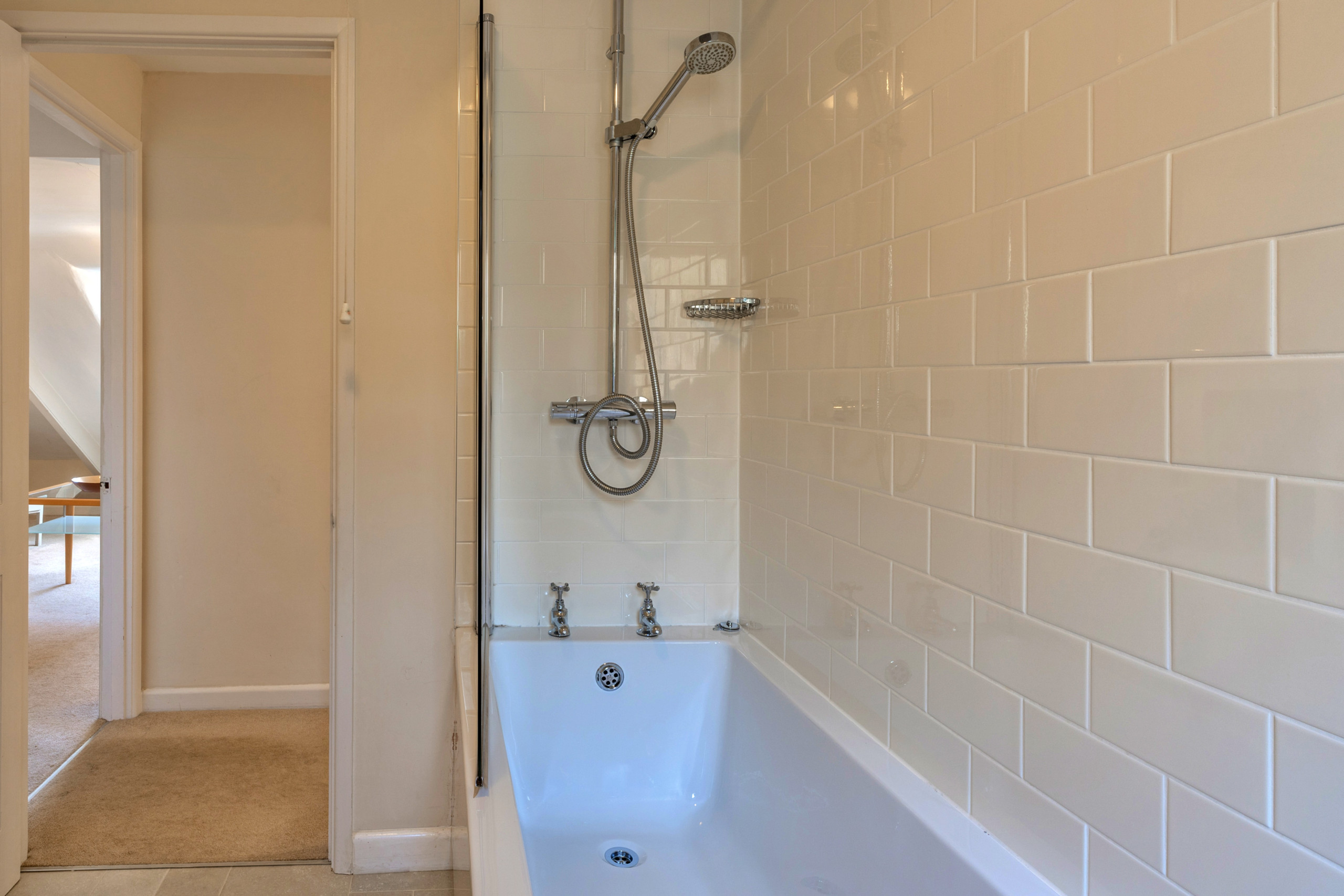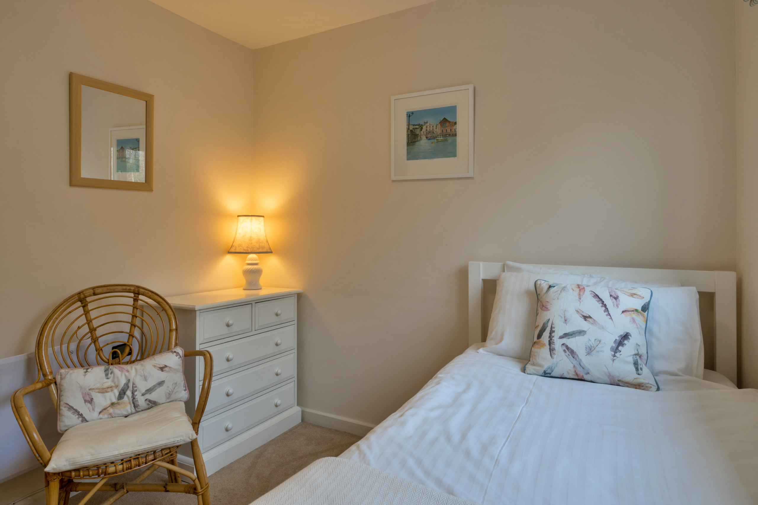 The bedrooms are thoughtfully positioned towards the entrance of the property. The spacious double bedroom enjoys lovely water views, offering a peaceful spot to wake each morning. Opposite, a charming single bedroom also includes an additional pull-out single bed, providing flexible sleeping arrangements for an extra guest if required. Completing the accommodation is a bathroom fitted with a shower over bath and WC.