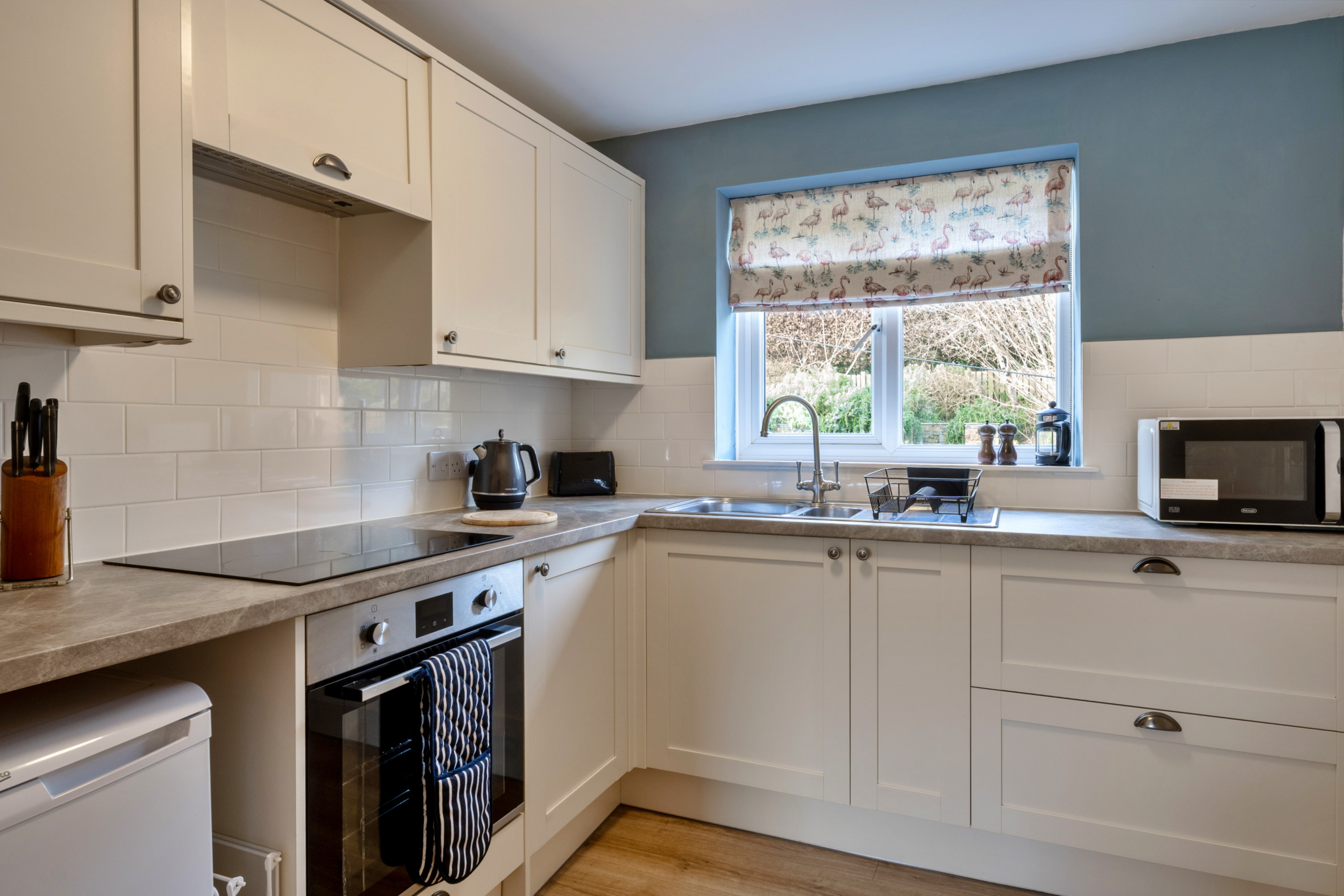 At the heart of the property is a wonderfully light and airy open-plan lounge/kitchen/diner — a welcoming space designed for both relaxation and sociable evenings in. After a day of exploring, sink into the sofa and unwind with a favourite film on the TV, or gather around the dining table to enjoy a leisurely meal together. The compact yet well-equipped kitchen features an electric oven and hob, microwave, and fridge, providing everything needed to prepare anything from a hearty breakfast to a simple supper.