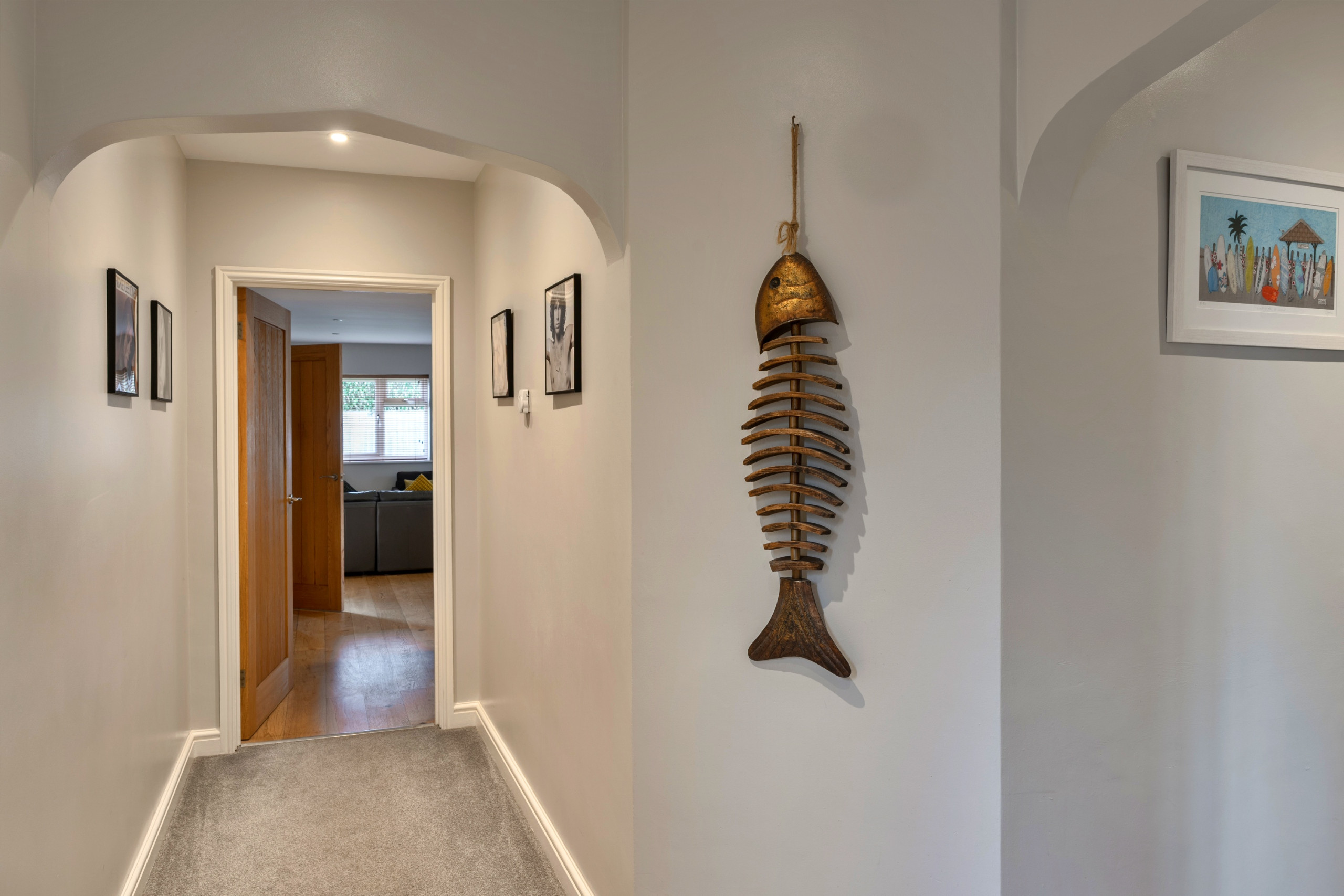 At first glance, its exterior may seem modest, but step through the front door and you’ll be pleasantly surprised. A spacious hallway welcomes you, adorned with framed vintage vinyl album covers and local artwork, setting a warm and creative tone for your stay.