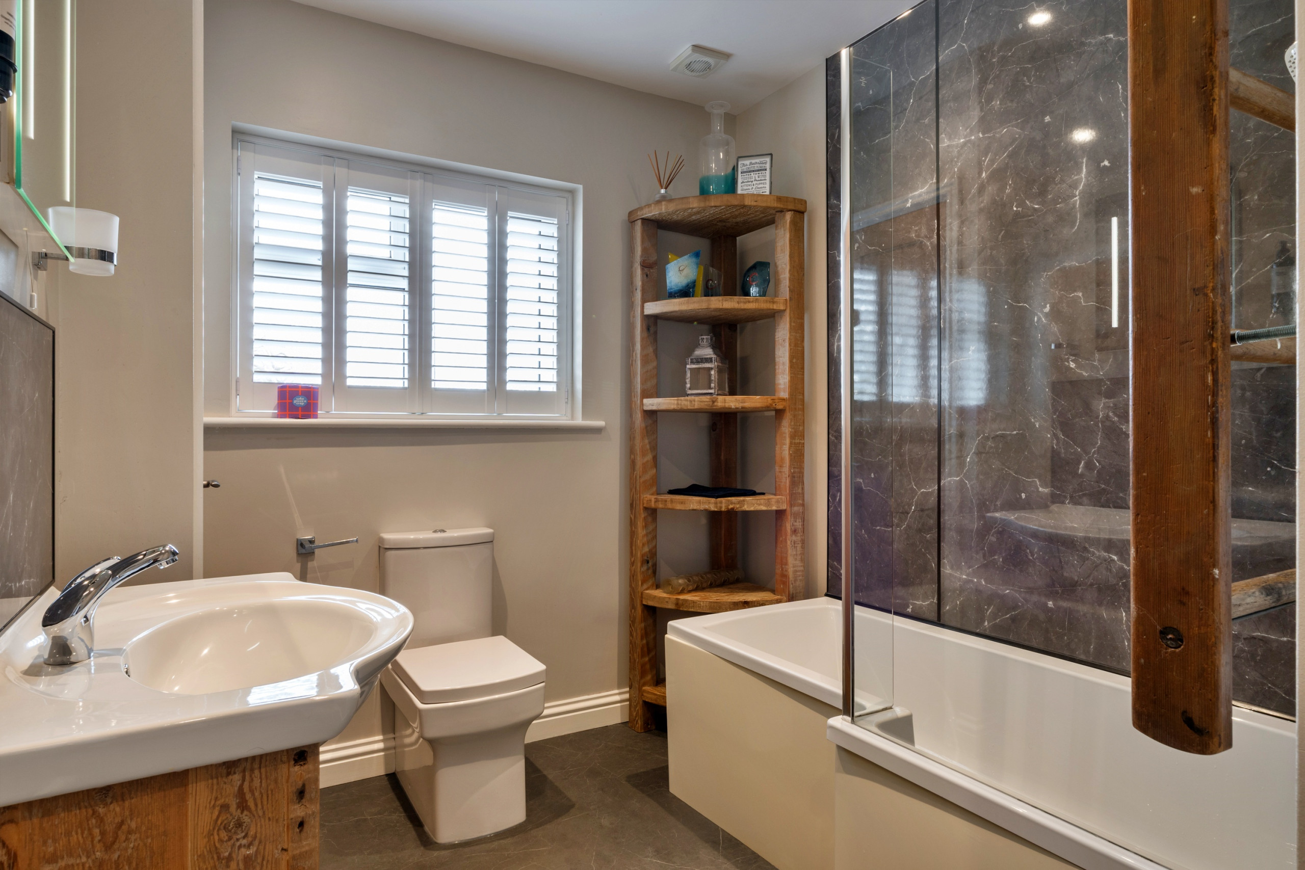 The modern, well-equipped kitchen includes an electric oven and hob, combination convection/grill/microwave oven, fridge/freezer, and dishwasher. Prefer to dine in? Pick some fresh herbs from the garden and create something special. A separate utility room offers extra convenience with a washing machine, sink, and storage cupboards stocked with supplies for your four-legged friends — including dog towels, bowls, poo bags, and spare bedding.