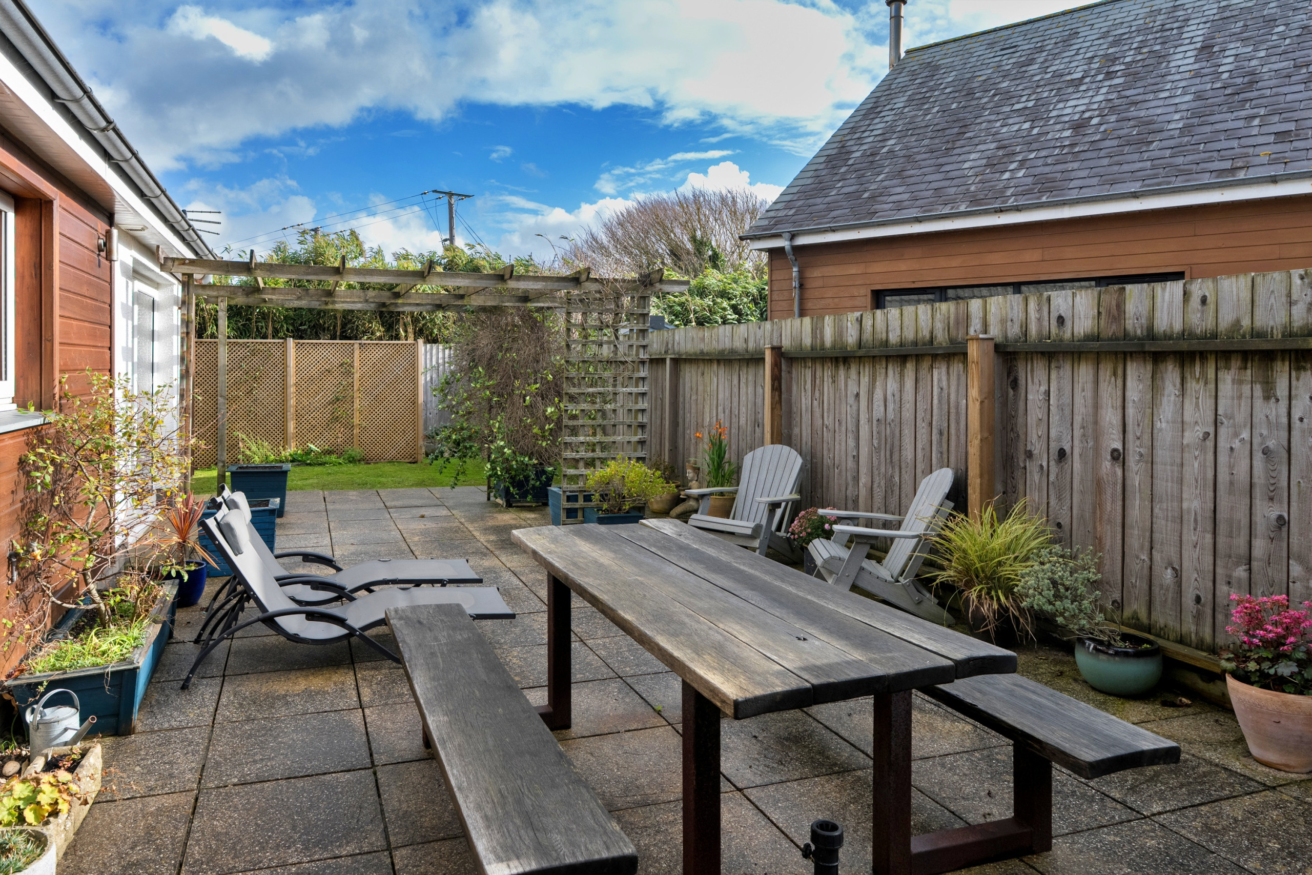 The heart of the home is the open-plan kitchen, lounge, and dining area — a wonderful social space where families can relax and enjoy time together. Large sliding patio doors open onto a fully enclosed wrap-around garden, complete with a patio for alfresco dining and barbecues, and a lawned area perfect for play. Two lockable gates and 5–6ft fencing around the perimeter provide a safe and secure space for toddlers and dogs alike. For younger guests, Gwelmor provides thoughtful touches such as a travel cot, high chair, child-friendly plates, bowls, beakers, and cutlery, plus a selection of soft toys, books, and games.