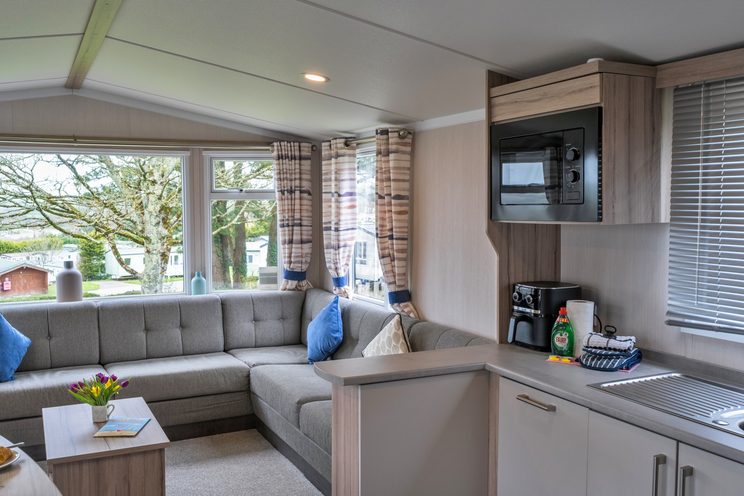Inside, the lodge features a bright and sociable open-plan living, kitchen, and dining area, thoughtfully designed for spending quality time together. The comfortable lounge provides plenty of seating for everyone to relax after a day out, while the dining space is perfect for shared meals. The well-equipped kitchen includes a dishwasher, full-size fridge freezer, kettle, microwave, and toaster, giving you everything you need for a convenient self-catering stay. Outside, the lodge benefits from its own decking/patio area complete with garden furniture, providing a peaceful spot to enjoy your morning coffee or relax in the evening after a day of exploring.
