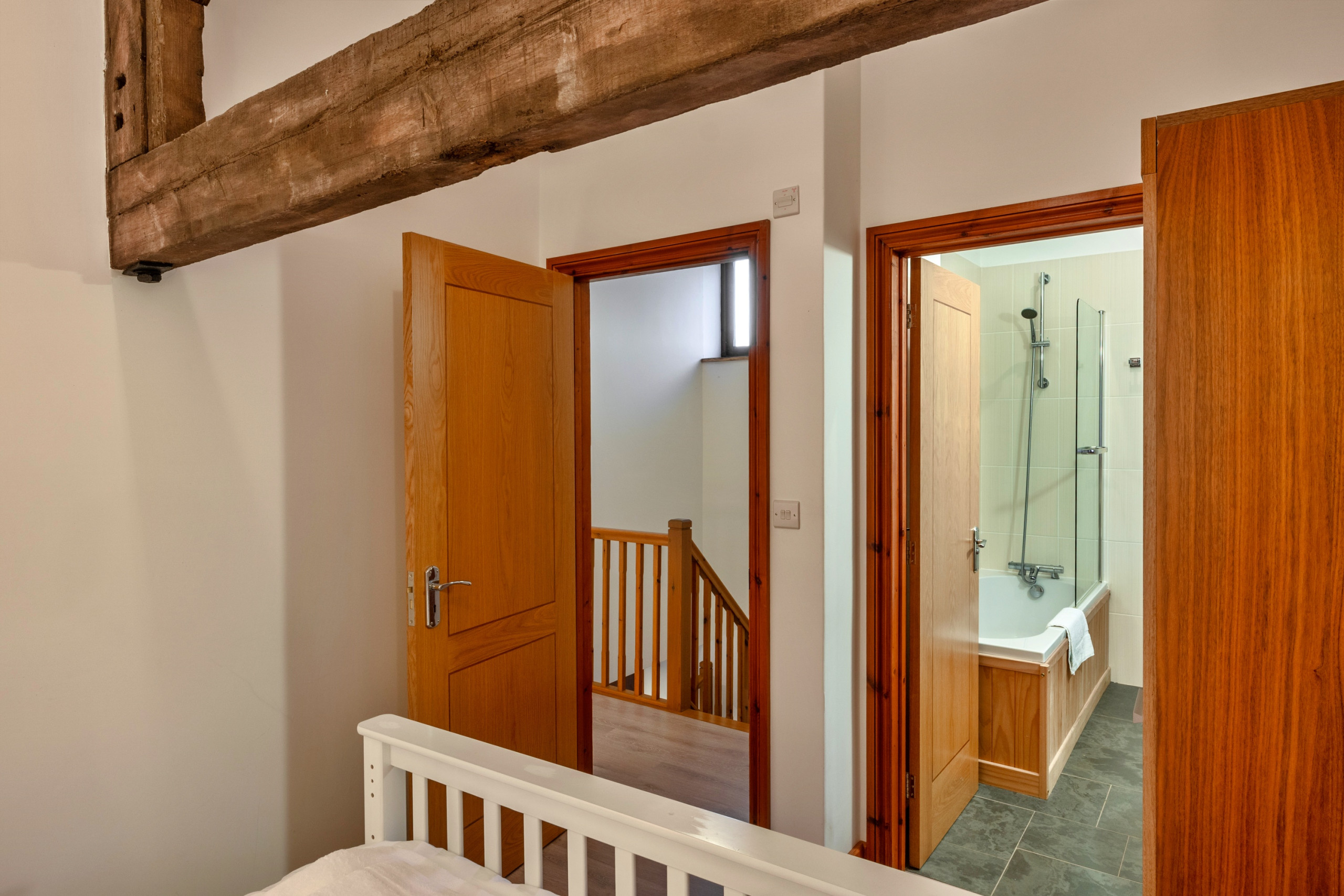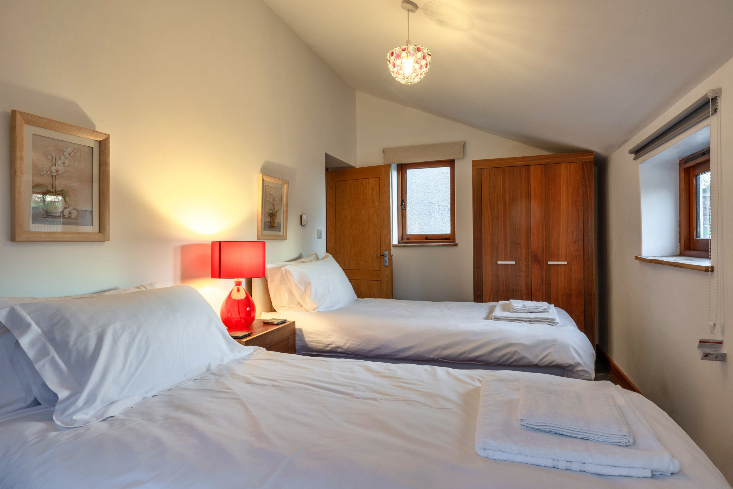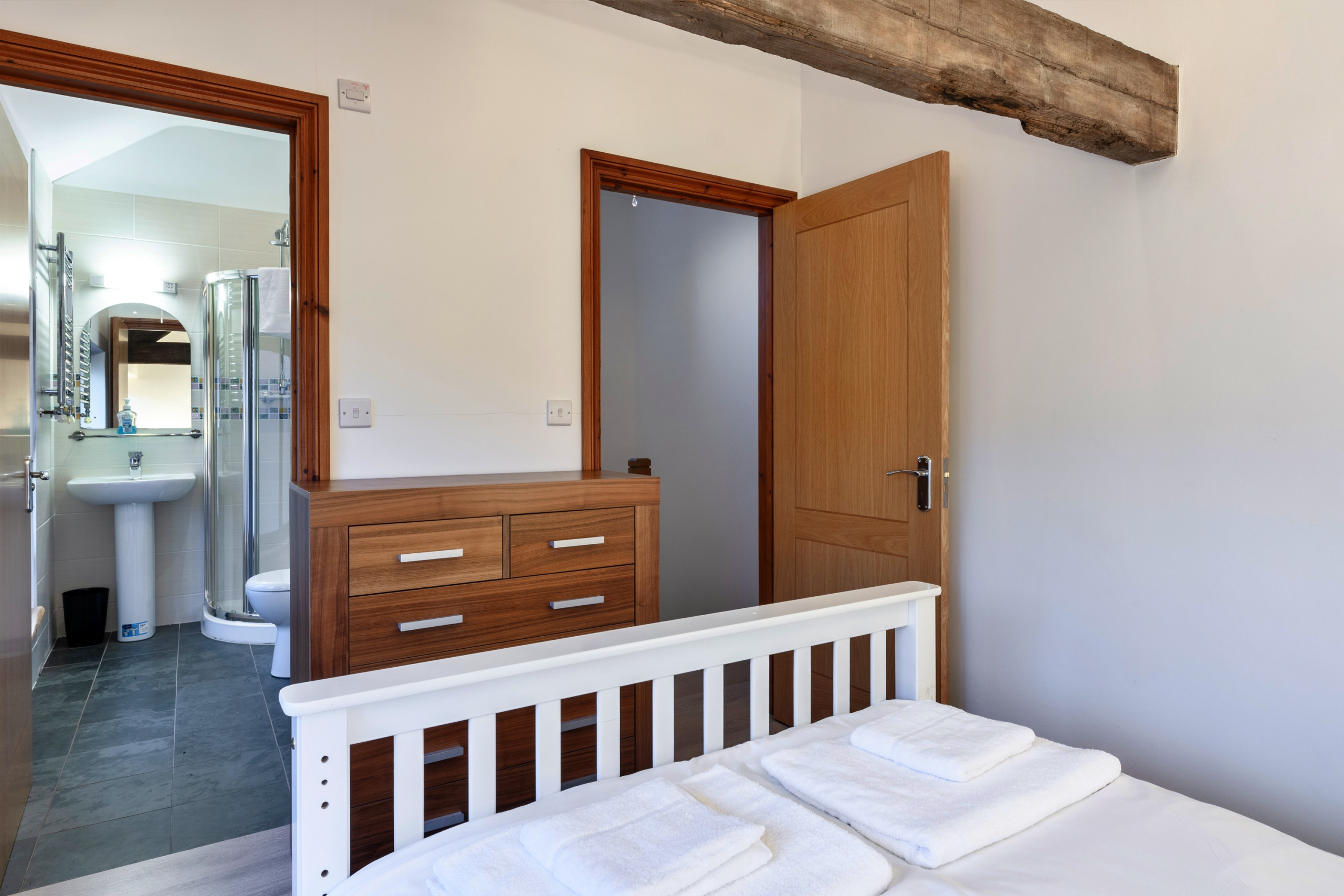 Ivy Cottage offers three bedrooms, each with its own en-suite facilities. On the ground floor is a twin room with a walk-in shower, basin and WC—well suited for children or friends. Upstairs are two double bedrooms: one with an en-suite walk-in shower, and the other with an en-suite bathroom featuring a bath with a shower over, providing flexibility for different preferences.