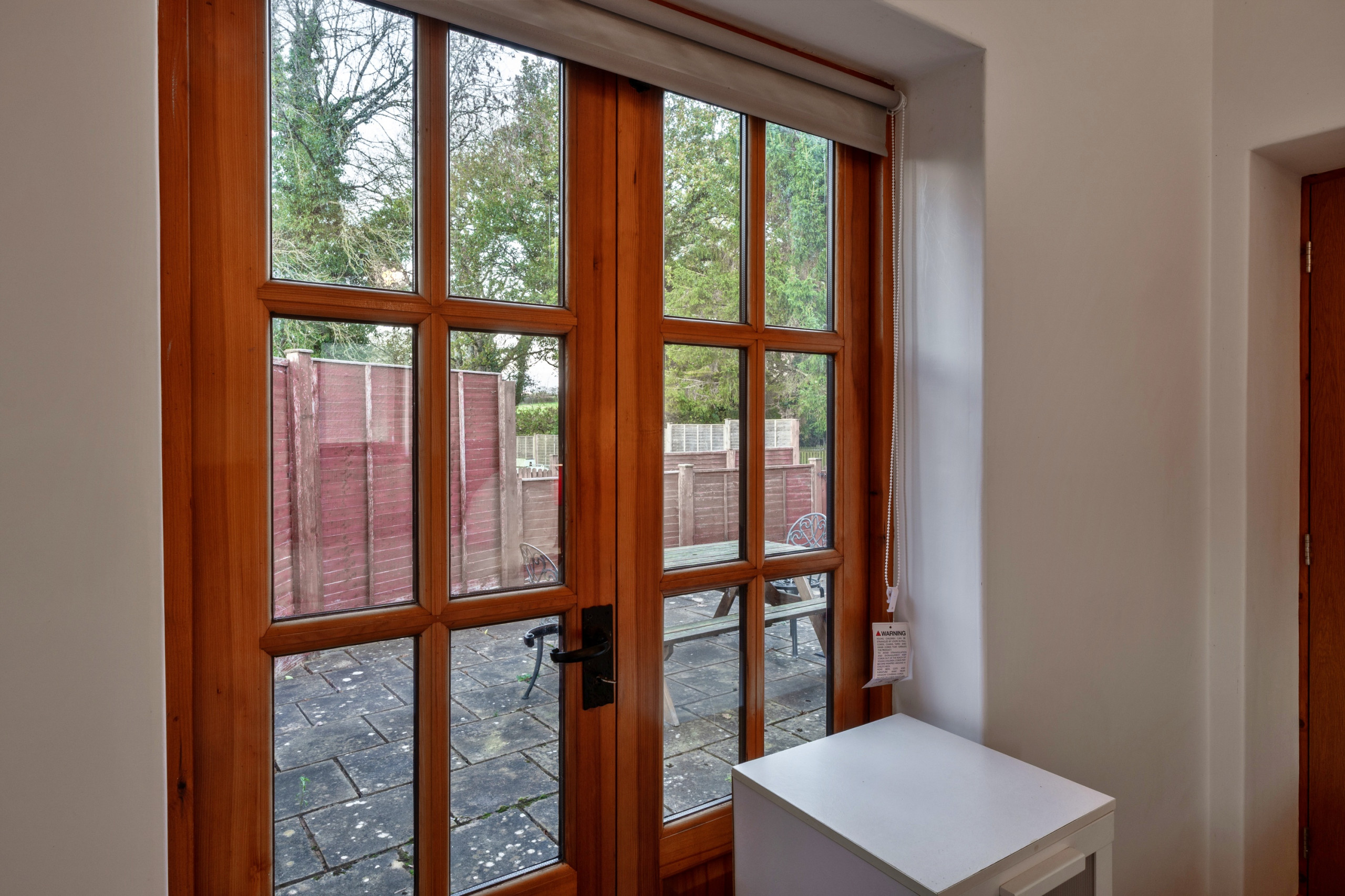 Outside, the enclosed rear patio includes outdoor furniture and a barbecue, making it a pleasant spot for alfresco dining or relaxing outdoors while enjoying the peaceful countryside setting.