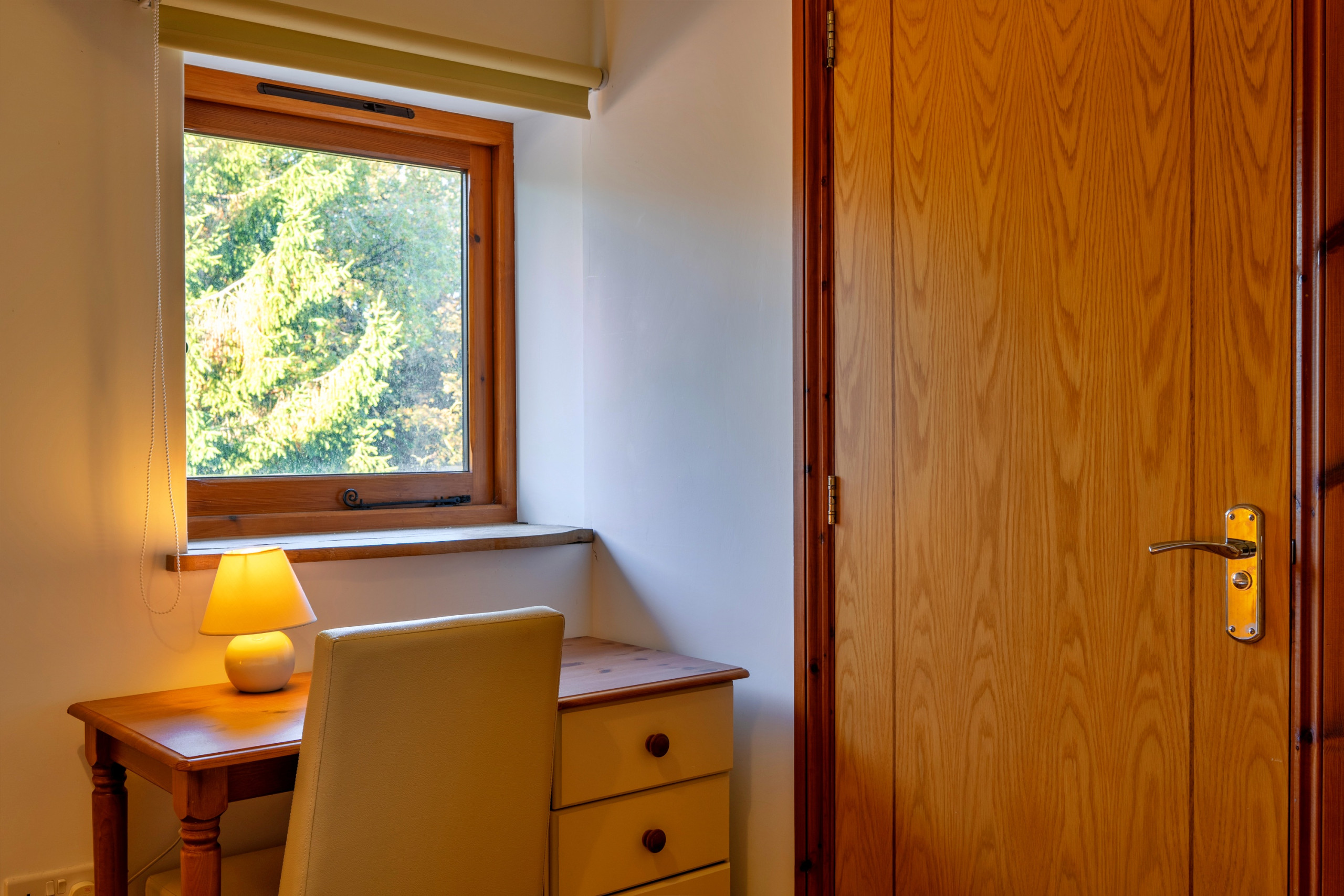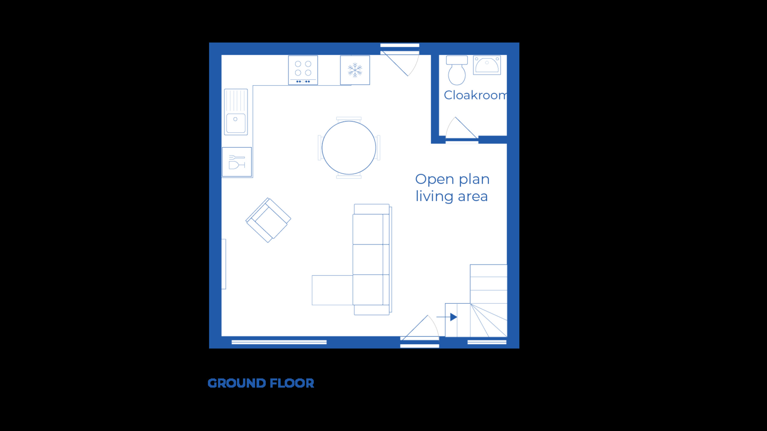 The open-plan living area welcomes you with high ceilings, exposed timber and underfloor heating. Relax on the seating and enjoy the Smart TV while meals are prepared in the well-equipped kitchen, which includes an electric oven, microwave, fridge/freezer, dishwasher, washing machine and coffee maker. The dining area seats five, making it a practical space for shared meals. A cloakroom with a basin and WC completes the ground floor.