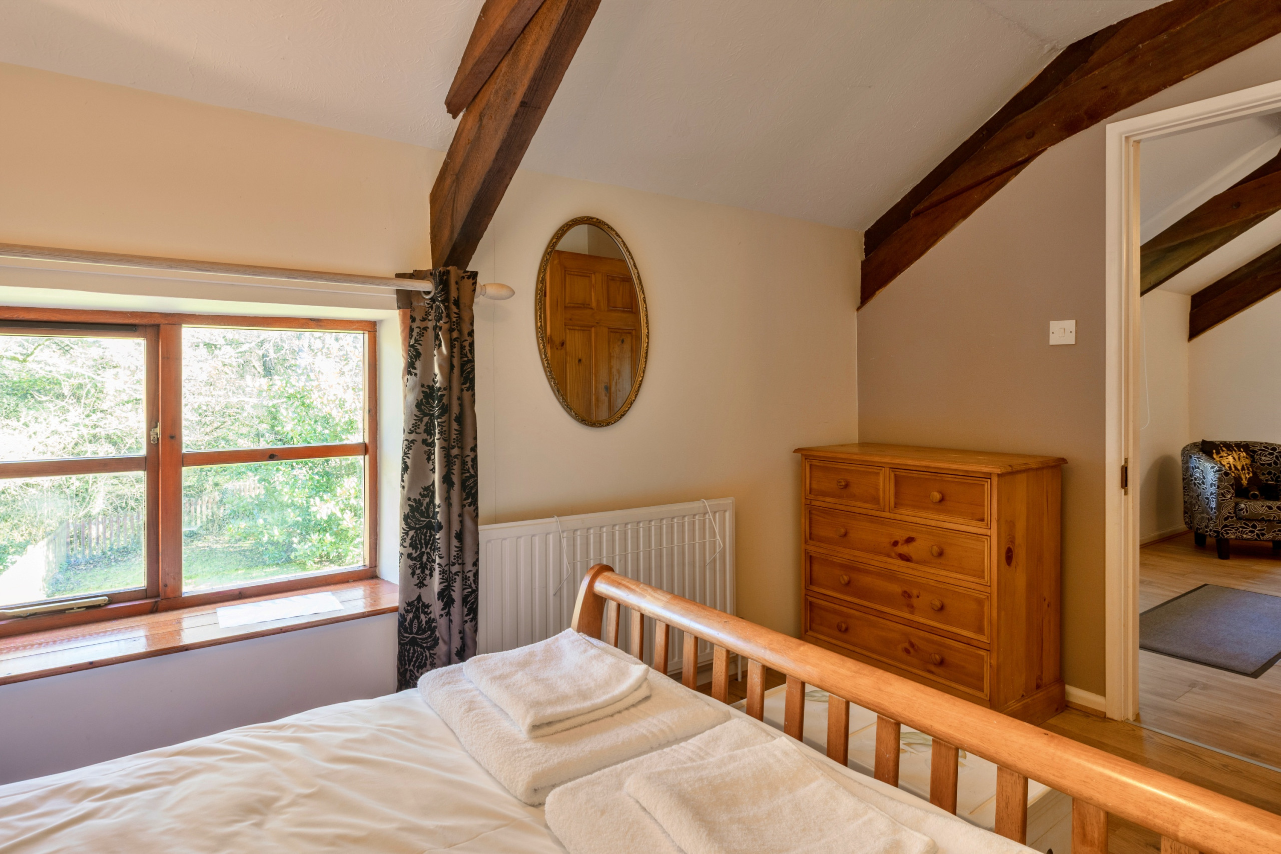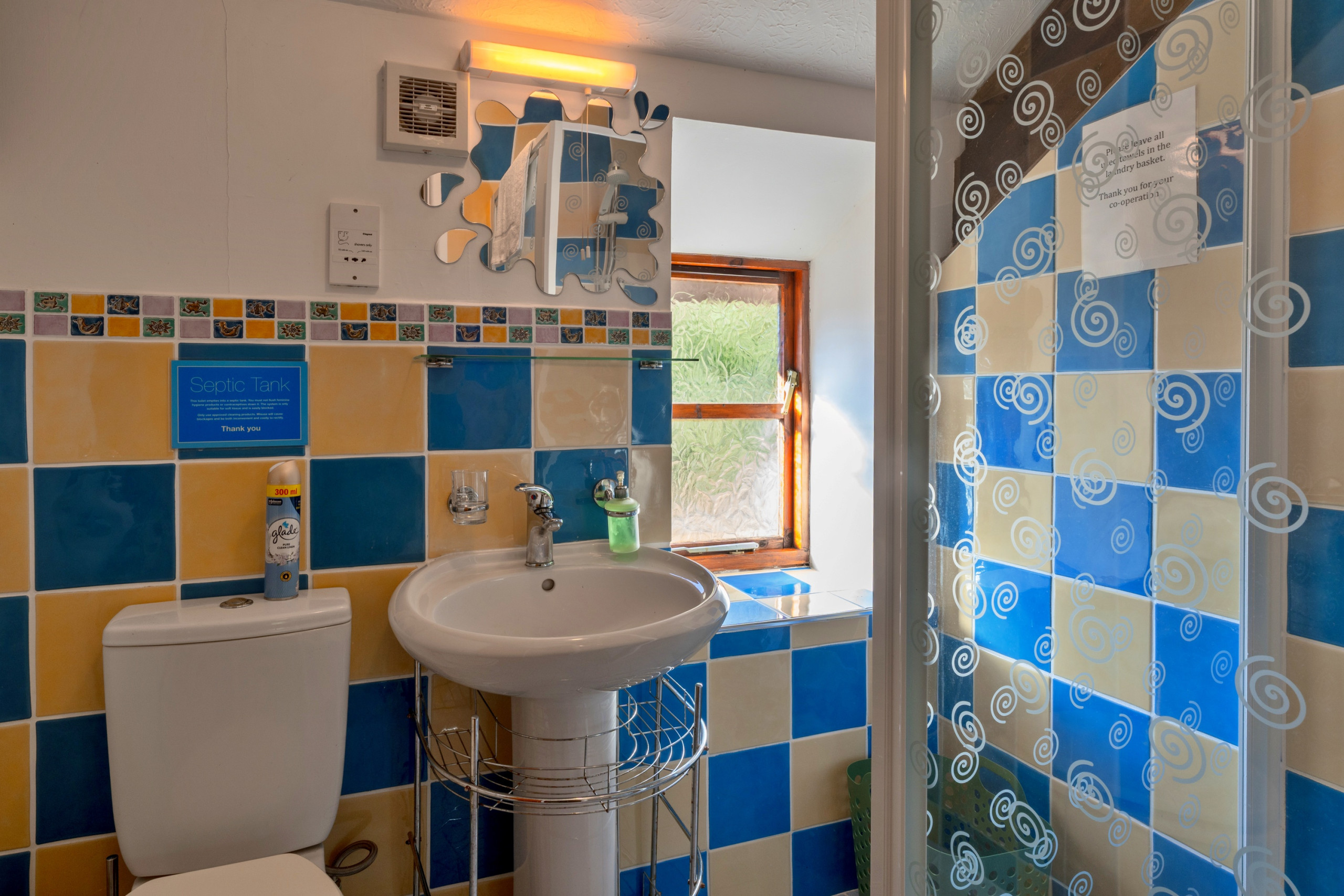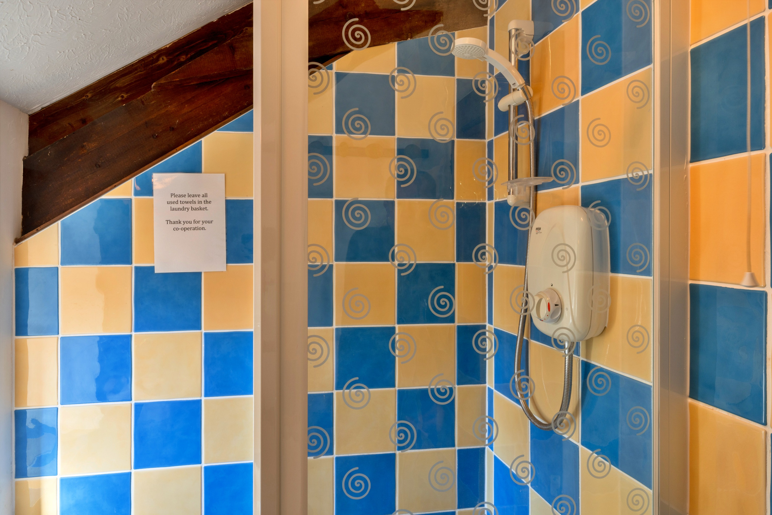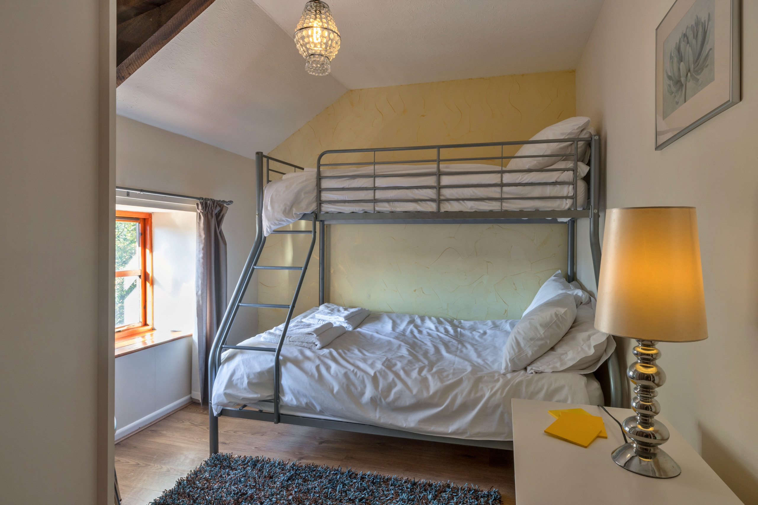 Upstairs, the cottage offers flexible sleeping arrangements across four bedrooms: one double room, two twin rooms, and a room with an adult bunk bed featuring a double below and single above. Two shower rooms, each with a walk-in shower, basin and WC, serve the bedrooms and ensure convenient facilities for all guests.