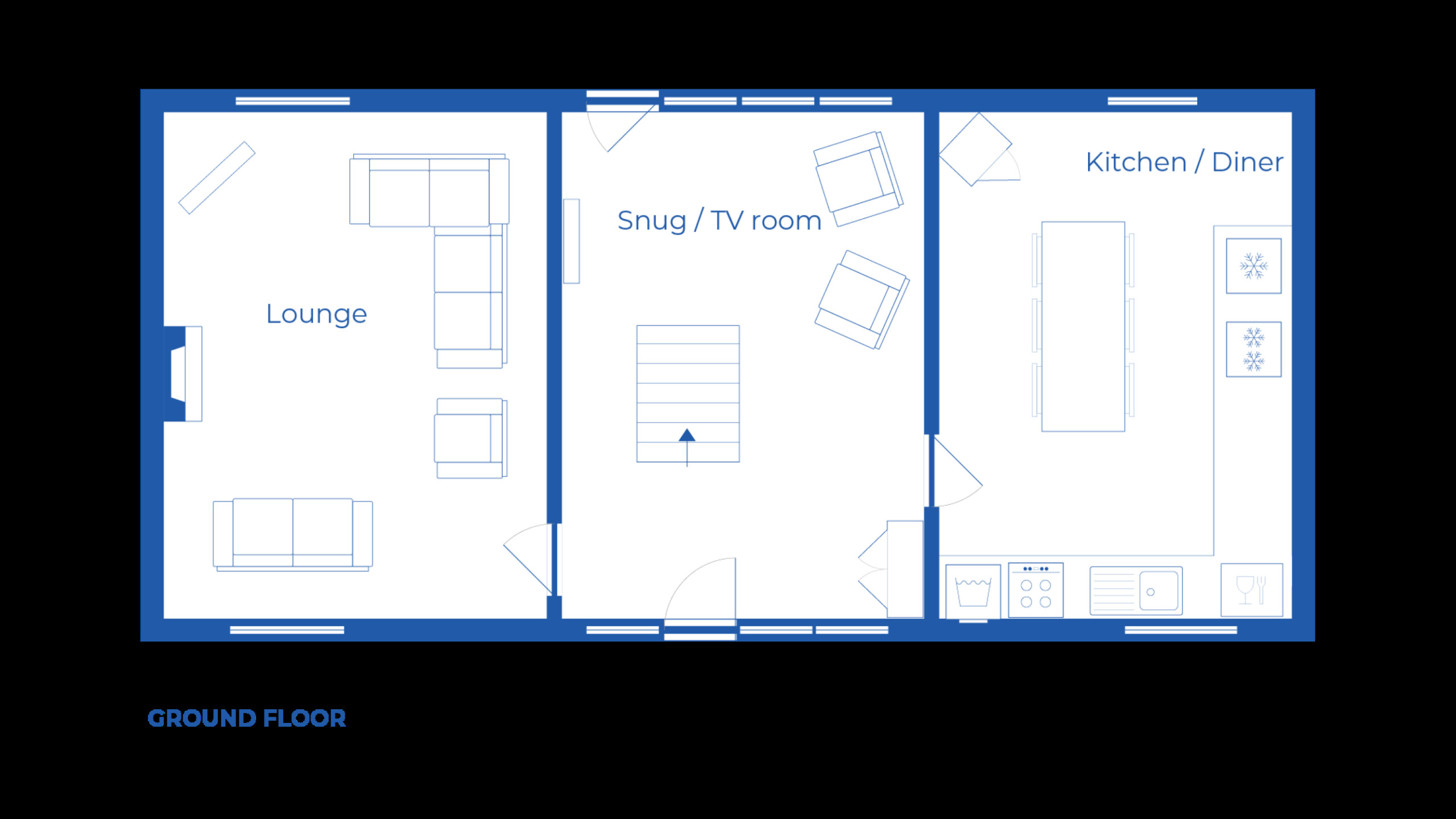 Inside, the main lounge provides plenty of seating, a large Smart TV and an open-fire set within an impressive fireplace that forms the centre of the room. The farmhouse-style kitchen is a practical and sociable space with a large dining table suitable for group meals. A separate snug provides an additional seating area and opens directly onto the enclosed rear garden.