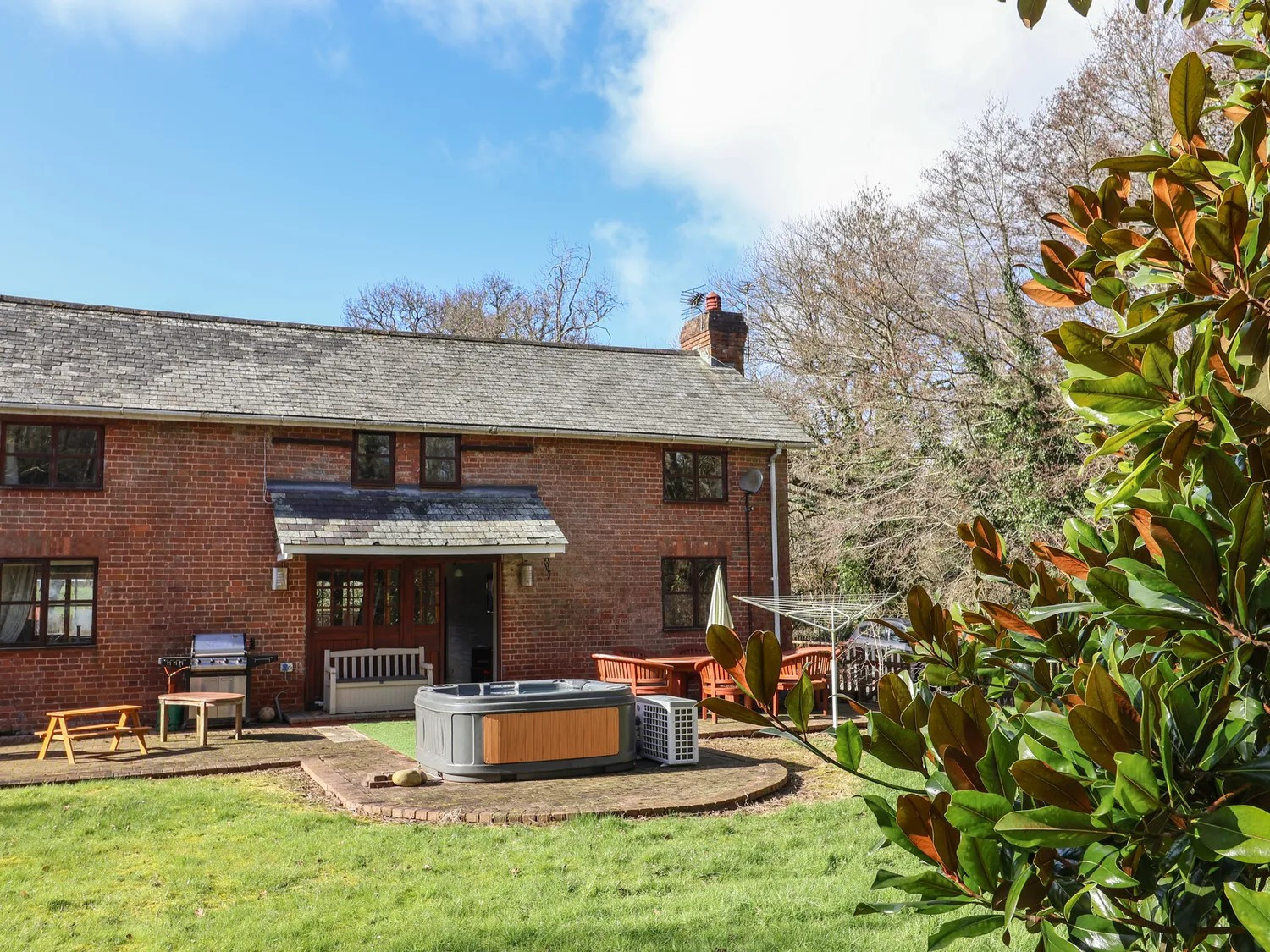Mill Cottage is a spacious four-bedroom property set on Great Houndbeare Farm, on the edge of the village of Aylesbeare in East Devon. Surrounded by 100 acres of woodland and farmland, it accommodates up to nine guests and welcomes two well-behaved dogs. Ideal for families or groups, the detached cottage offers a private garden with a hot tub and barbecue, as well as access to a communal games room, children’s play area and ample on-site parking.