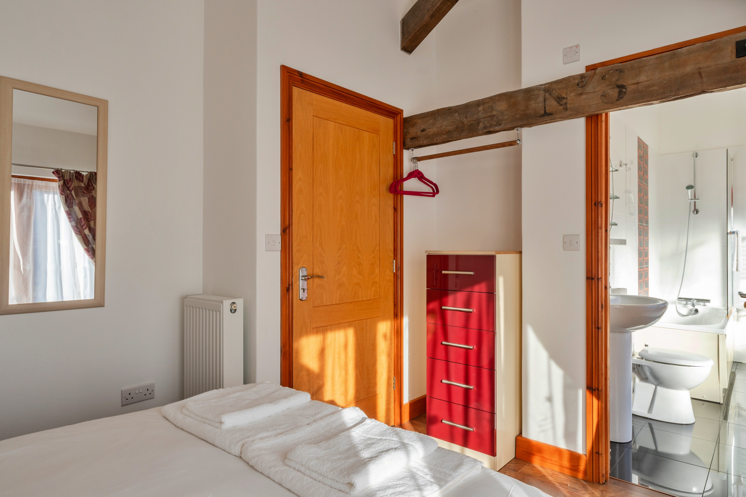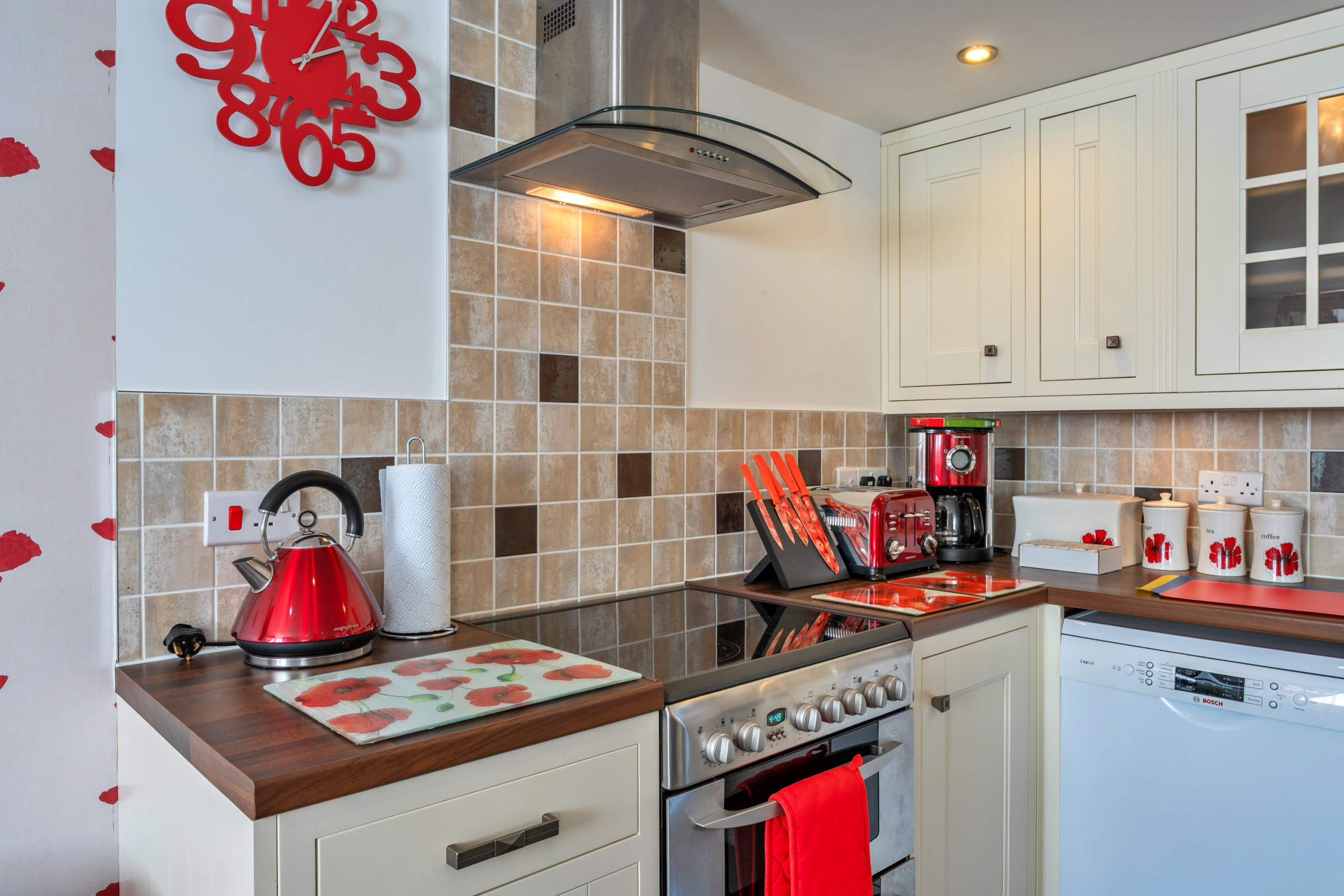 Inside, an open-plan living area with underfloor heating and exposed beams welcomes you in. After a day exploring, settle on the seating to watch the Smart TV or gather at the dining table for six. The kitchen is equipped with an electric oven, microwave, fridge/freezer, dishwasher, washing machine and coffee maker, giving you everything needed for a self-catering stay. A cloakroom with a basin and WC completes the ground floor.