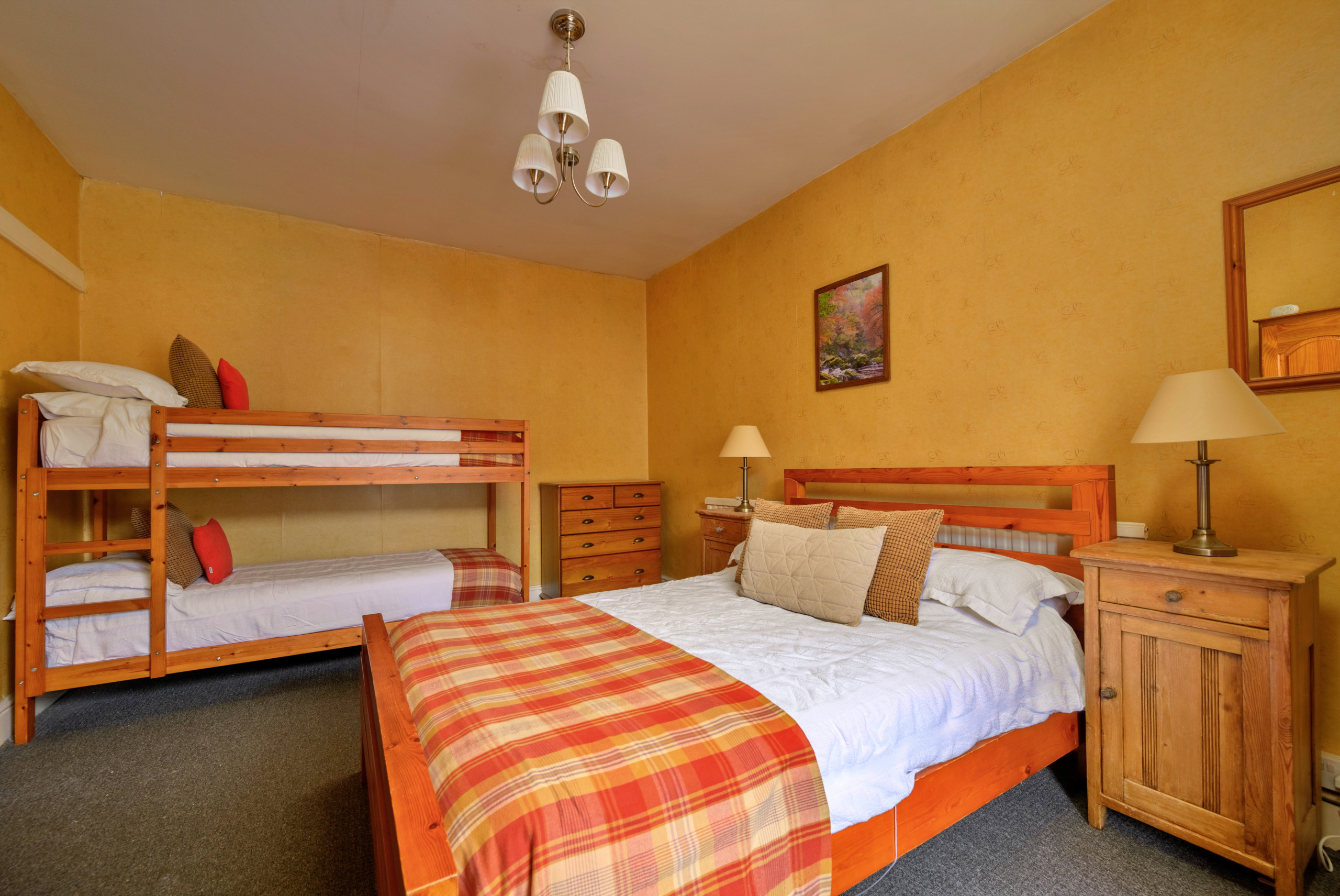 Upstairs are two bedrooms: a family room with a double and bunk bed, and a second room with a double bed. The shower room provides a practical space to start your day before heading across the road to the village shop for breakfast supplies.