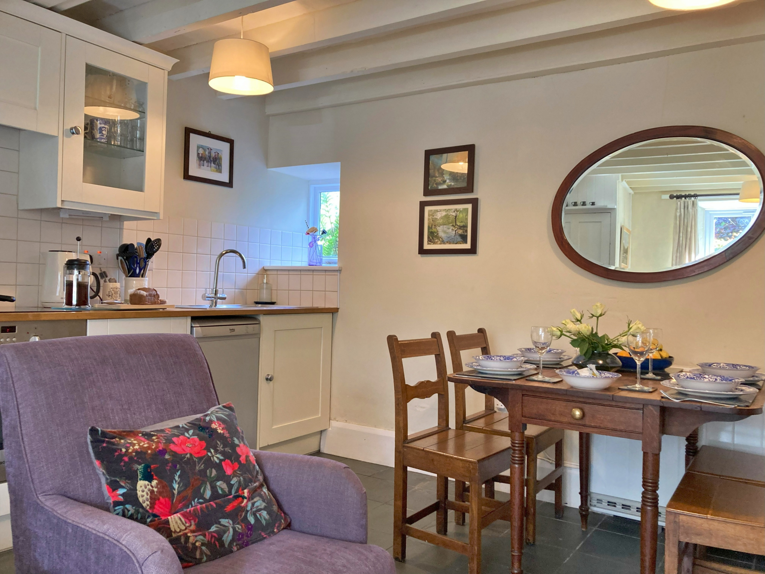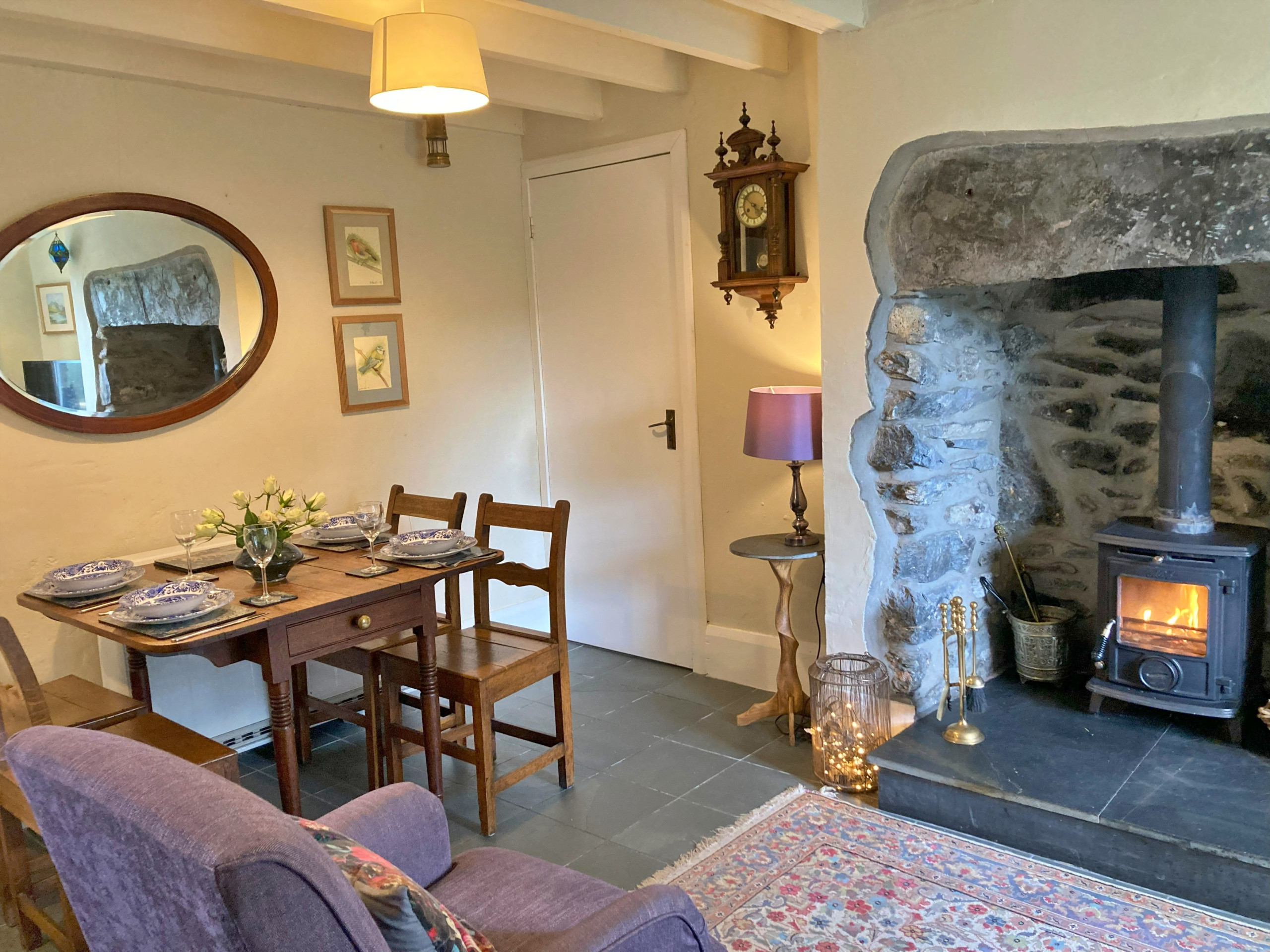 Inside, the cottage blends traditional features with modern comforts. The open-plan living space includes a fitted kitchen and a cosy inglenook fireplace with a multi-fuel stove, ideal for relaxing after a day of exploring. Electric storage heating keeps the cottage warm, while a smart TV, games and books provide entertainment for quieter evenings. The kitchen is well equipped with an electric oven and hob, microwave, fridge with freezer compartment and dishwasher. The property has two bedrooms, one double and one twin, along with a bathroom with shower.