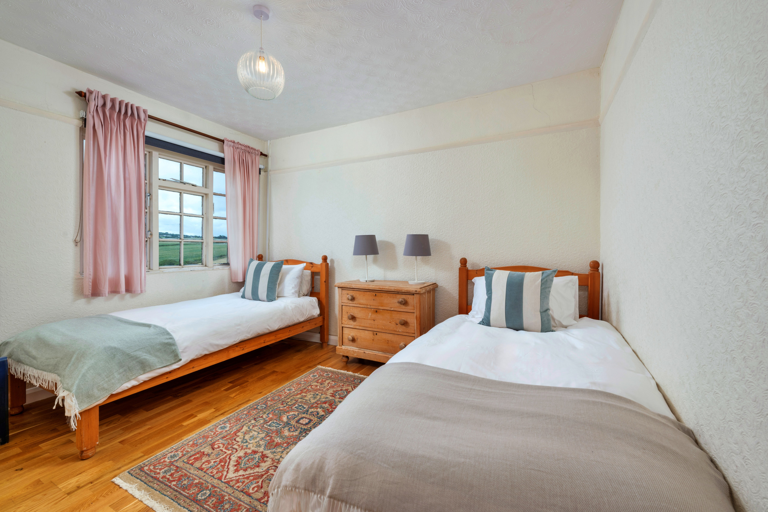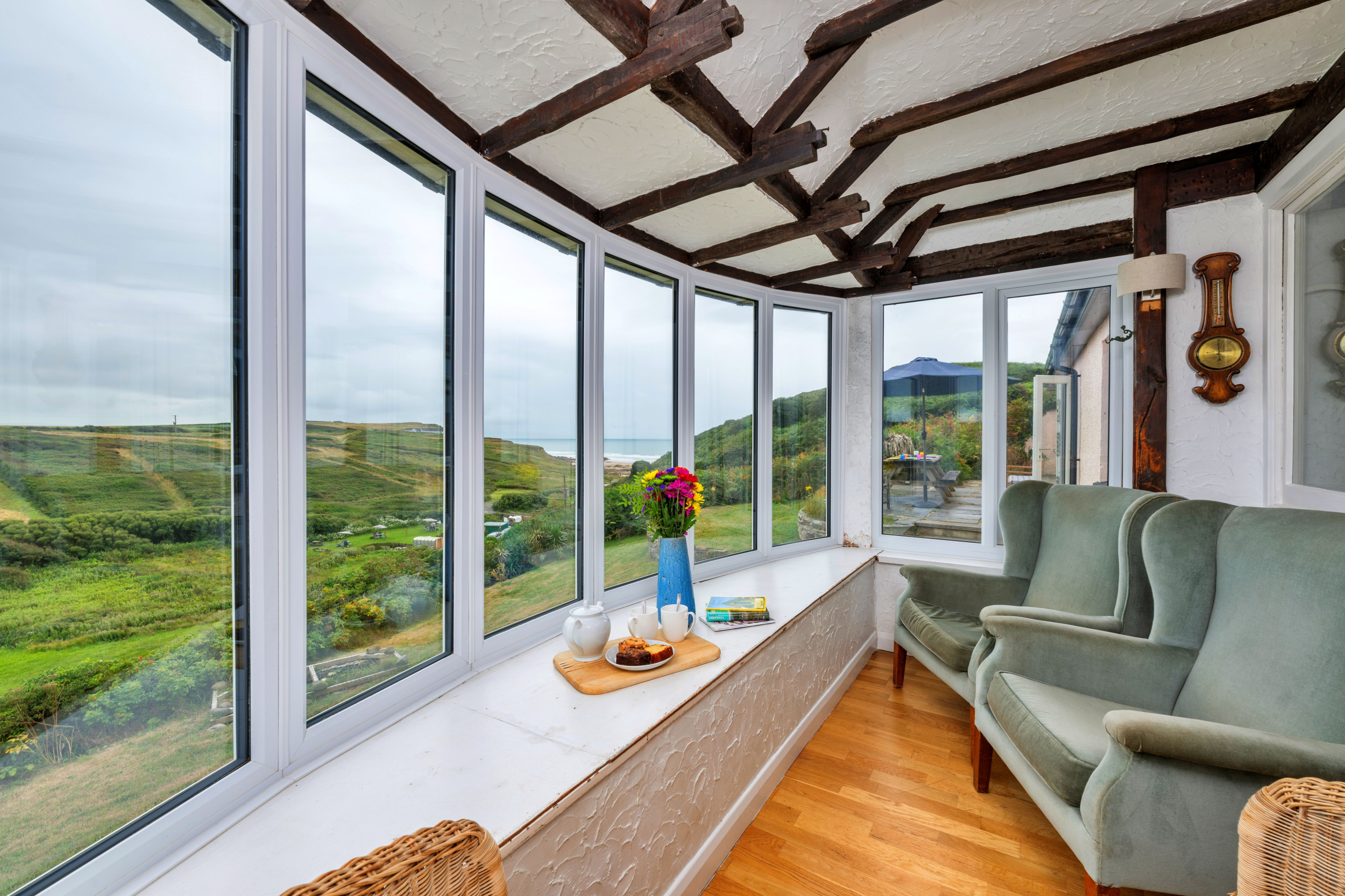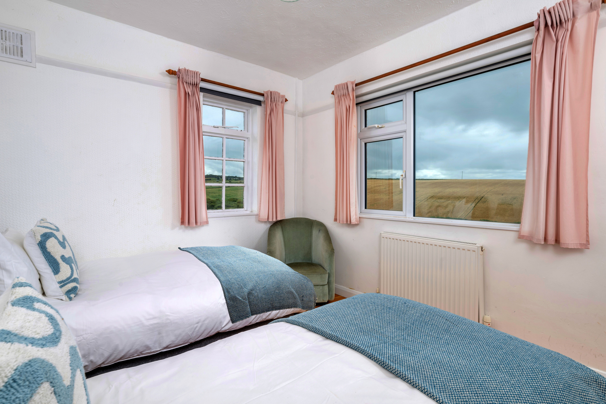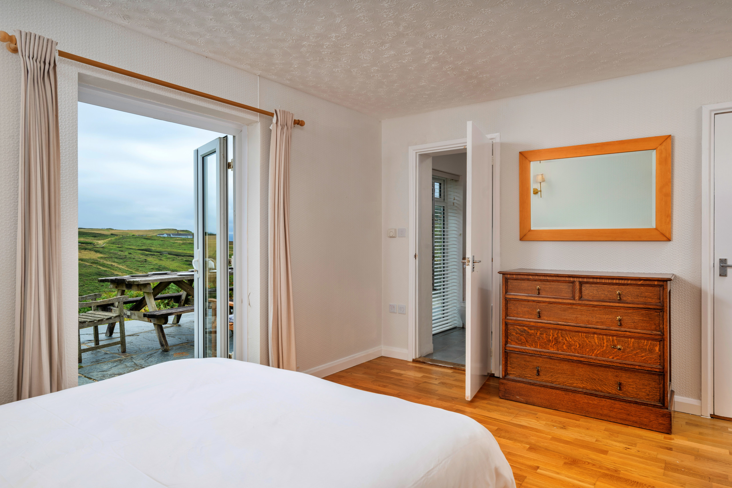 Set on one level, the house has one king bedroom, with en-suite and three twin rooms. The ensuite includes a walk-in shower, while the main bathroom features a bath with a shower over. The kitchen is equipped with a dishwasher, fridge/freezer, gas hob, electric oven, washing machine and dryer. The sitting room opens through double doors onto a bay area with wide coastal views and a log burner.