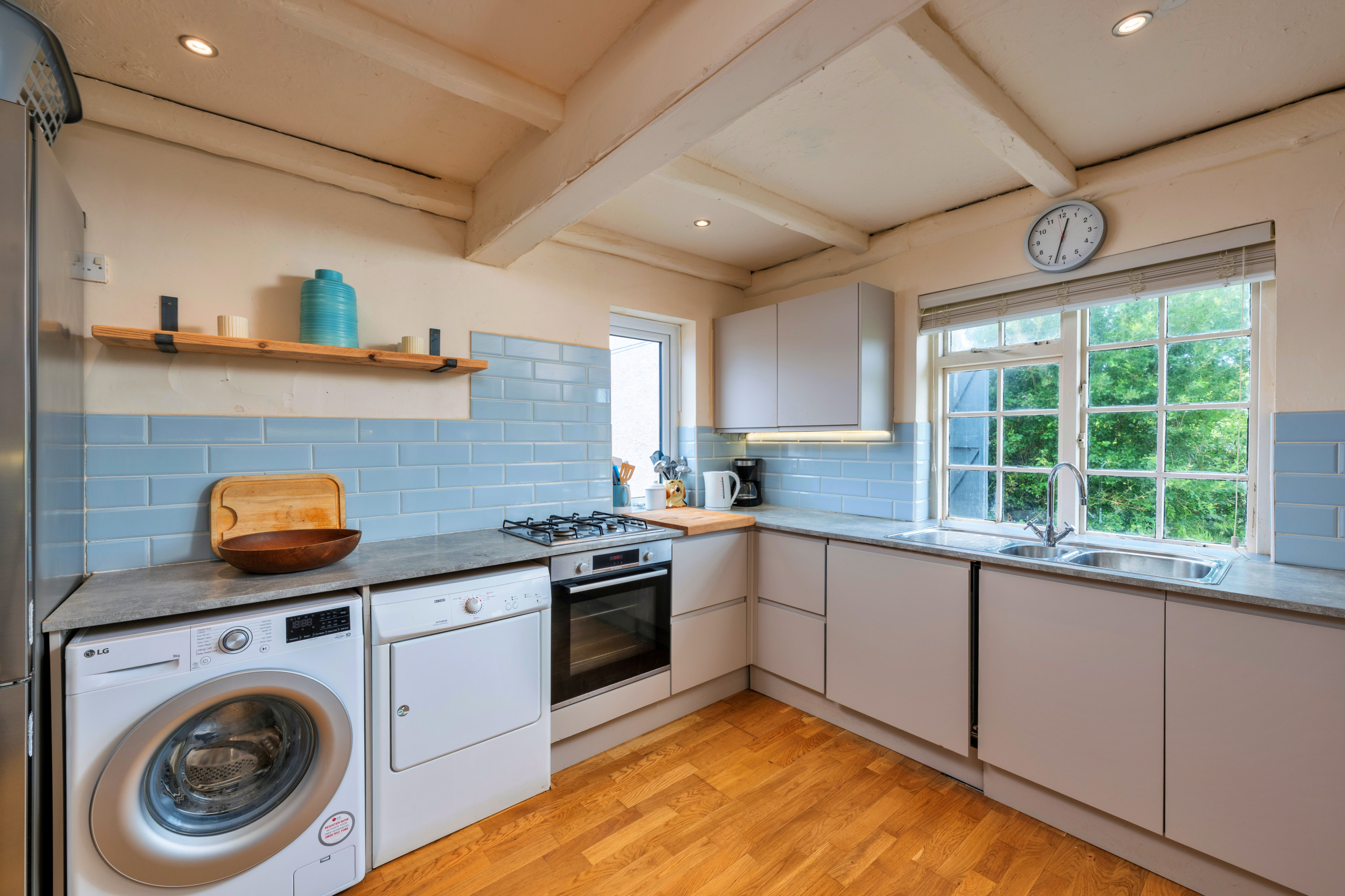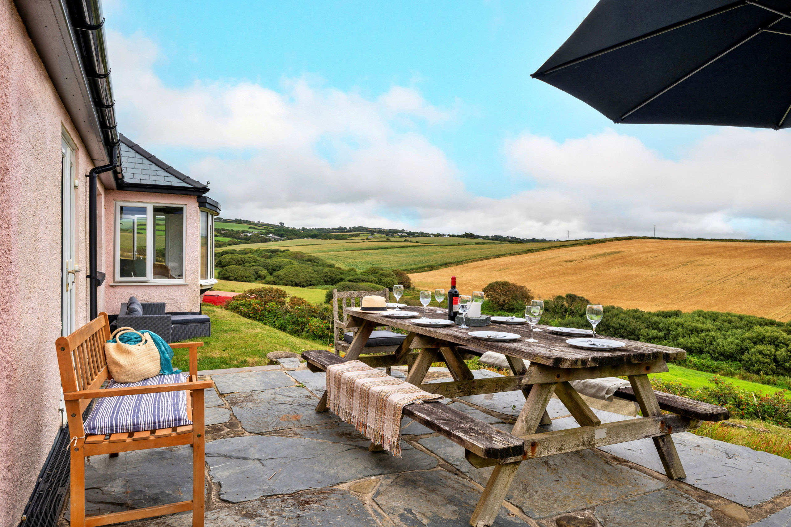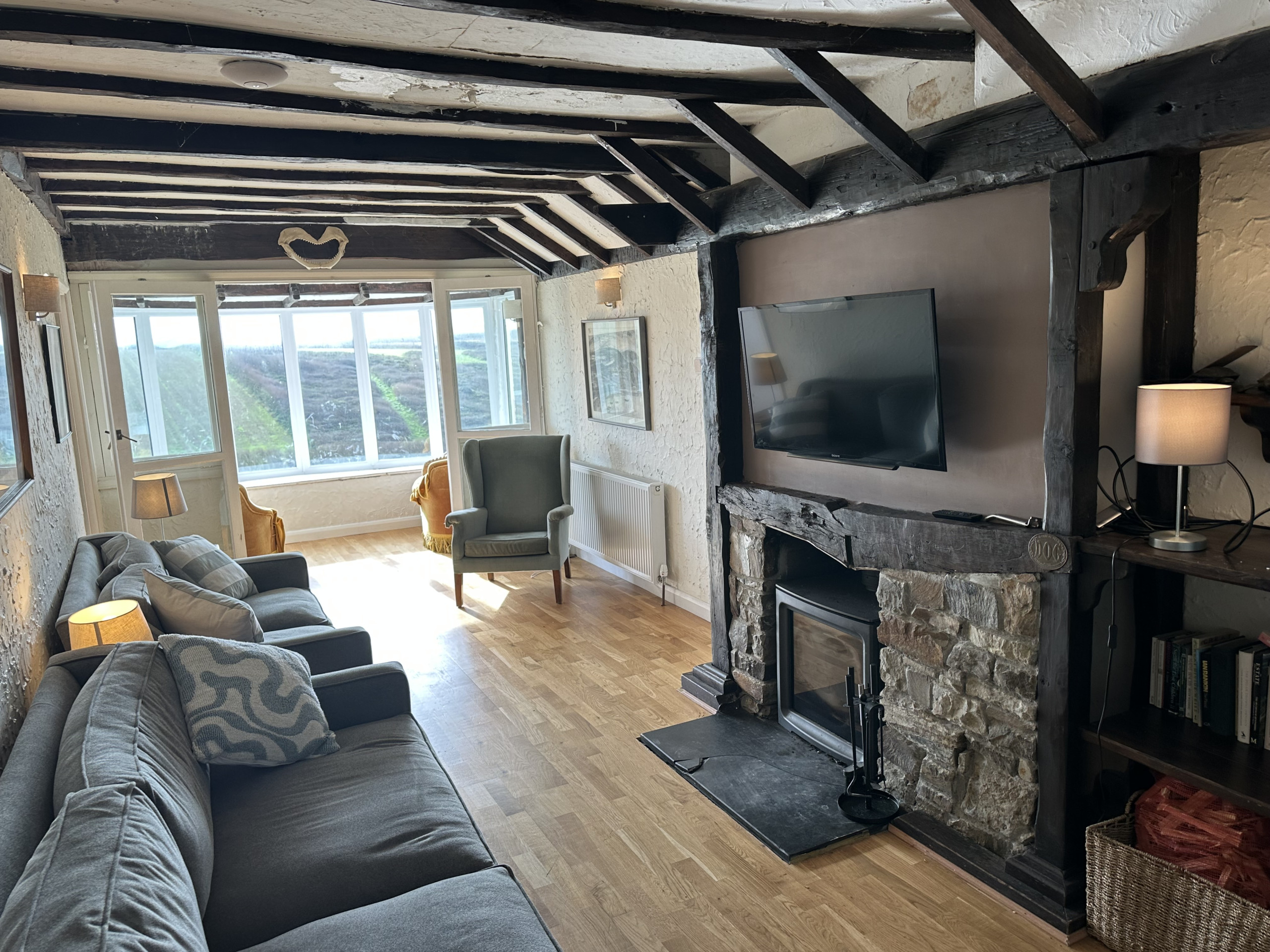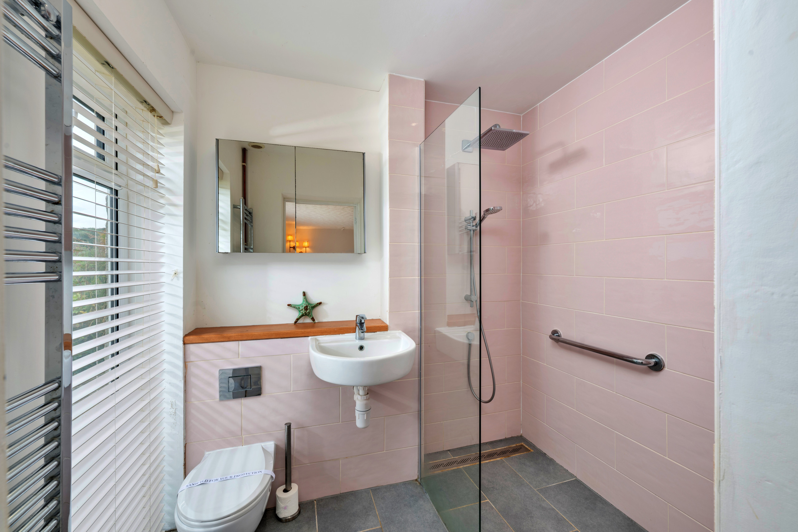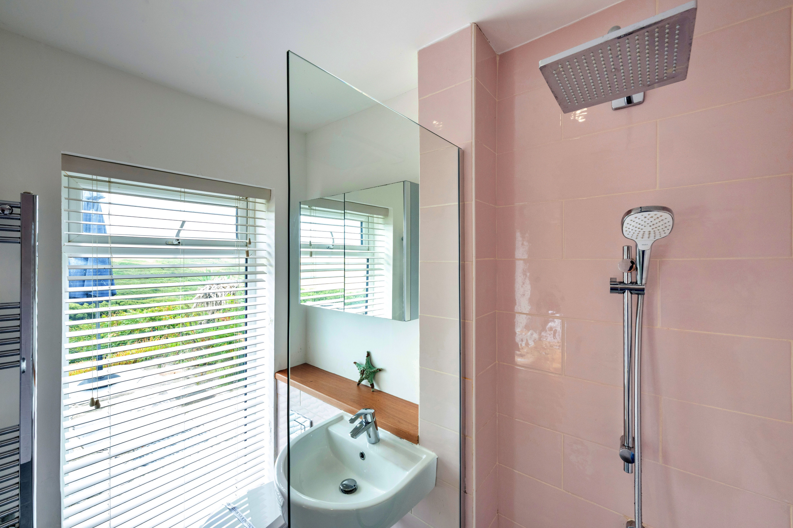 Set on one level, the house has one king bedroom, with en-suite and three twin rooms. The ensuite includes a walk-in shower, while the main bathroom features a bath with a shower over. The kitchen is equipped with a dishwasher, fridge/freezer, gas hob, electric oven, washing machine and dryer. The sitting room opens through double doors onto a bay area with wide coastal views and a log burner.