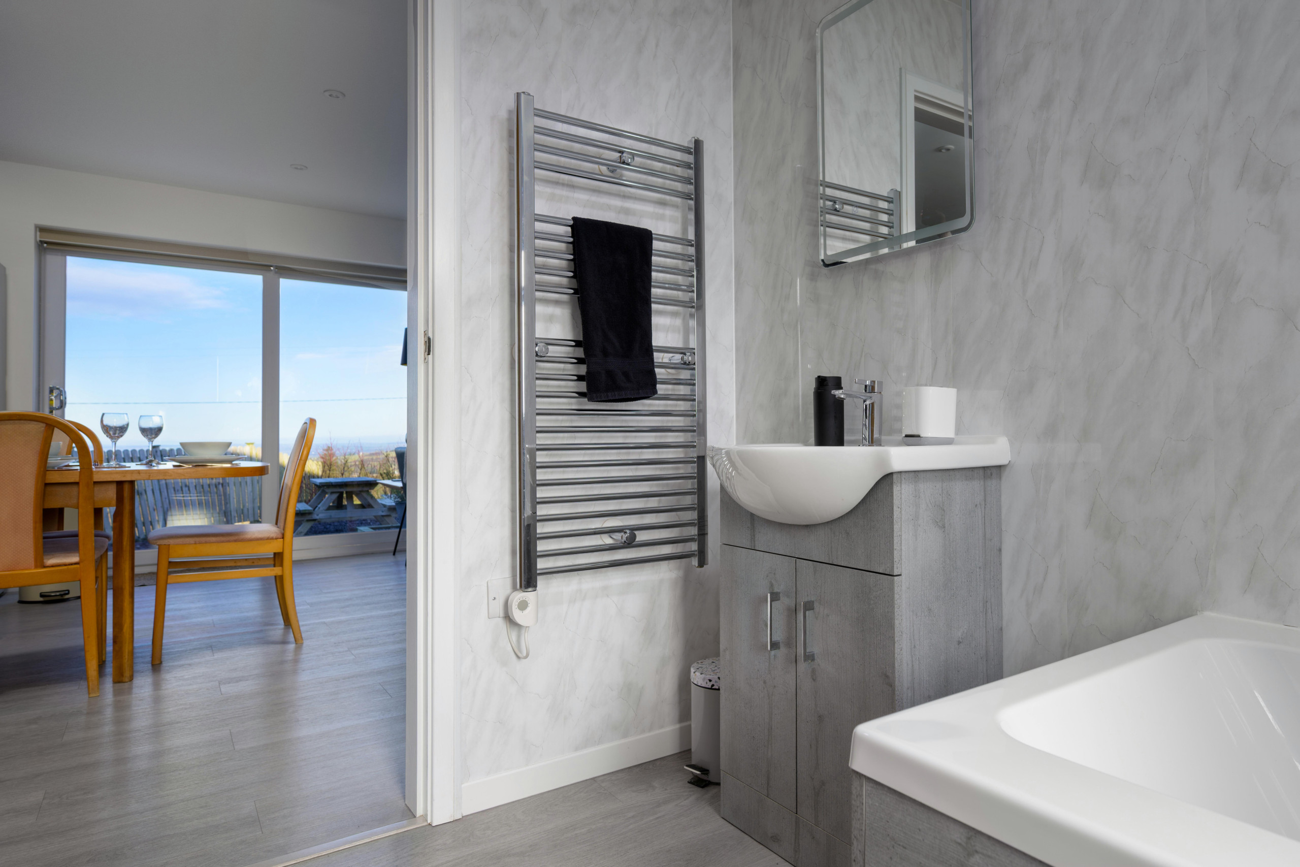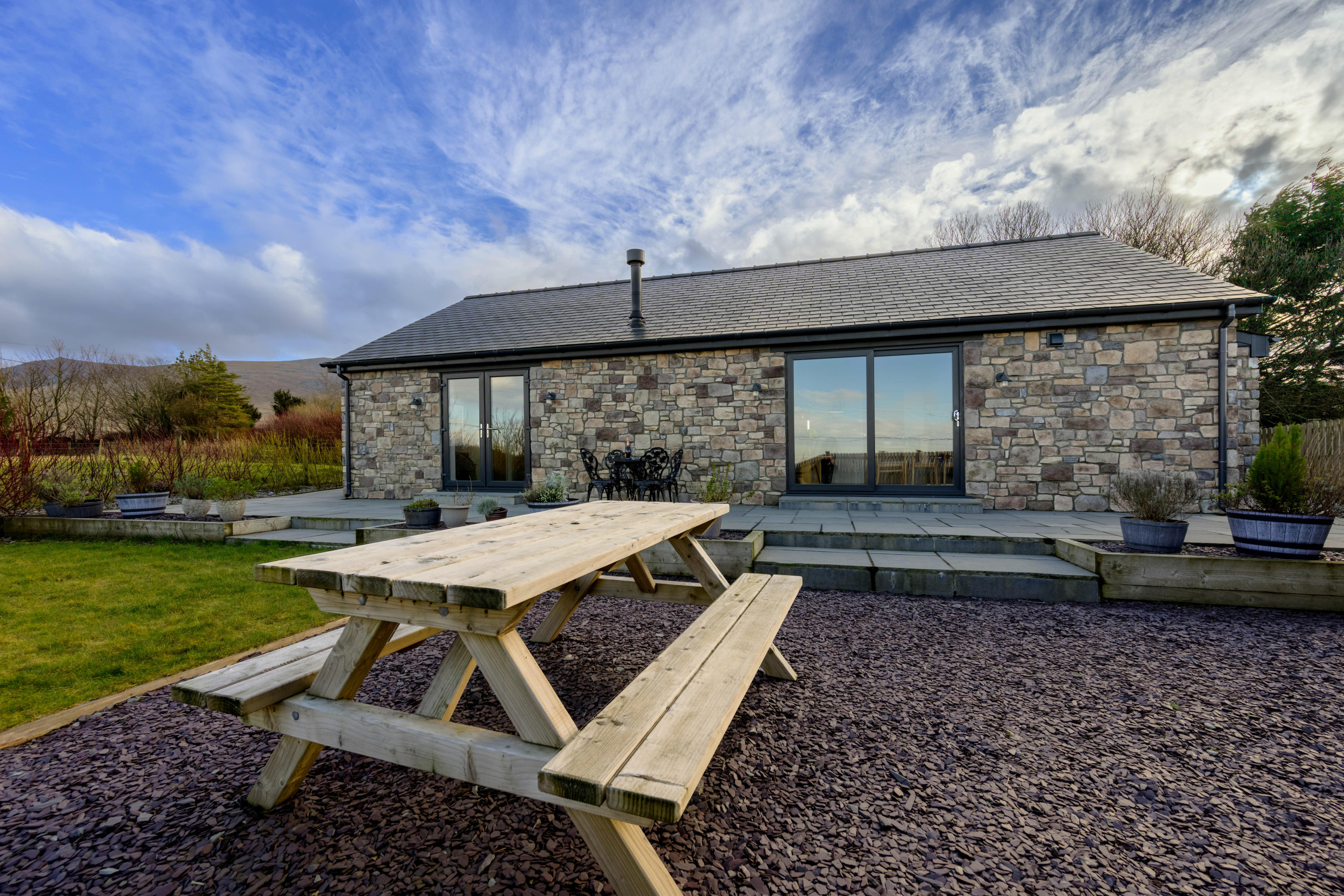The heart of the home is the light filled open-plan living space. Comfortable seating is arranged around a wood burner, perfect for cosy evenings after a day outdoors, while patio doors open directly onto the garden. The dining area sits alongside a well-equipped kitchen with modern appliances, ideal for an easy self-catered getaway. A separate study, complete with a pool table, games and books, provides an ideal space for multi-generational families.