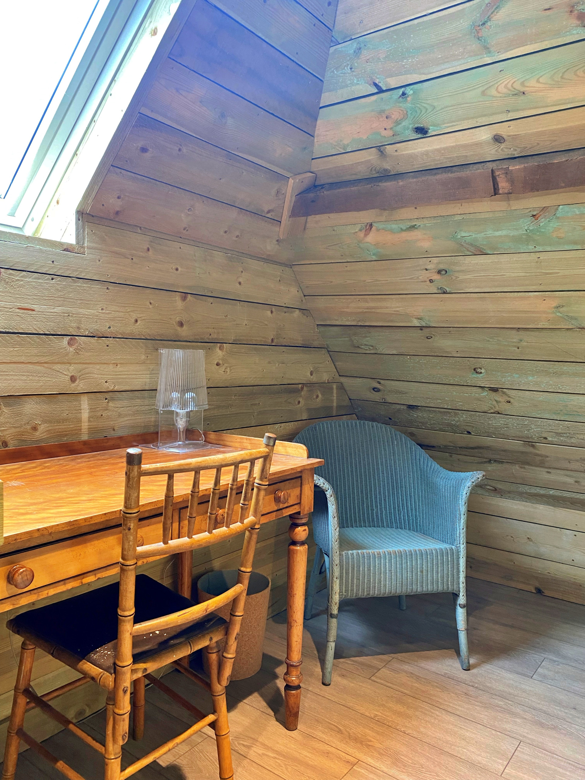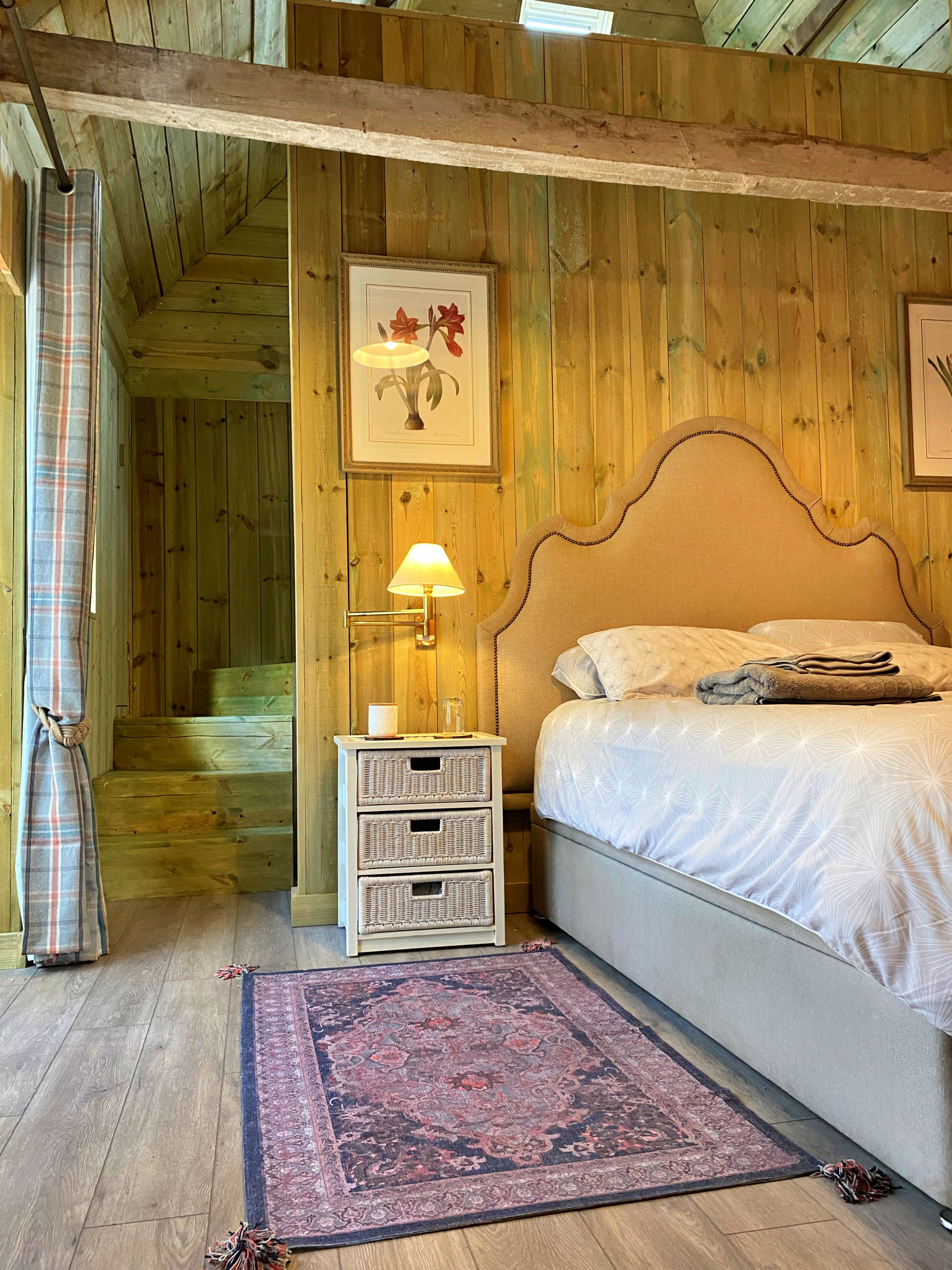 The restful double bedroom also opens onto a shared courtyard through French doors. The contemporary en-suite shower room adds a touch of luxury, while the galleried study area above offers a quiet nook for reading or working during longer stays.