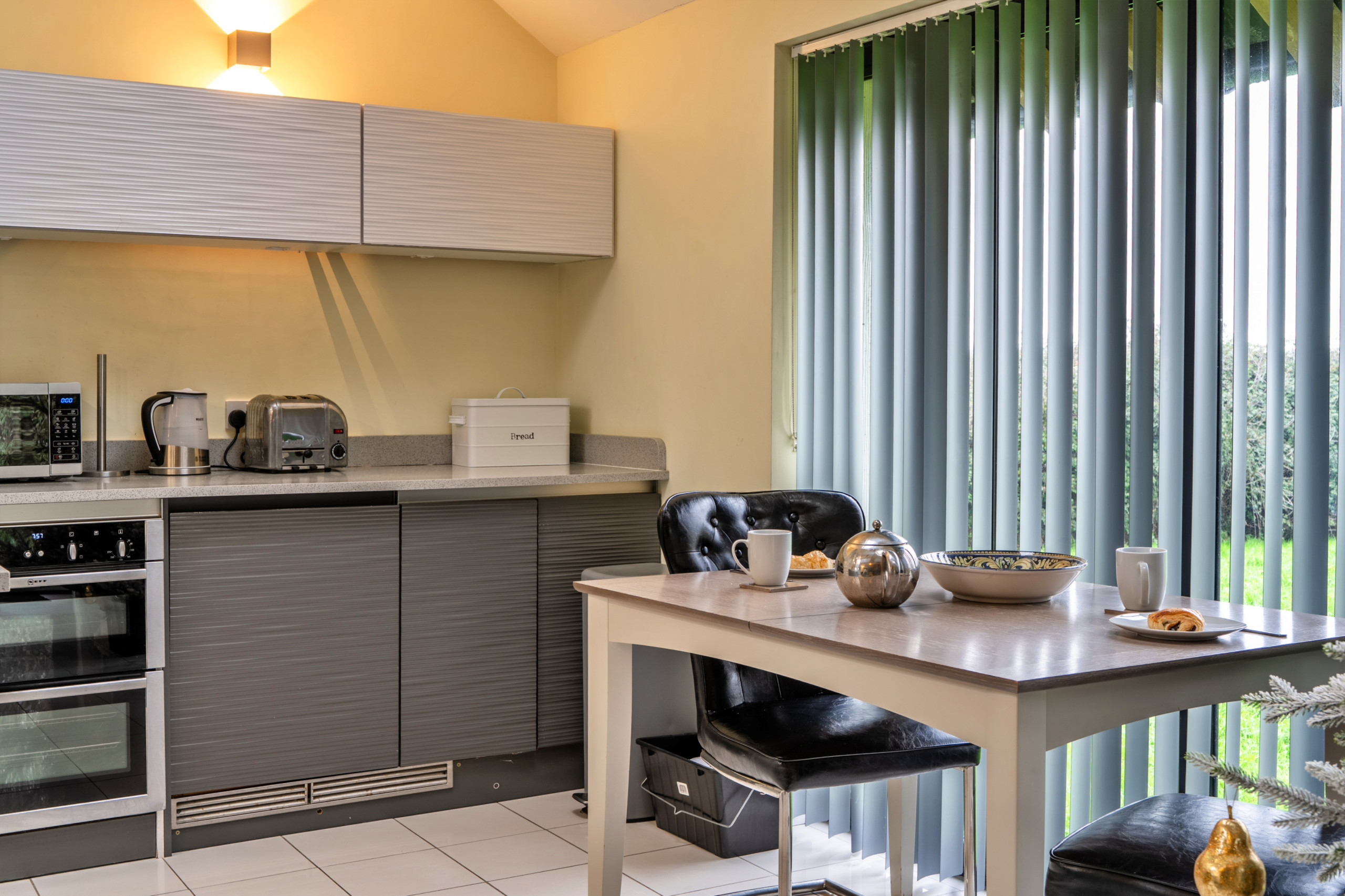 A path from the parking area leads to the barn’s private entrance. Inside, you’ll find a striking open-plan lounge, kitchen and dining area with a full-height vaulted ceiling. Large picture windows to the rear flood the space with natural light, while a feature fireplace with wood burner creates a warm and inviting atmosphere. Thoughtfully laid out, this area is ideal for relaxing after a day of exploring and includes a n internet only TV. The sleek kitchen is fully equipped with an electric oven and hob, fridge with ice compartment, dishwasher, microwave and washing machine. Beyond the living space is an impressive king-size bedroom, featuring a freestanding bath and a separate walk-in shower within the room, along with an en-suite WC.
