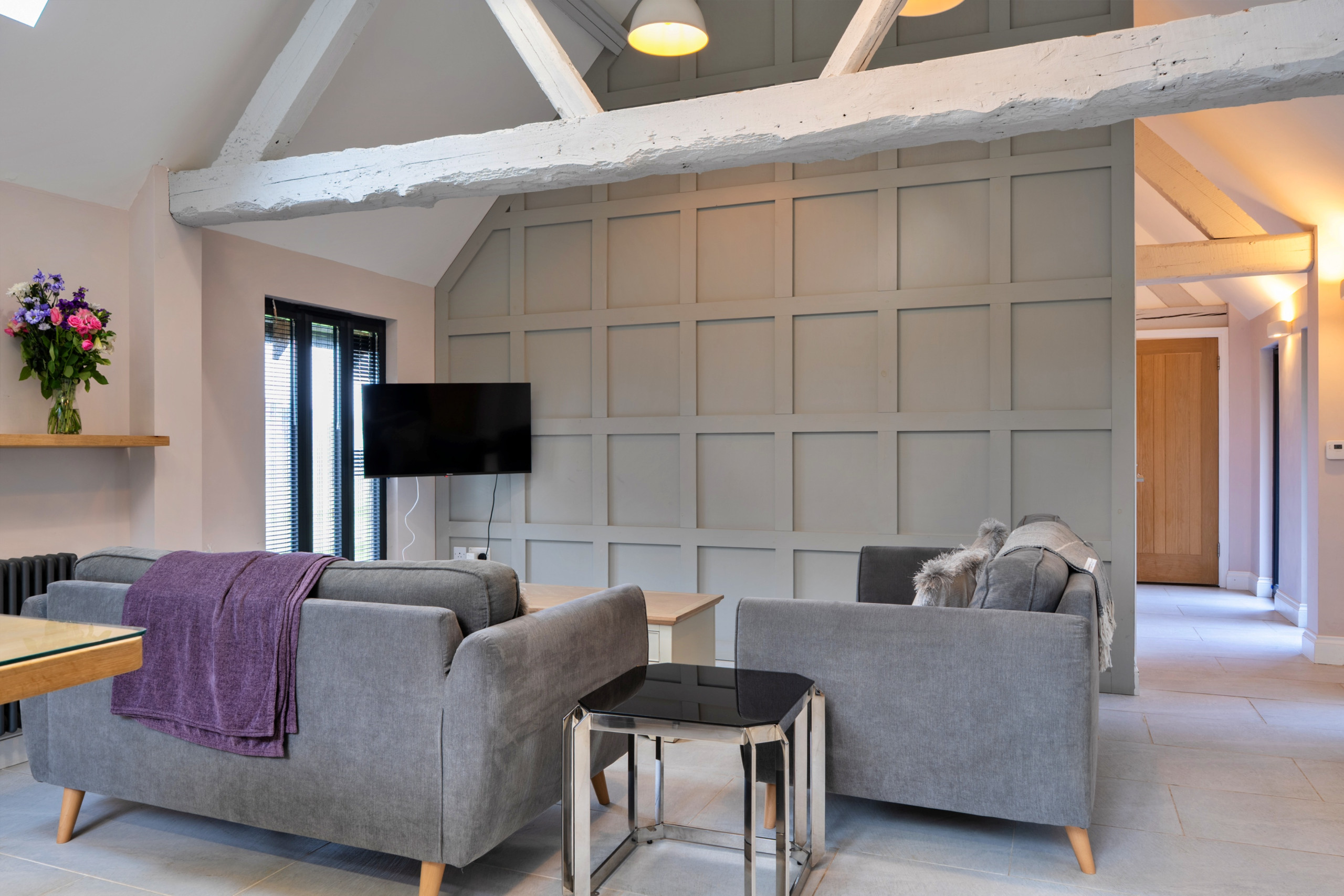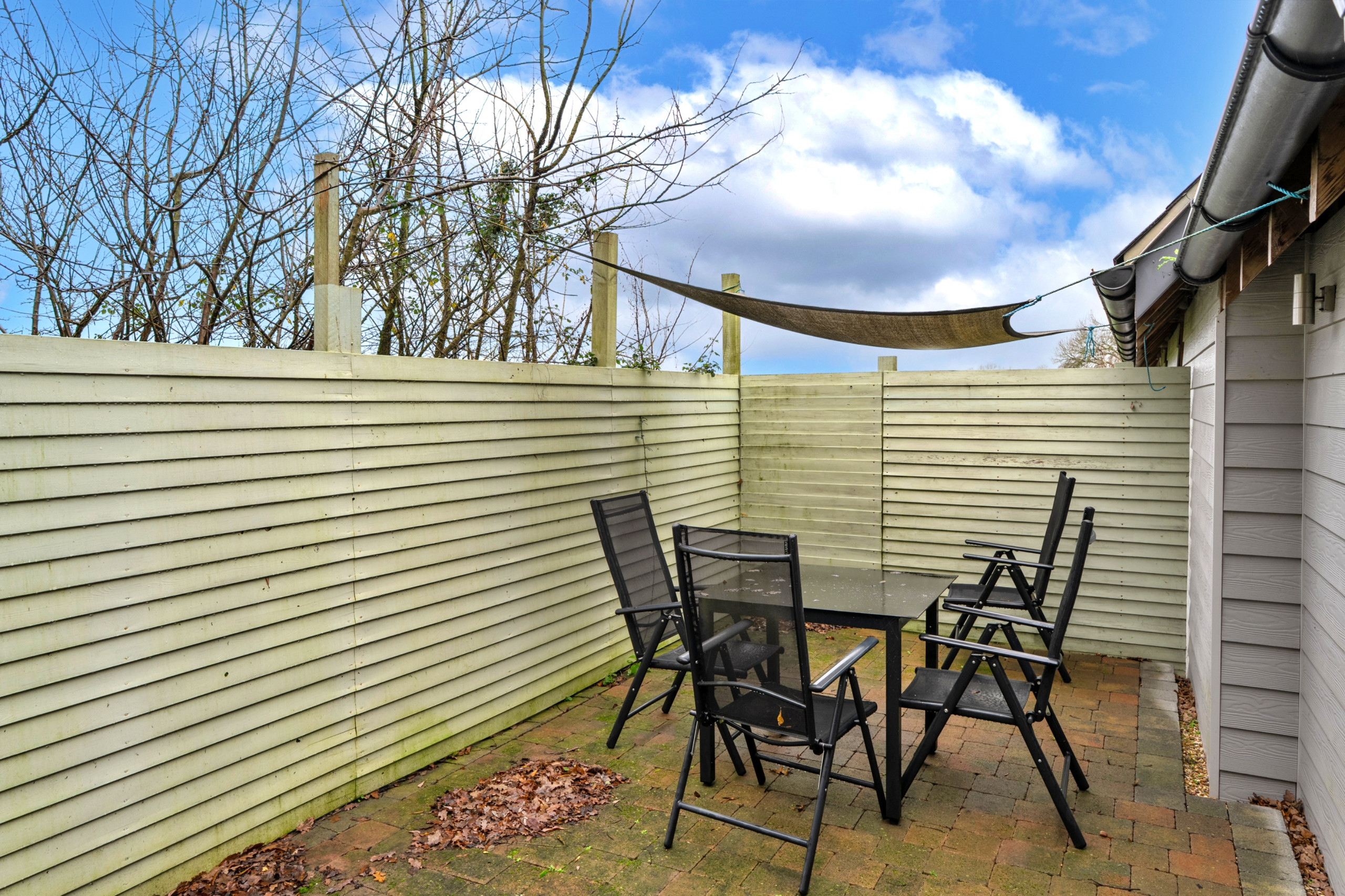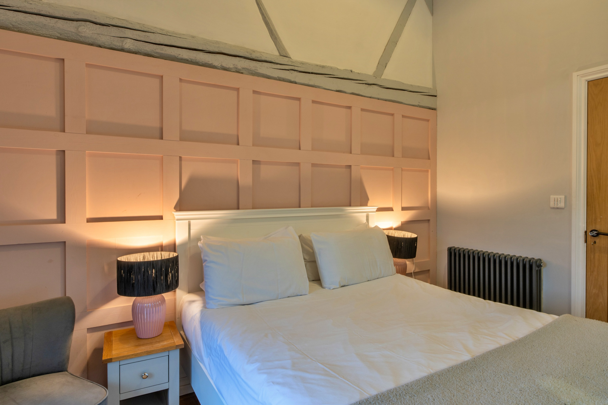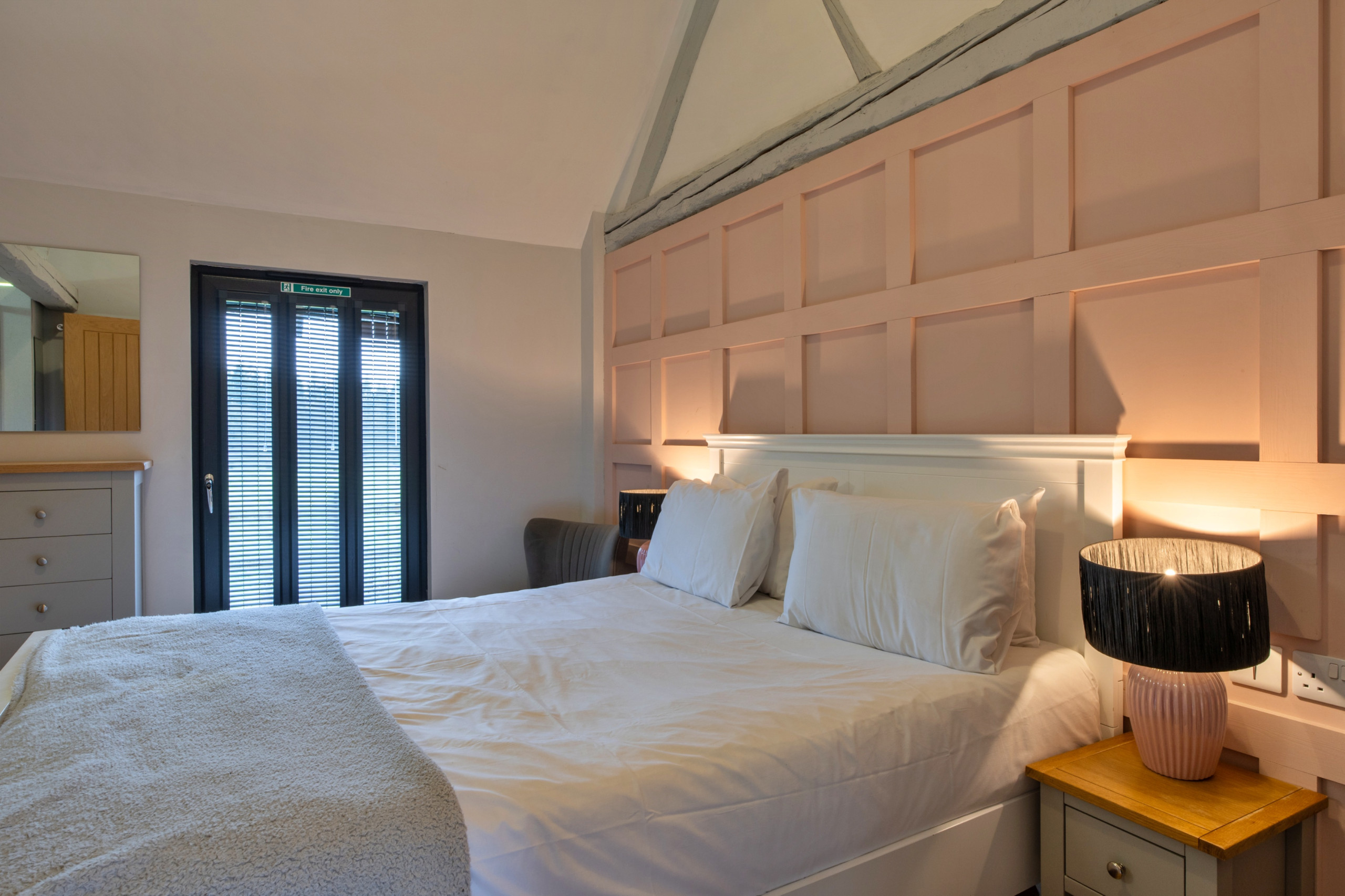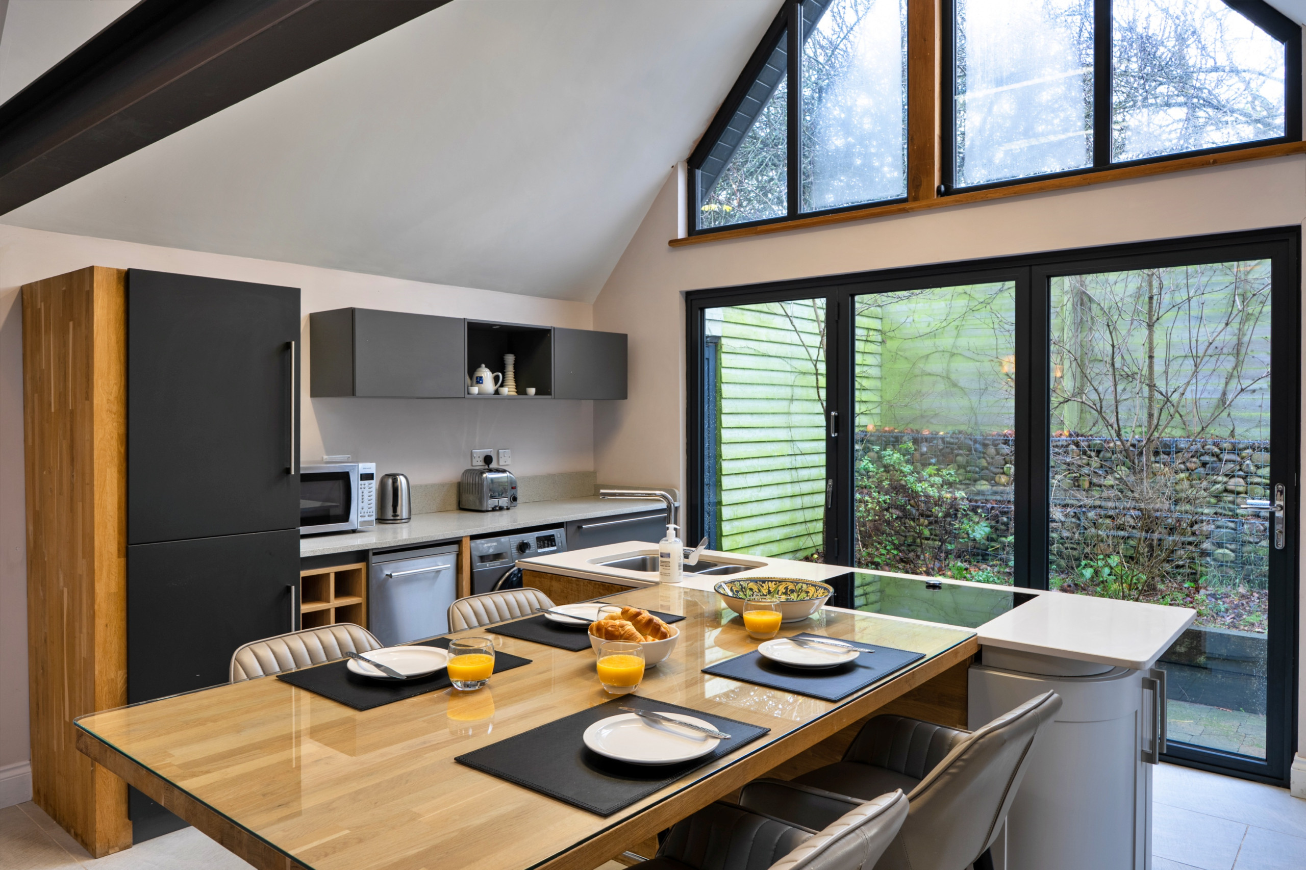 Bi-fold doors open directly from the kitchen onto a fully enclosed courtyard, furnished for outdoor dining and relaxation. Guests also have access to a shared paddock, ideal for picnics or dog walking. Off-road parking is available for one car, with a second space usually available on request.