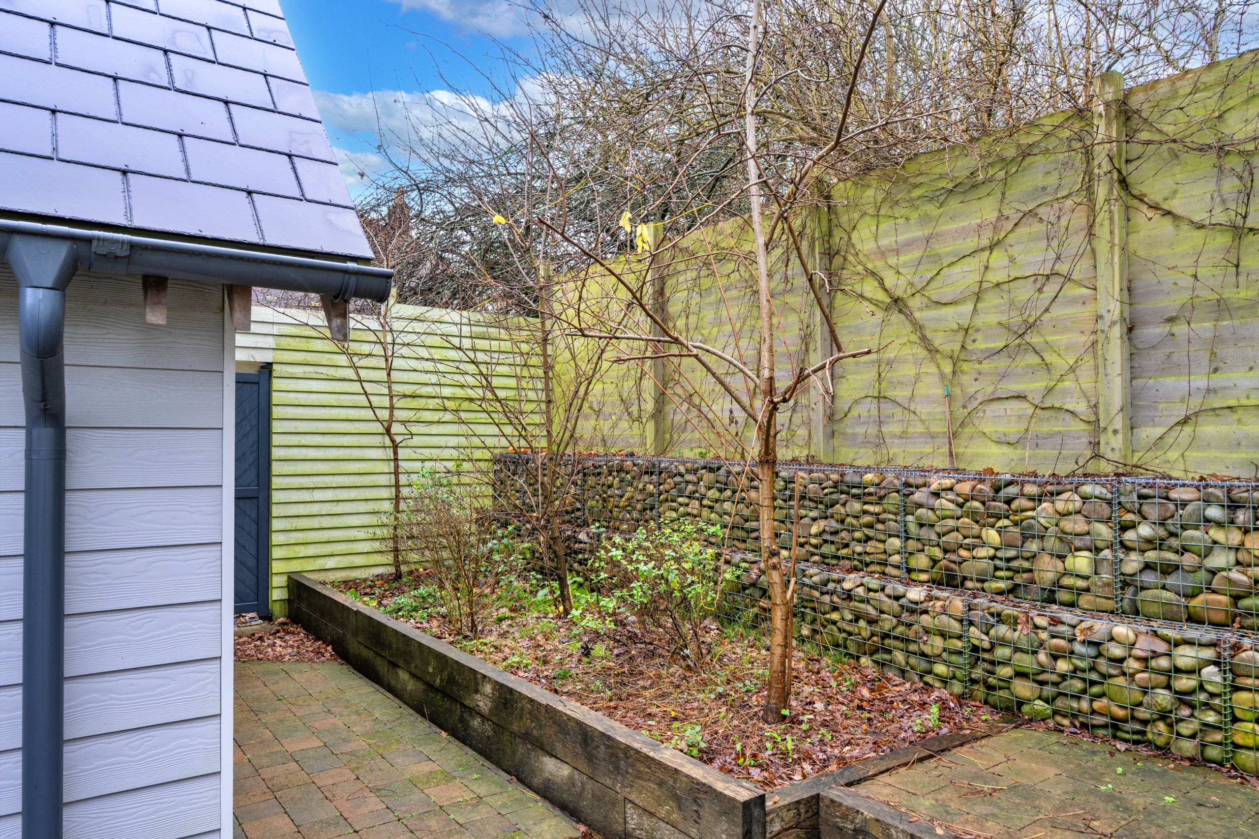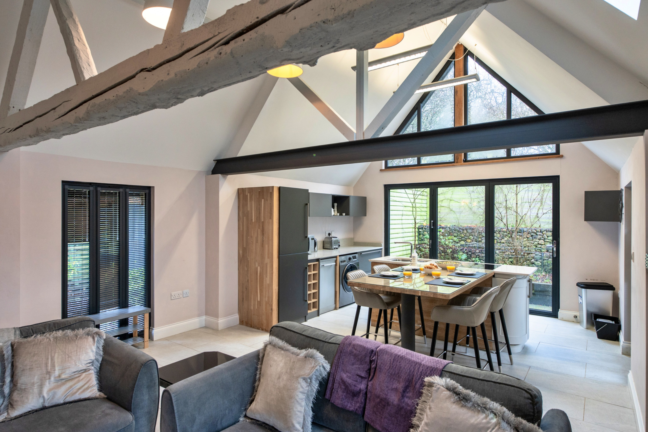 The property is accessed via a shared courtyard garden to the front, with a private entrance leading into a light-filled open-plan lounge, kitchen and dining area. This impressive space features a vaulted ceiling with exposed beams and a central island, creating a sociable and welcoming atmosphere.