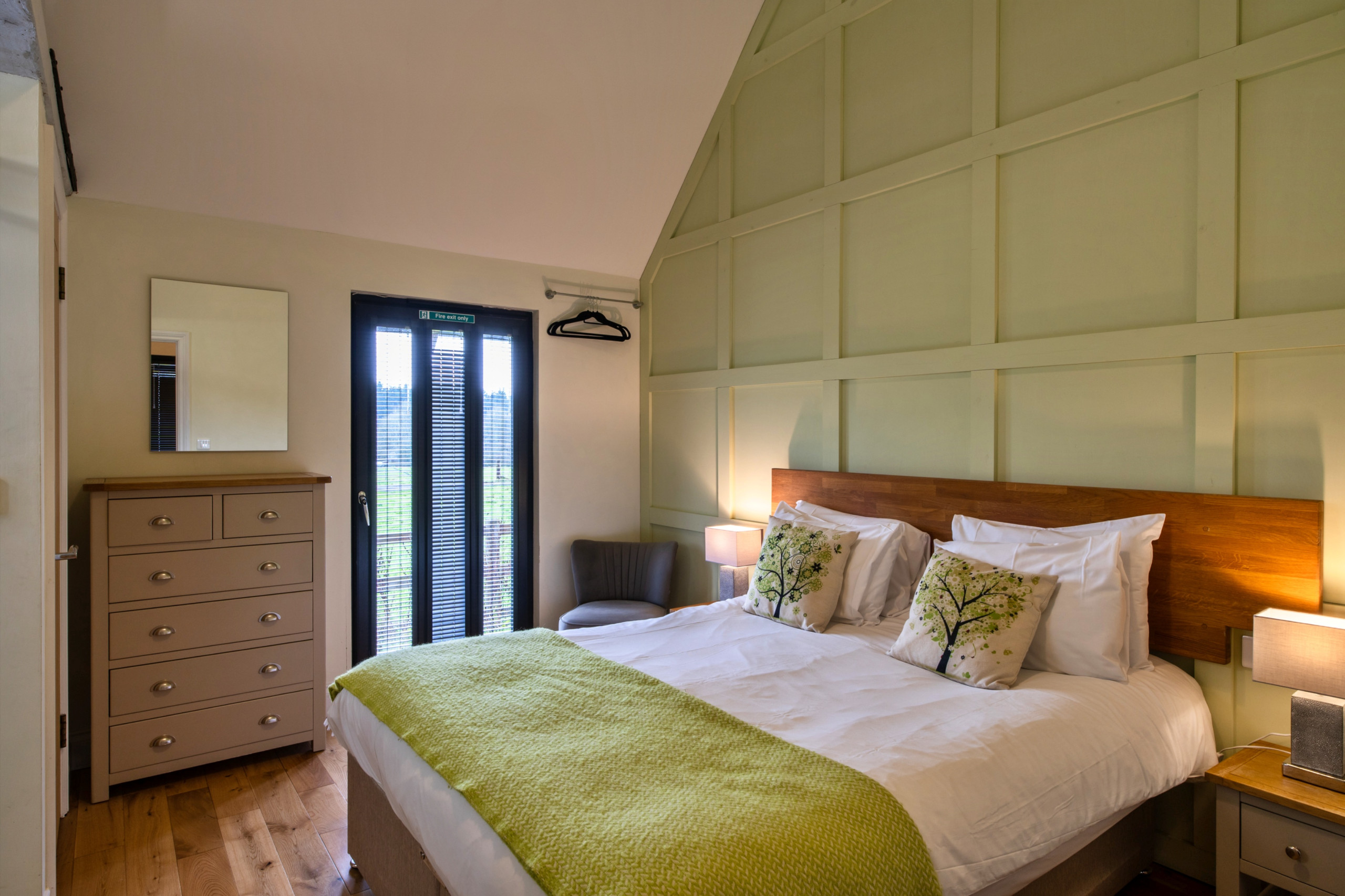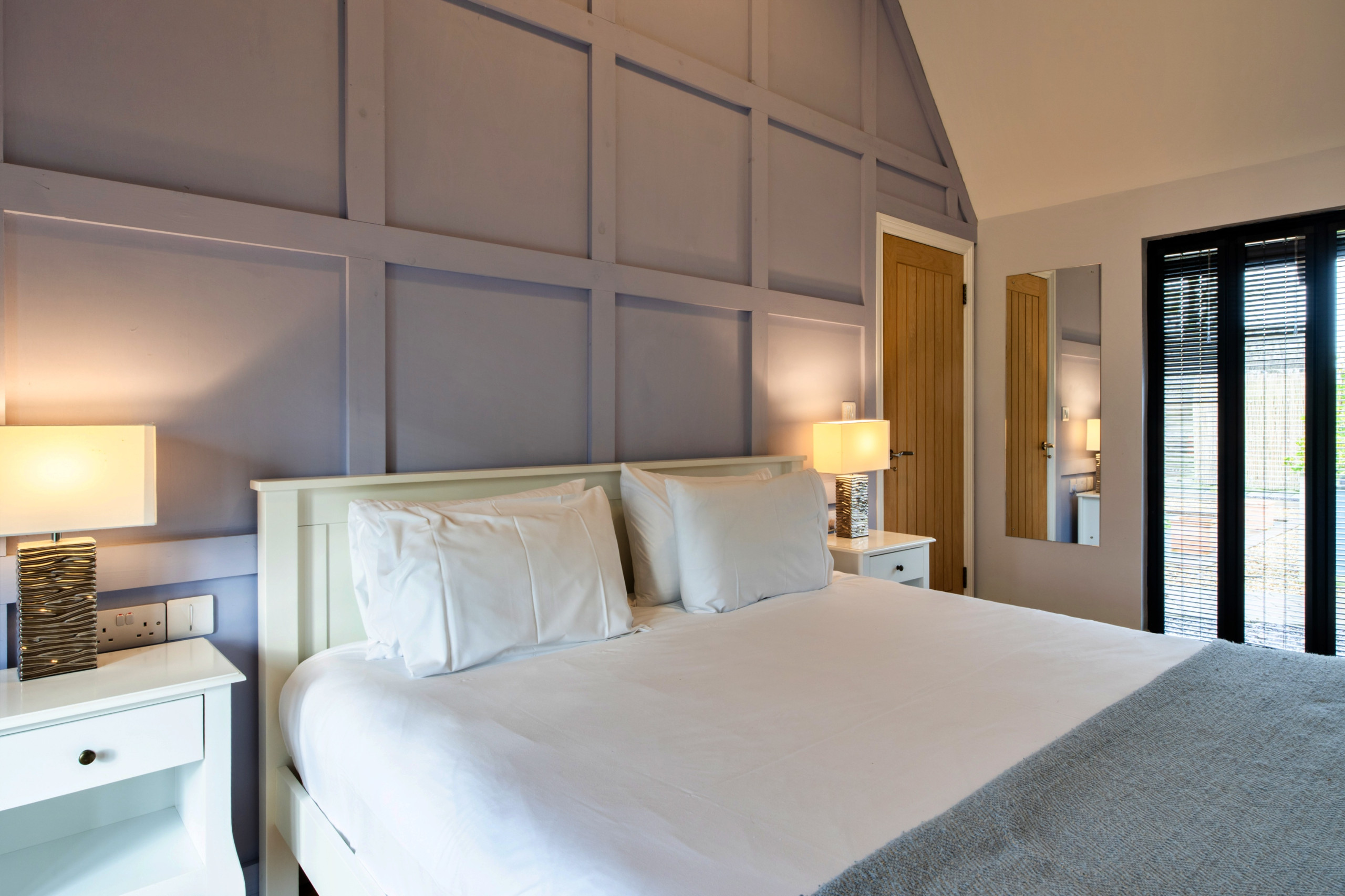 The accommodation includes two attractive bedrooms: a king-size zip-and-link bedroom (which can be made up as a twin on request) with an en-suite shower open to the room and a separate WC, and a generous super-king-size bedroom with its own en-suite shower room and WC.