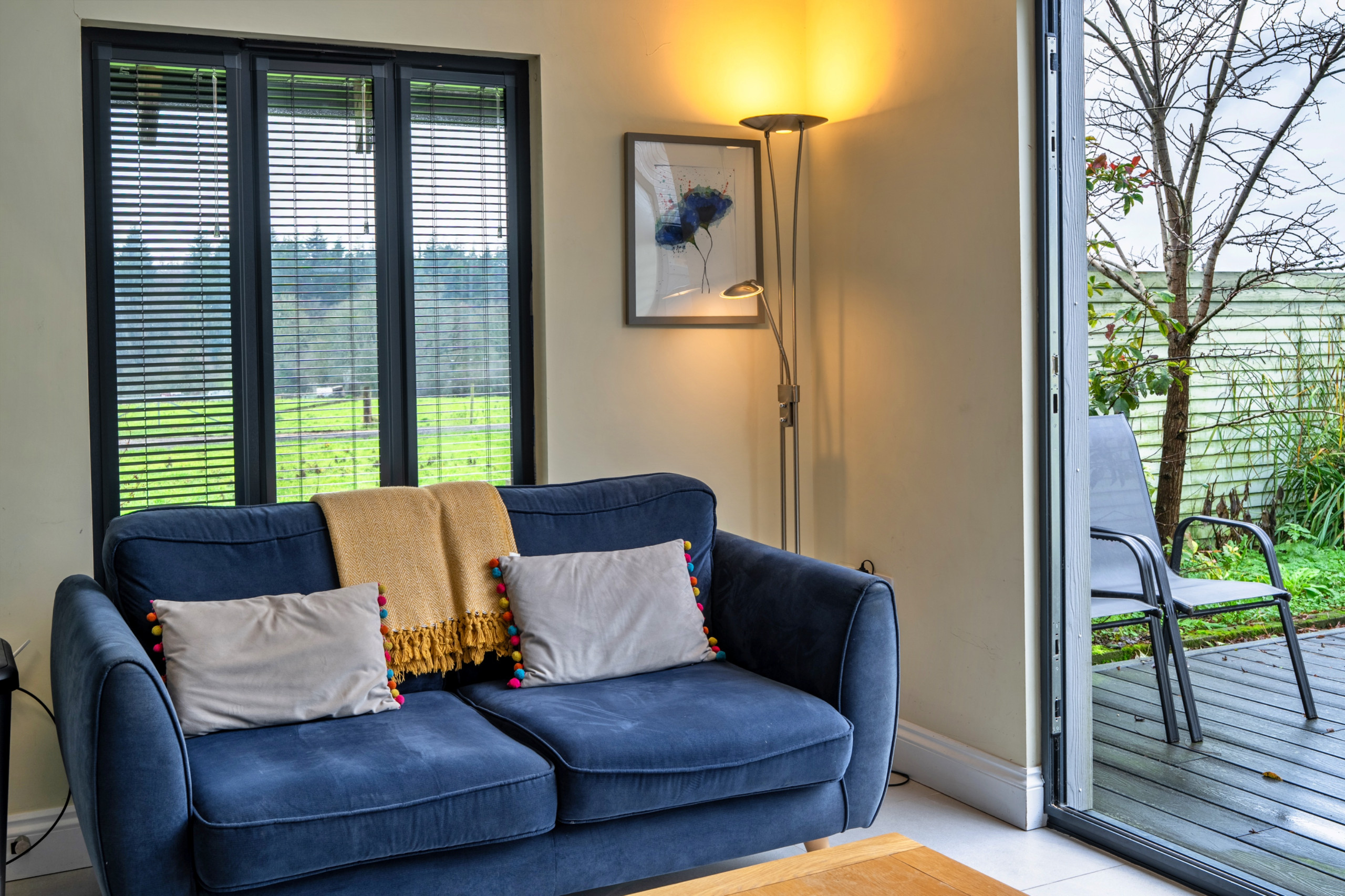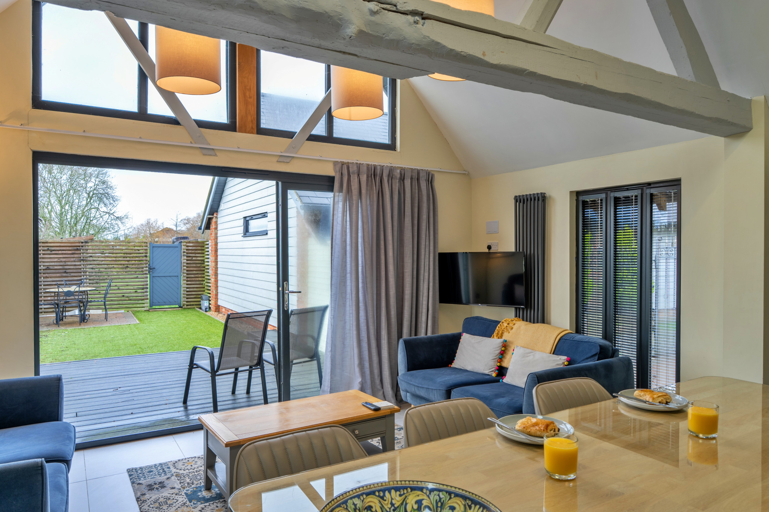 Bi-fold doors open directly from the kitchen onto a fully enclosed, courtyard furnished for outdoor dining and relaxation. Guests also have direct access to the shared paddock, ideal for picnics or dog walking. Off-road parking is available for one car, with a second space usually available on request.