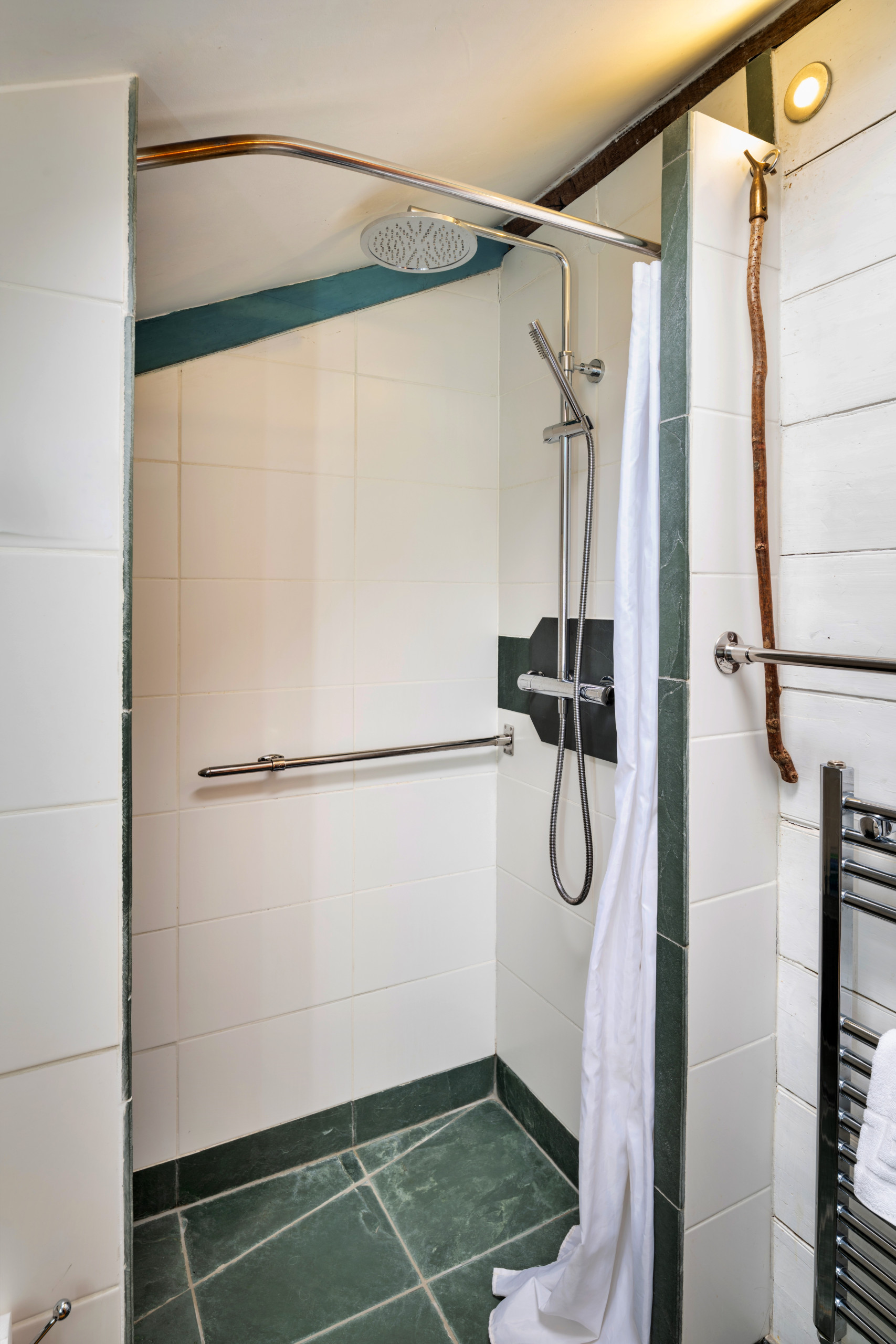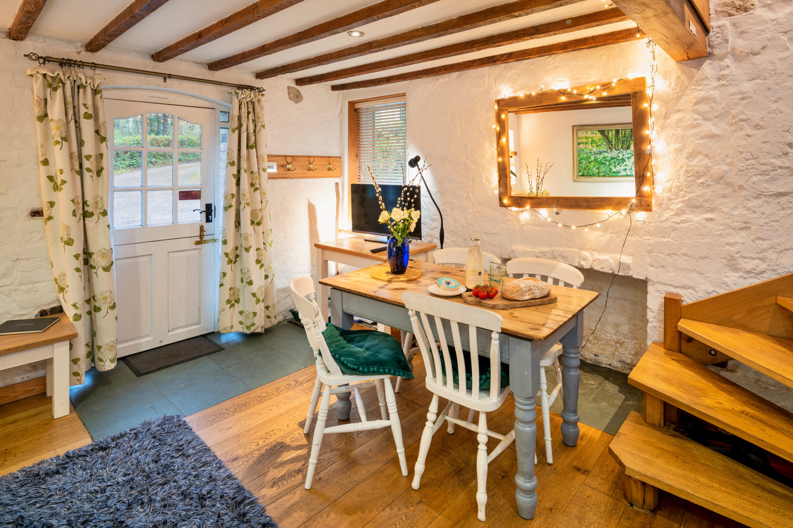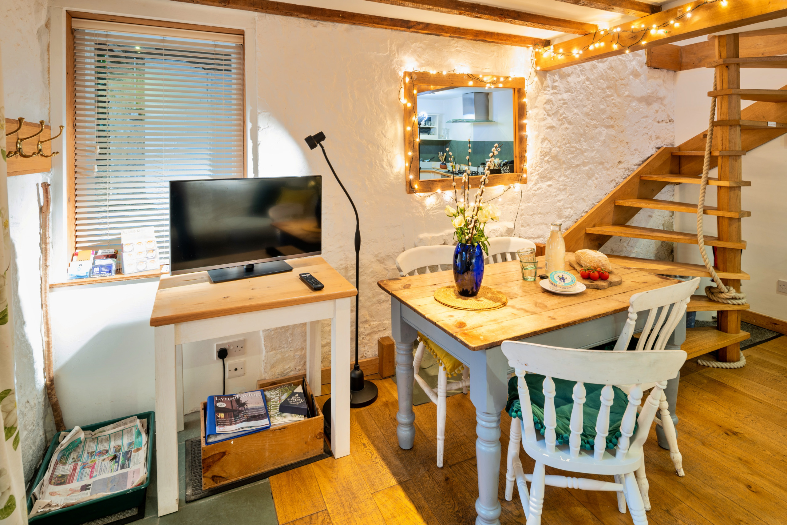 On the ground floor, you’ll find an open-plan kitchen and living area, thoughtfully designed for relaxing, dining or working. The space is bright and welcoming and works well as a comfortable workspace, supported by BT superfast Wi-Fi. The kitchen is fully equipped with an oven, microwave, dishwasher, fridge/freezer, coffee machine, kettle, toaster and all necessary utensils for easy self-catering. A washing machine adds to the convenience of longer or shorter stays. An oak staircase leads upstairs to a tranquil bedroom with a king-size double bed, creating a calm and restful retreat. Also on this level is a modern bathroom with shower, finished to a high standard.
