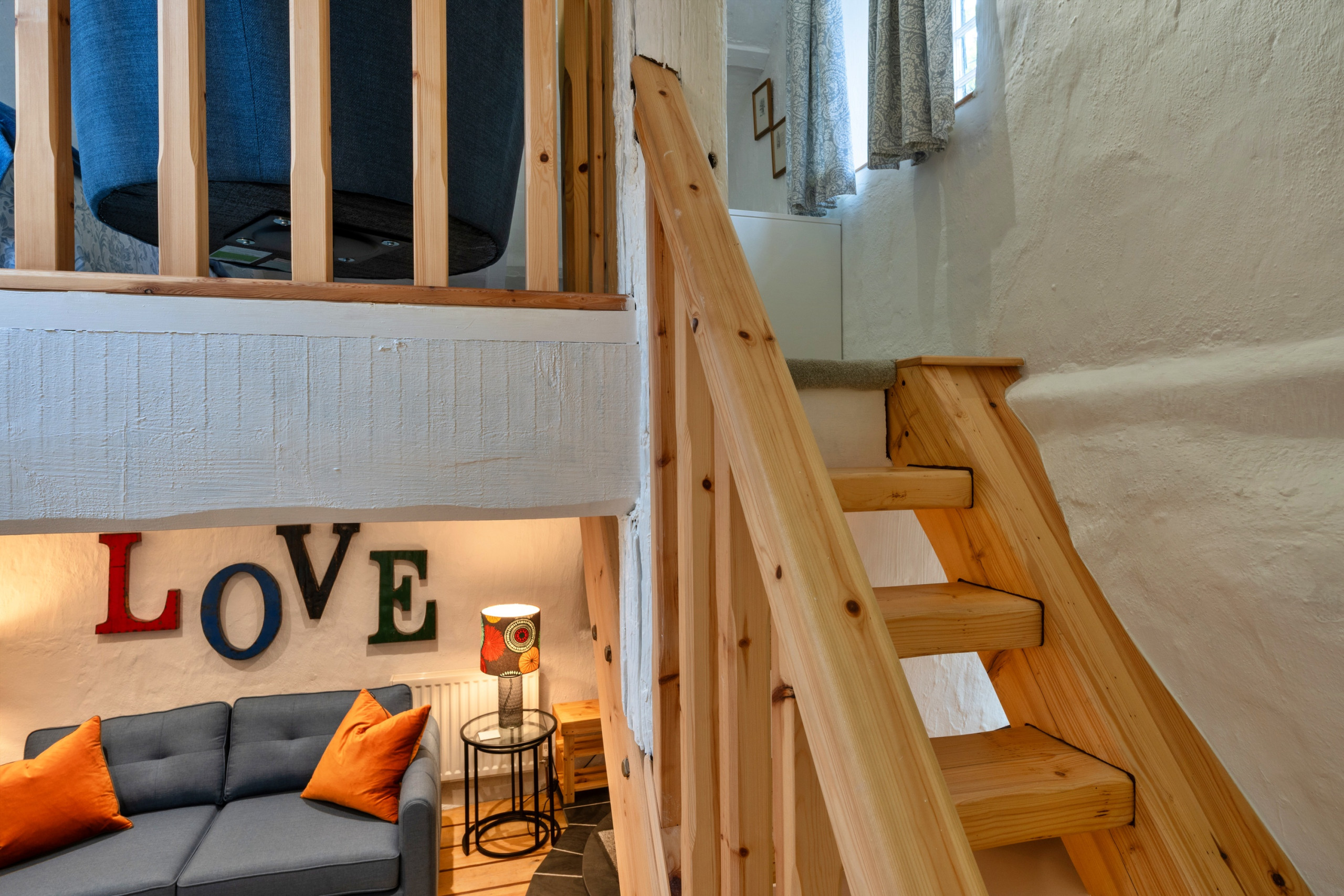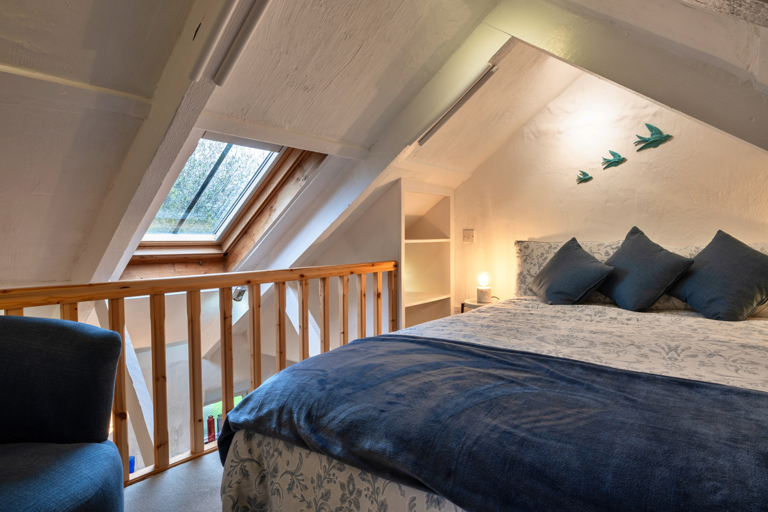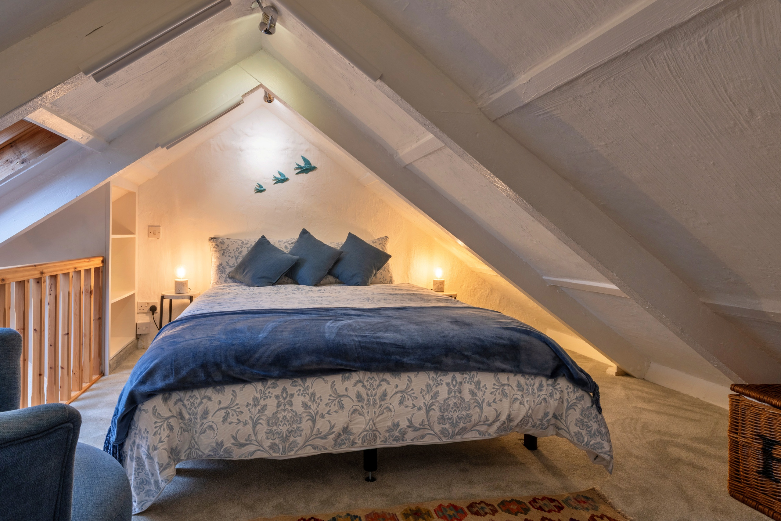 A stylish mezzanine bedroom with a king-size bed offers a serene spot to unwind, while the downstairs shower room with WC provides all you need.