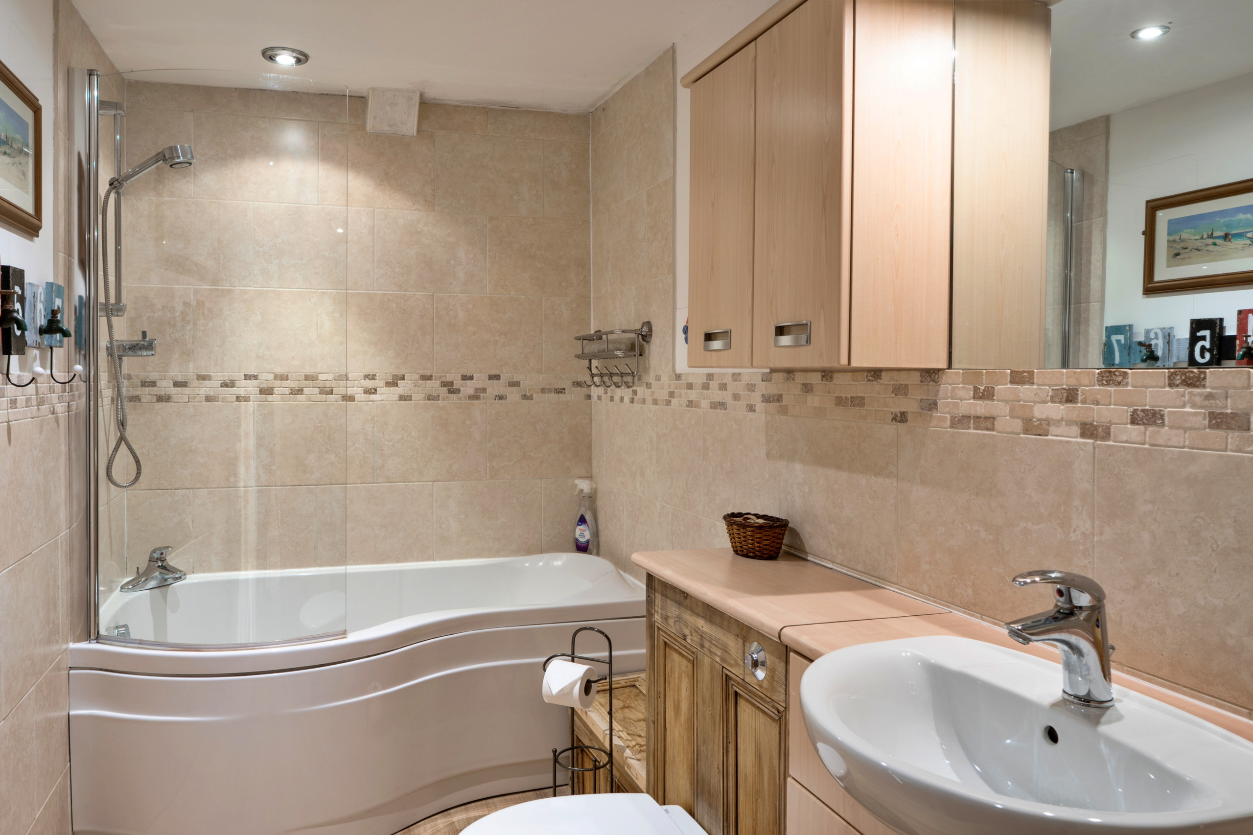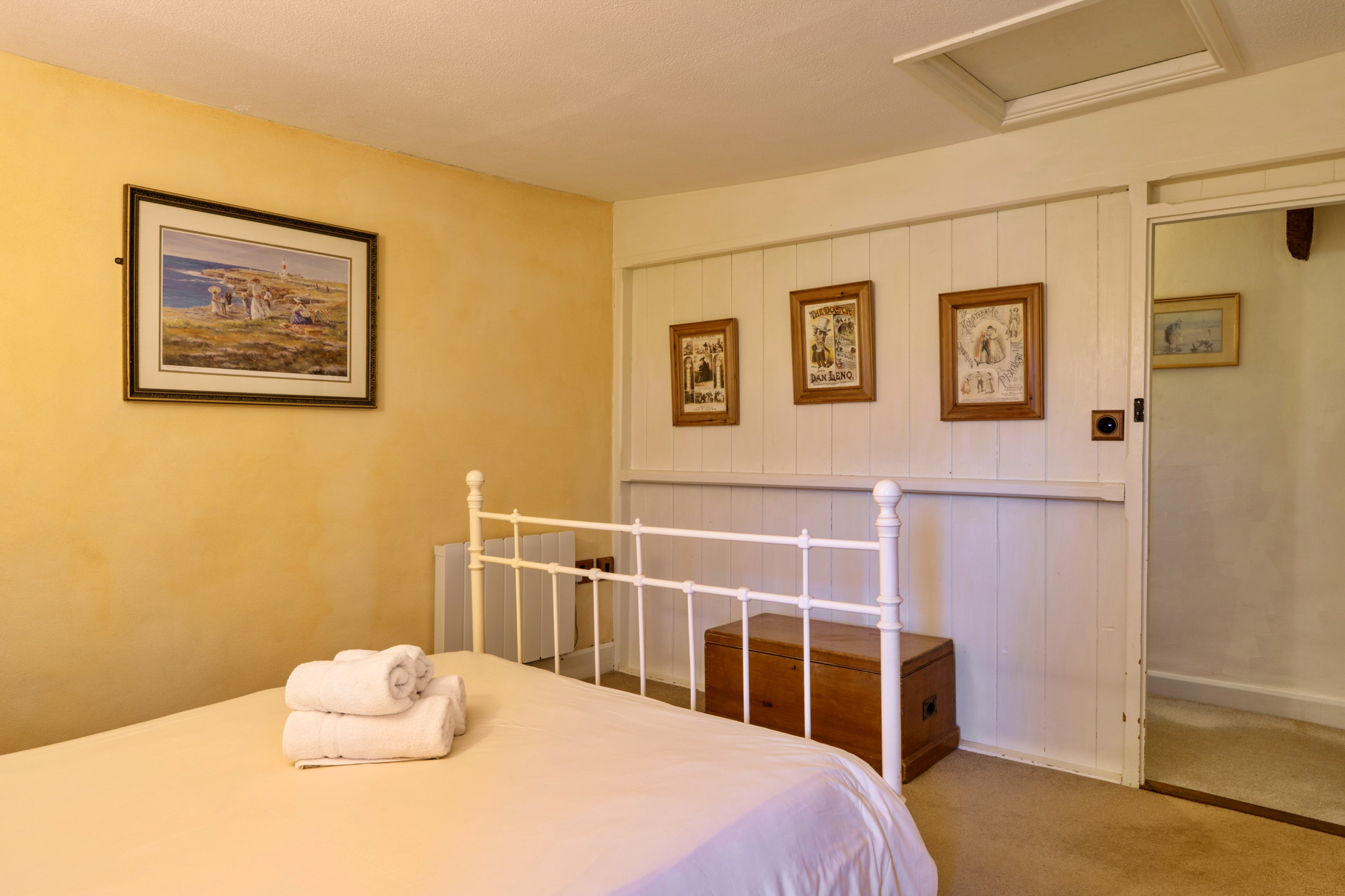 Upstairs, the cottage comfortably accommodates up to eight guests across four well-appointed bedrooms. The accommodation includes a super king-size bedroom, two double bedrooms, and a twin bedroom with two single beds. One of the double bedrooms benefits from an en-suite bathroom with a bath, separate shower cubicle and toilet. A family bathroom serves the remaining bedrooms and includes a bath with shower over and toilet, ensuring comfort and flexibility for larger groups.