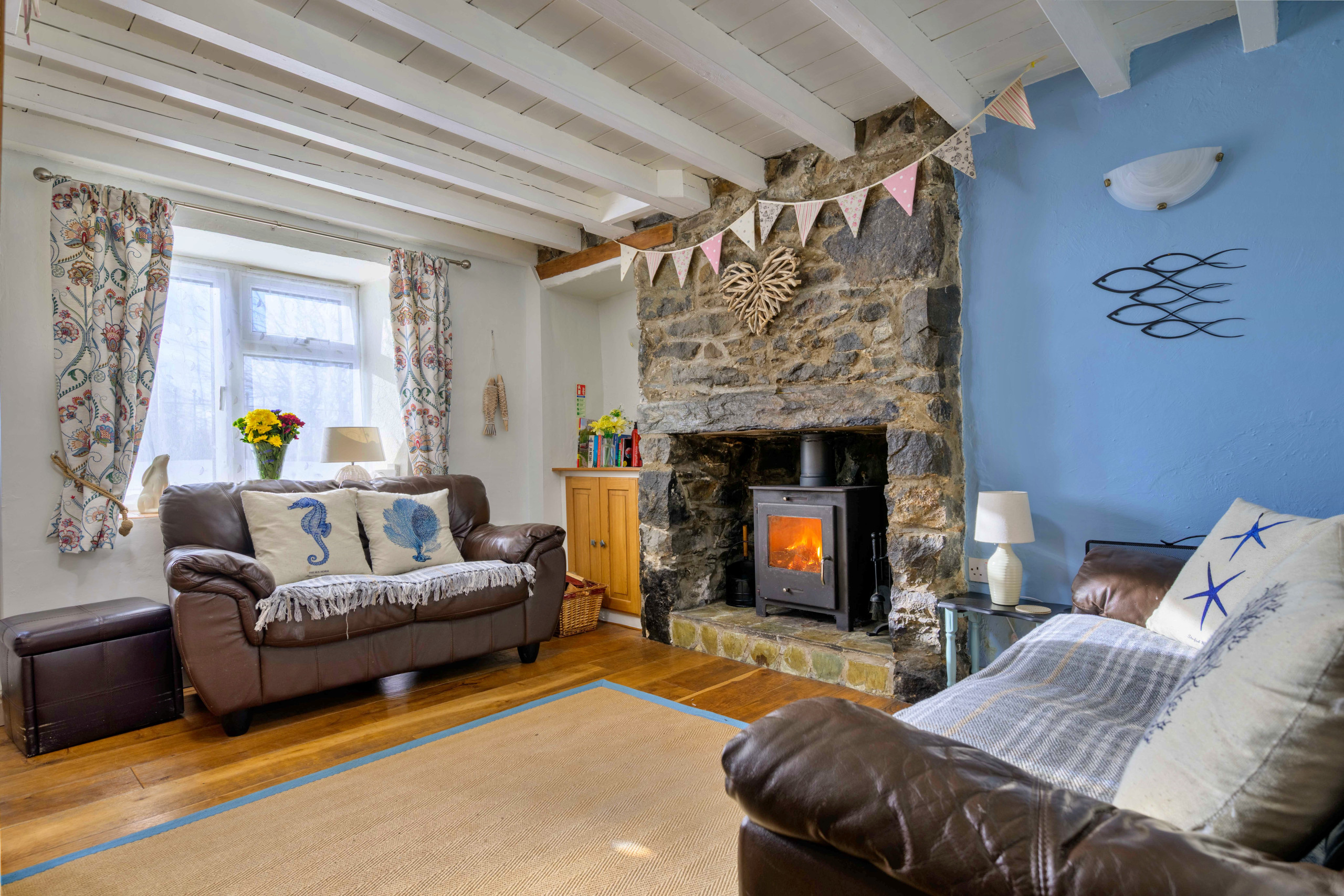 Penrhos Sea Cottage is a well-presented 100-year-old property that retains some of its original character. The cottage benefits from sea views and a log burner in the lounge, creating a comfortable and relaxed setting throughout the year. The property is dog friendly and well suited to families, couples or small groups seeking a practical and well-located coastal base.