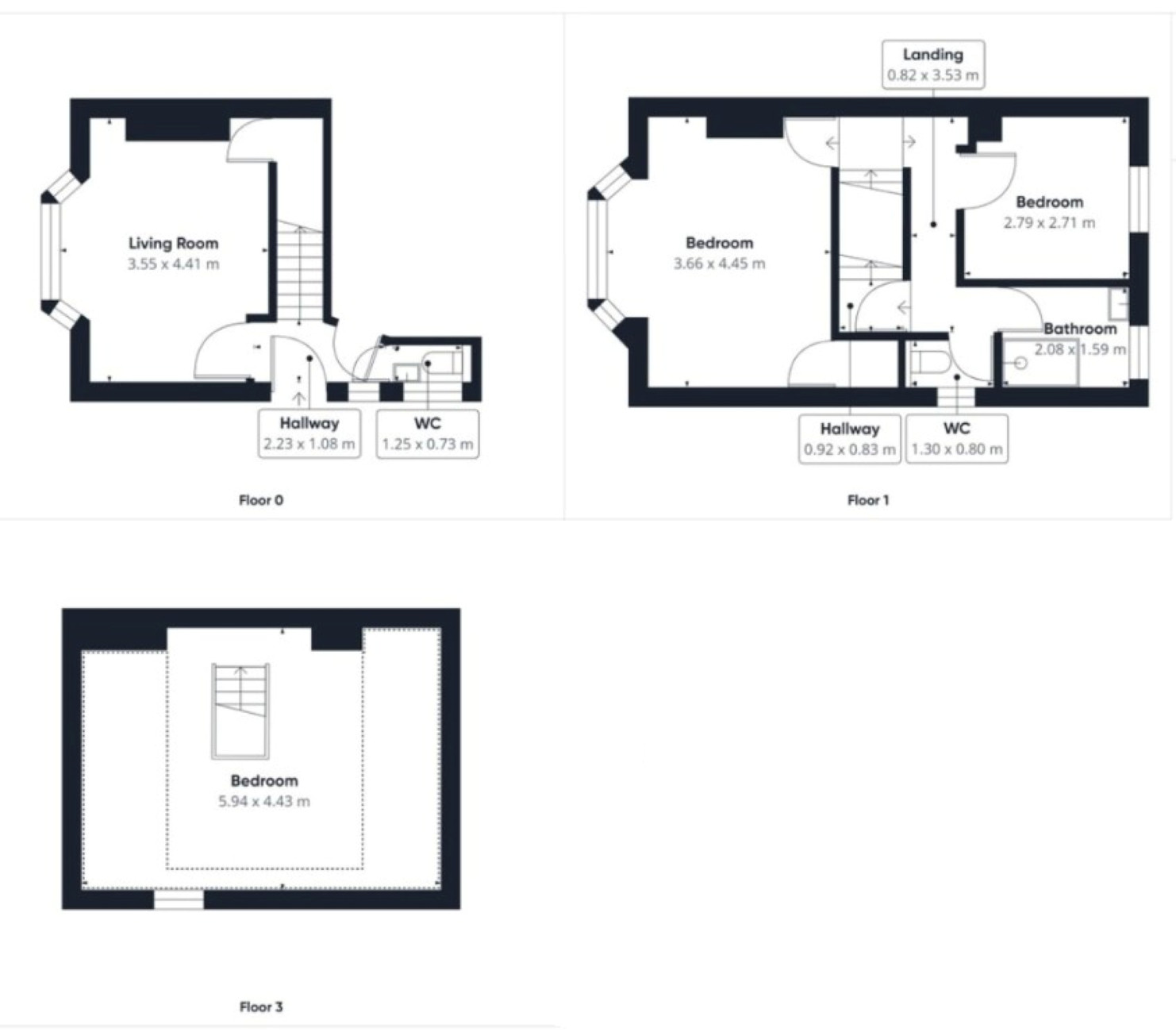 Upstairs, the bedrooms are arranged across two floors, giving guests a sense of space and privacy. The main bedroom features a king-size four-poster bed, while the second is set up as a twin. The top-floor bedroom, with its sloped ceilings and skylights, offers a quieter retreat. A family bathroom and an additional WC on the ground floor mean getting ready for the day is straightforward.