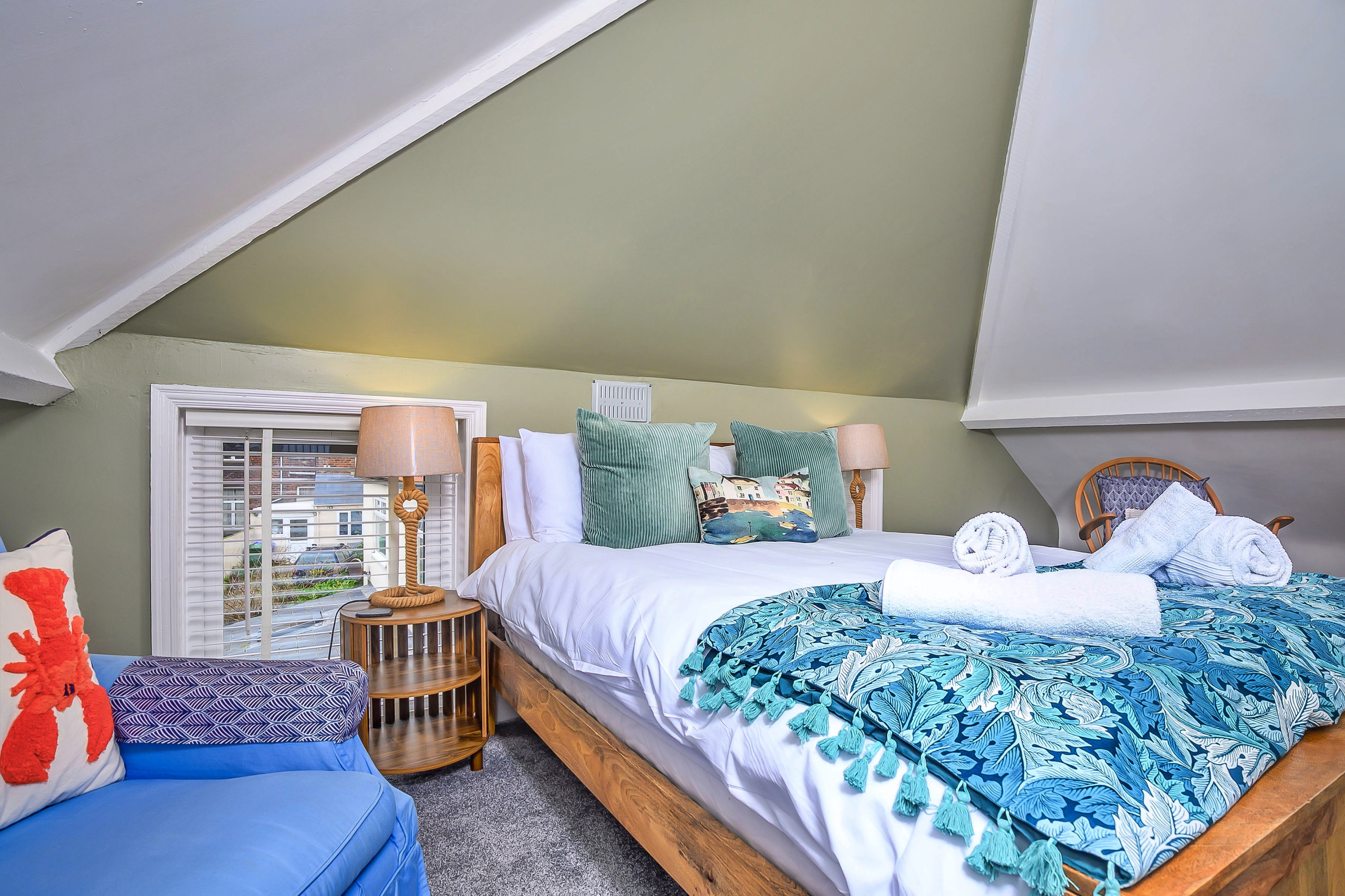 The bedrooms are spread across the upper two floors, creating a sense of space and privacy for guests. The main bedroom features a double bed, the second is arranged as a twin, and the top-floor bedroom, with its sloping ceilings and skylights, provides a peaceful retreat. A family bathroom upstairs, along with an additional ground-floor WC, ensures mornings run smoothly.
