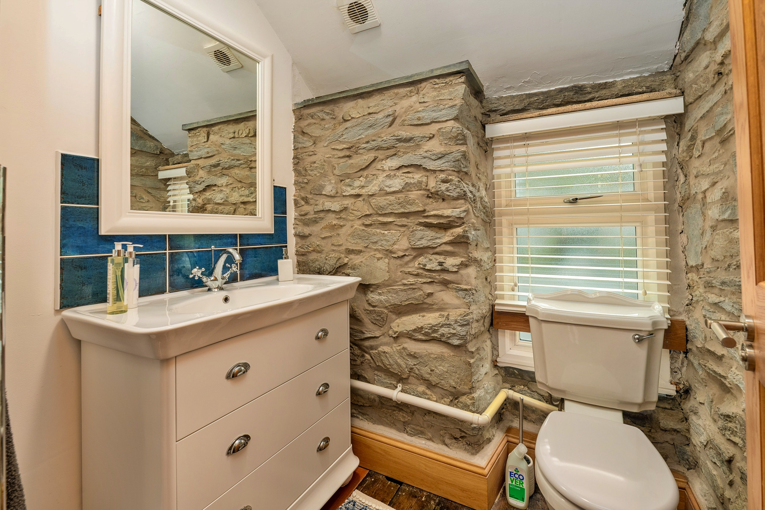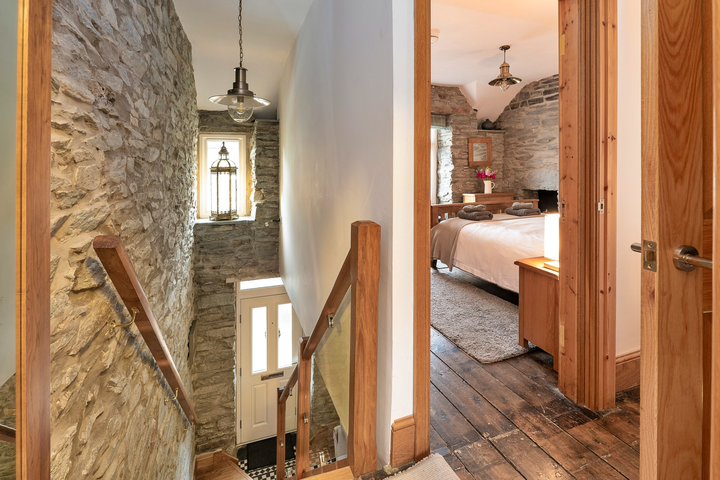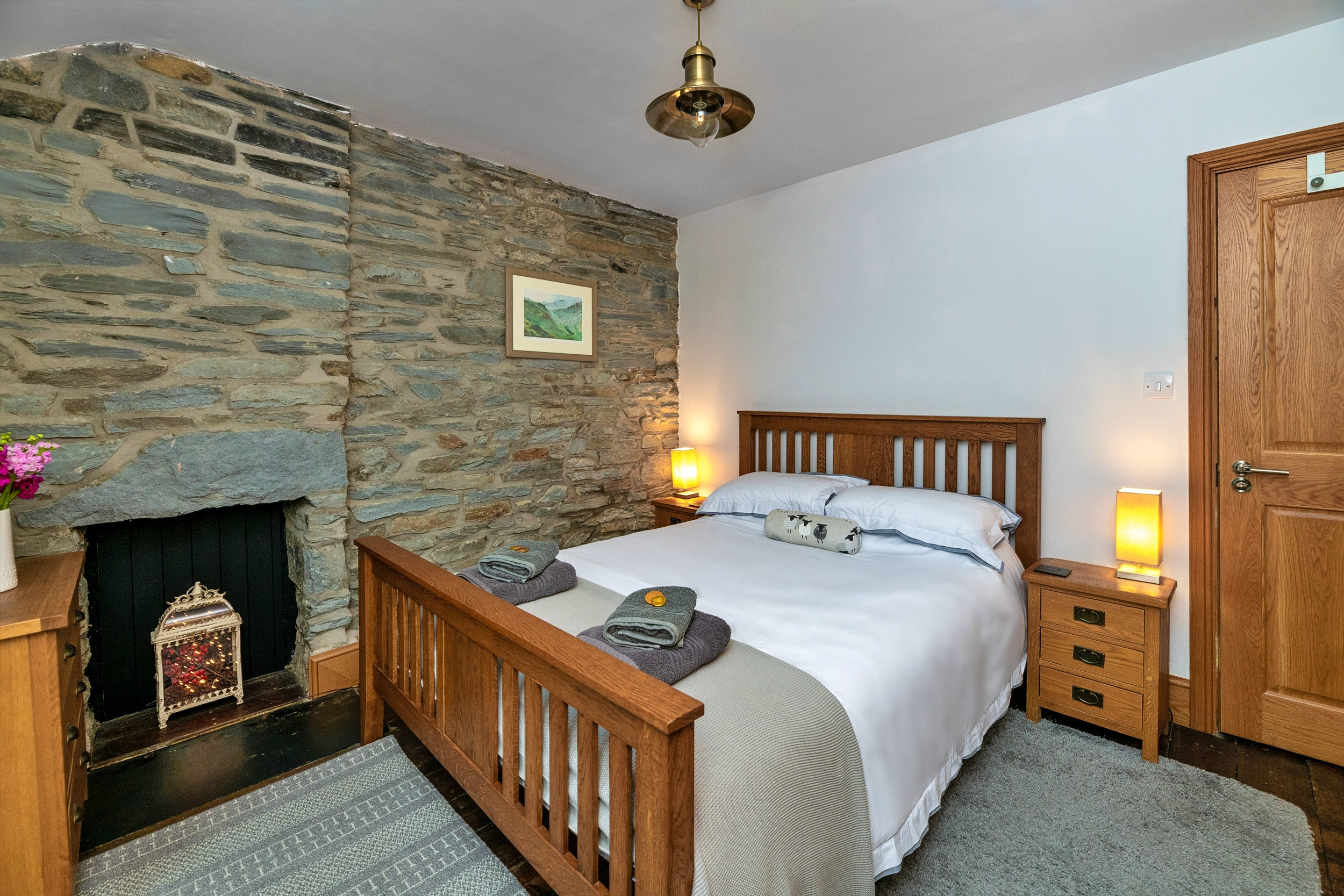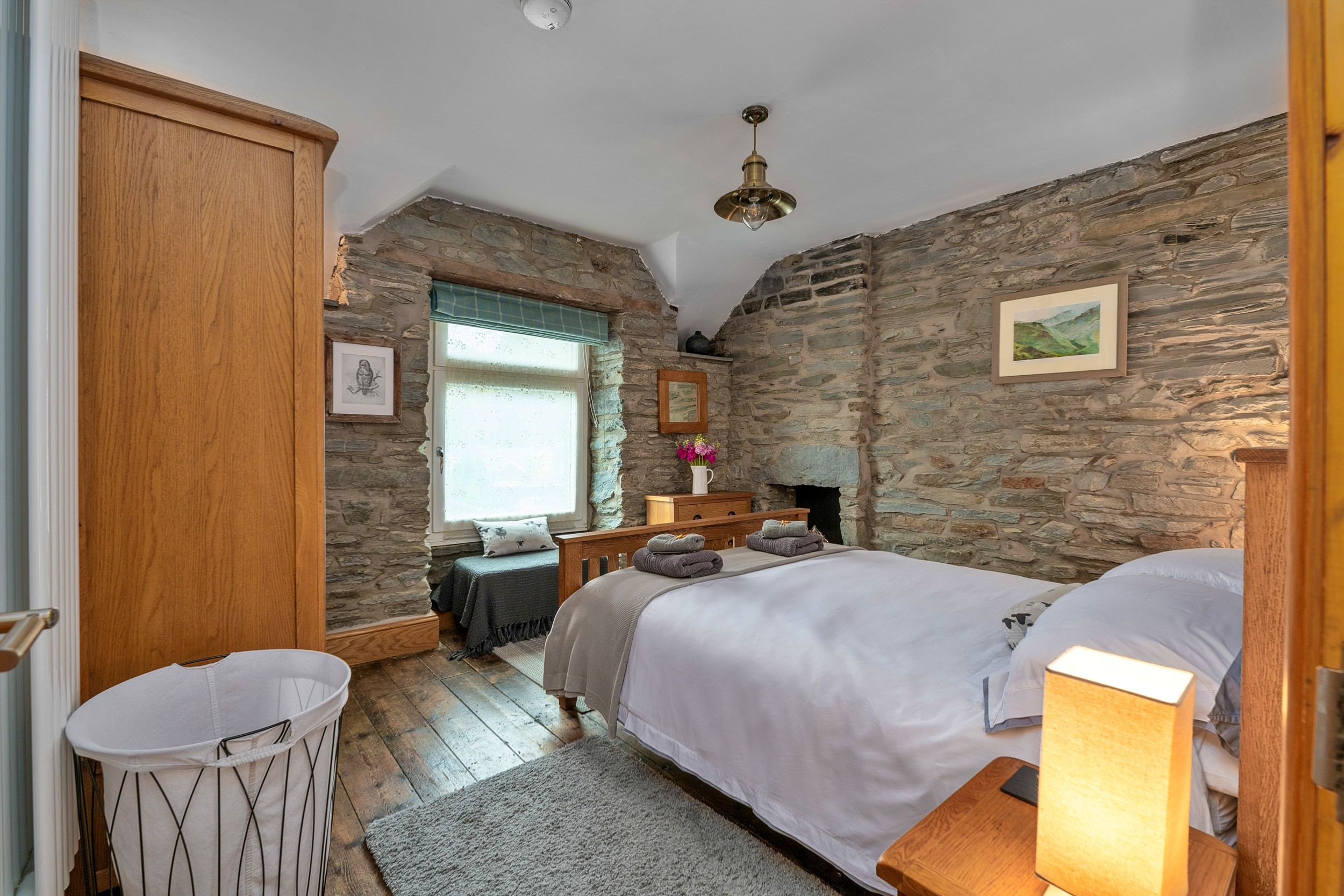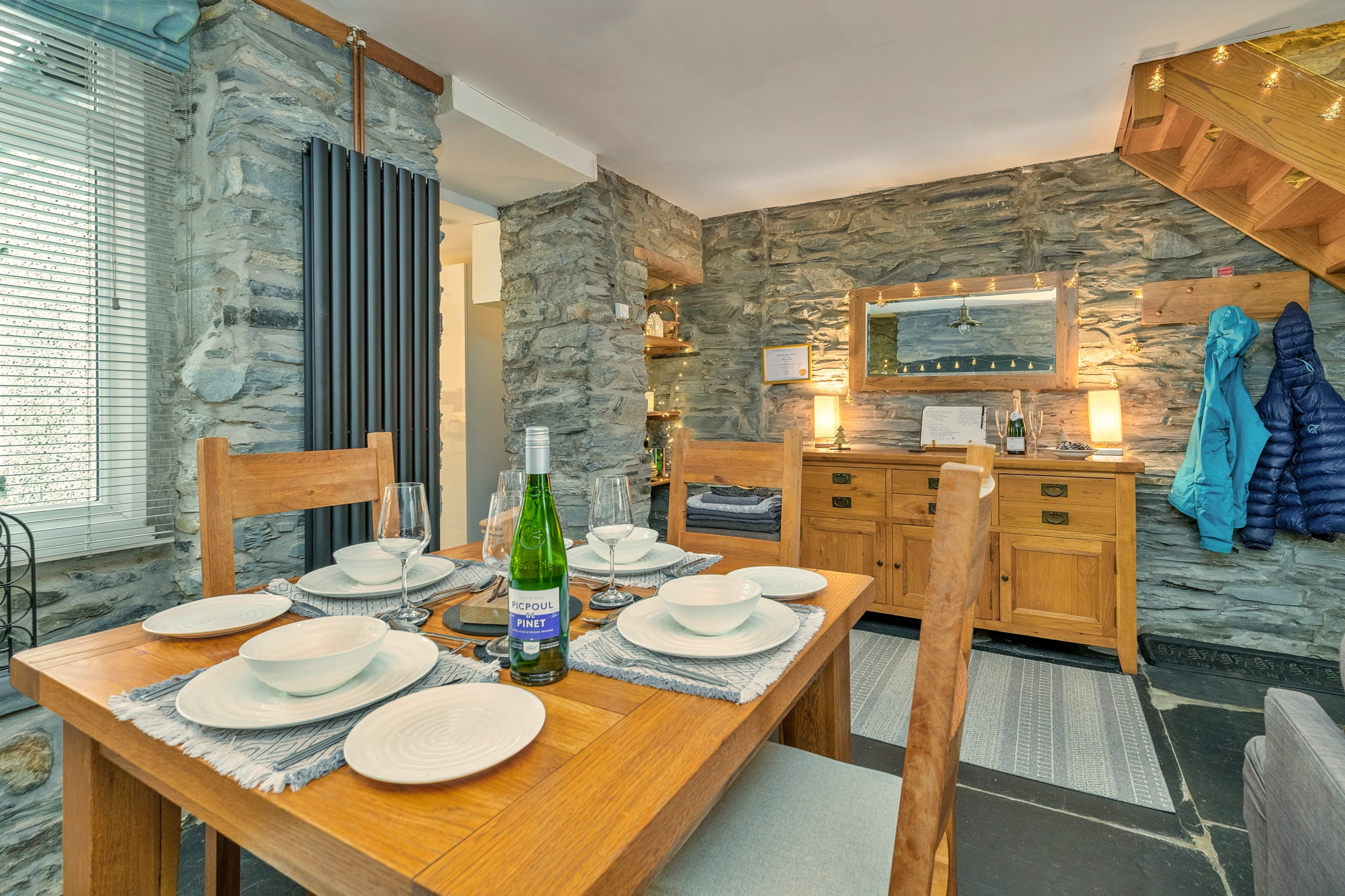 Garreg Ddu blends its rich heritage with modern touches, featuring exposed stonework, inglenook fireplaces, original slate floors. The spacious living area invites you to unwind after a day of exploring, complete with comfortable seating and a wood-burning stove. The dining space is perfect for both cosy dinners and relaxed family breakfasts. A modern, fully equipped kitchen offers everything you need, while the ground-floor shower room features a double walk-in drencher shower, basin, and toilet for added convenience.