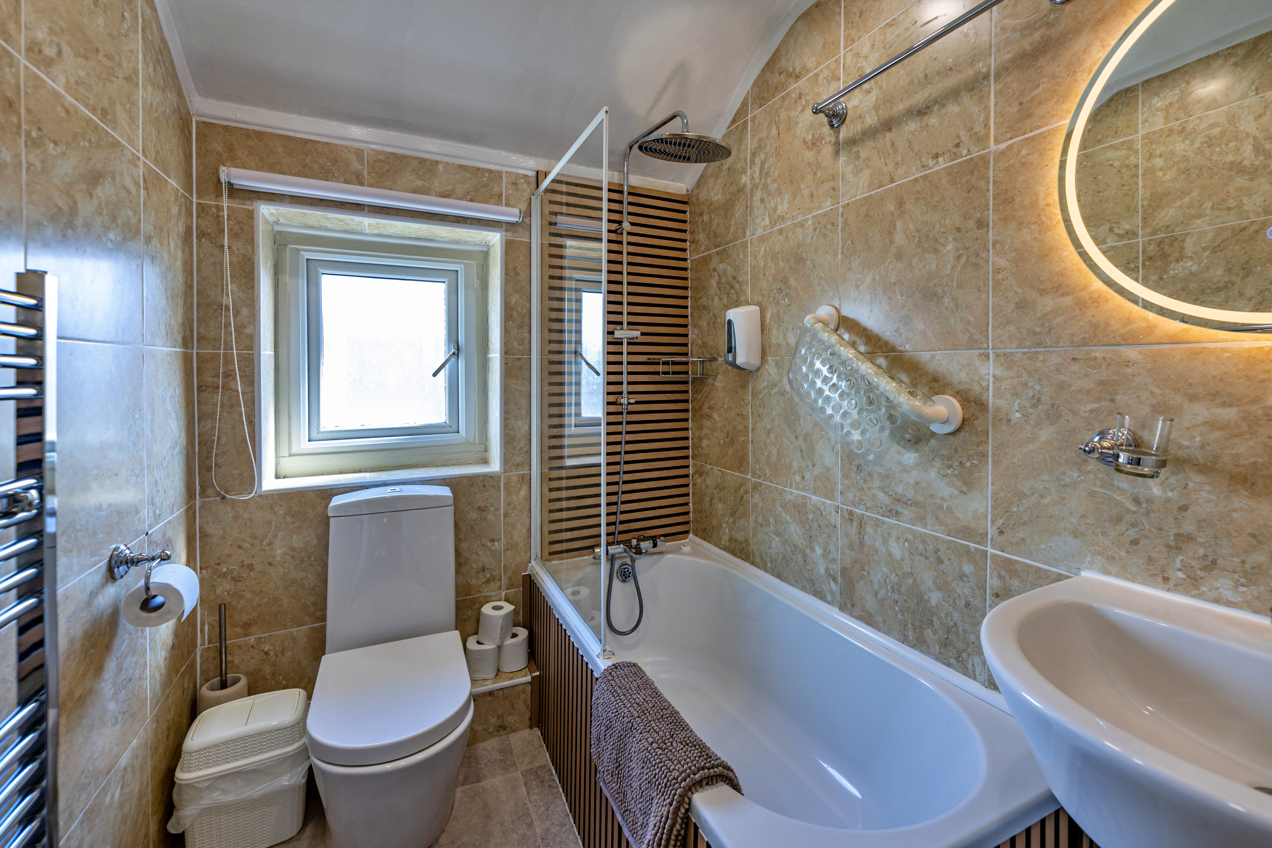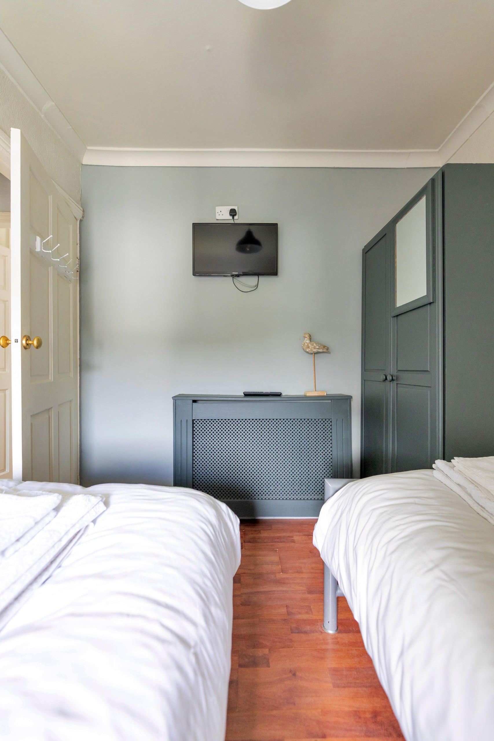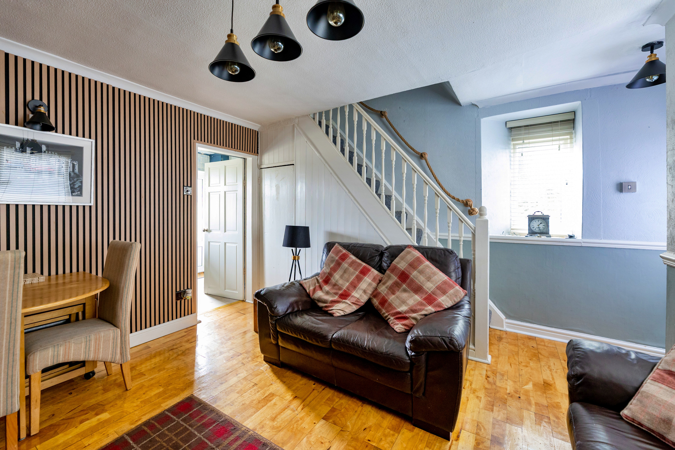 Upstairs, two bedrooms provide restful accommodation for up to four guests. Choose between a comfortable double and a twin room, both complete with Smart TVs and ample storage. A modern bathroom serves both rooms, ensuring convenience throughout your stay.