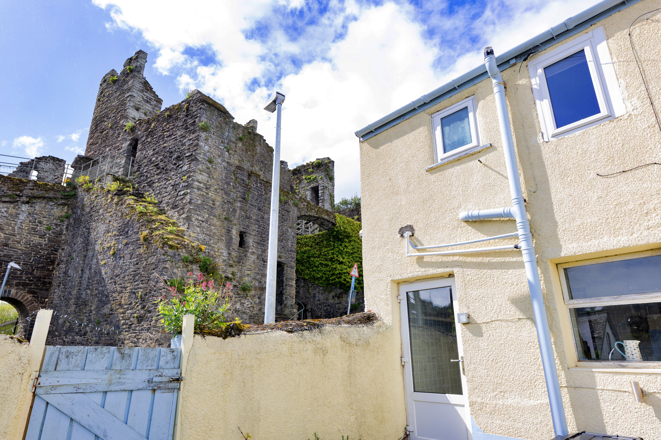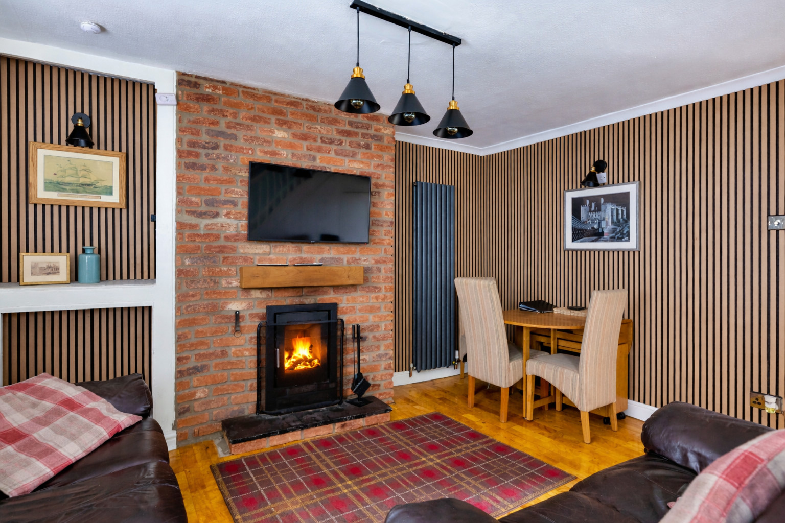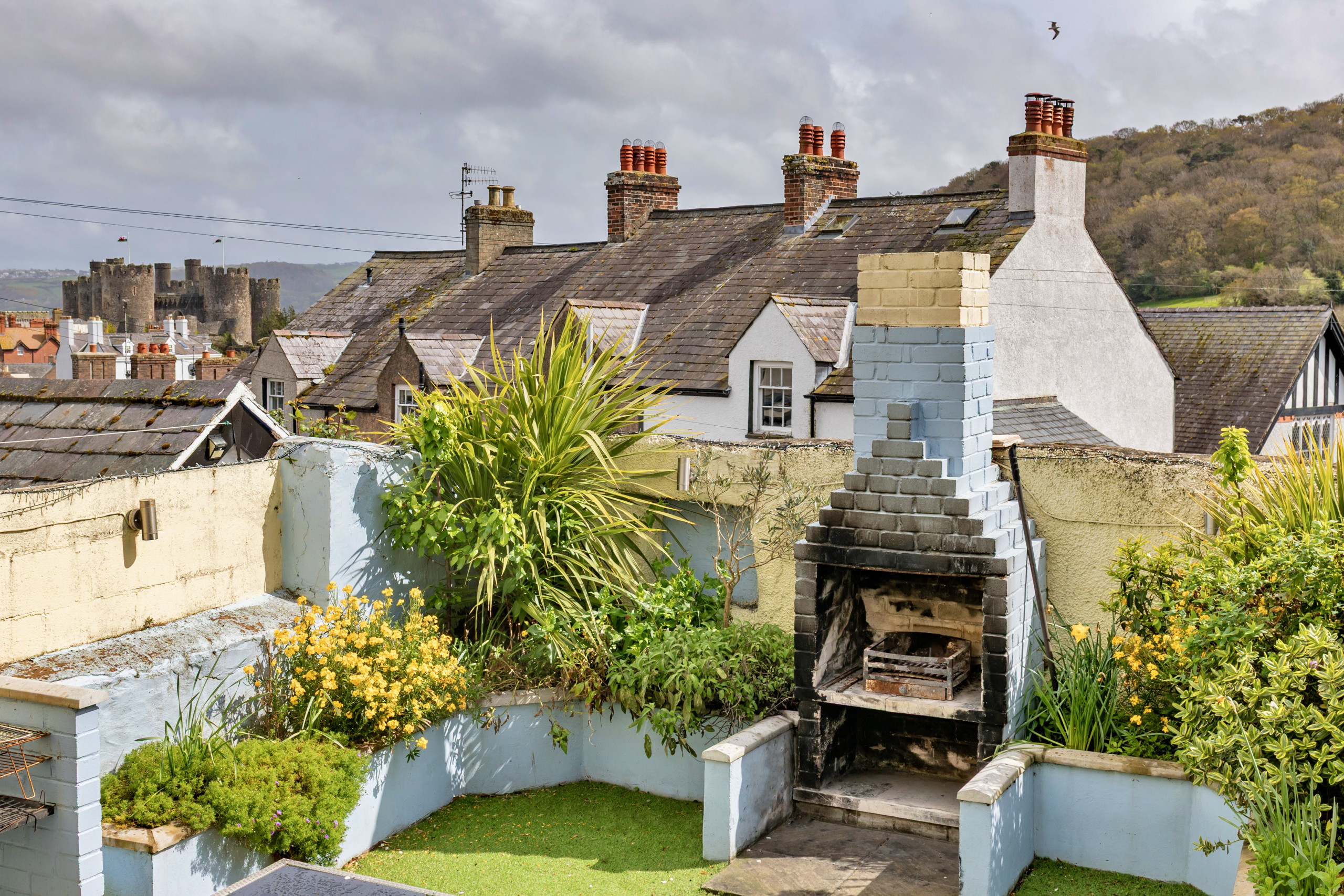 Inside, the living/dining room provides a space to unwind, featuring a woodburning stove and Smart TV—ideal for relaxed evenings in. The well-equipped kitchen has everything needed for a self-catered stay, including a washer/dryer and dishwasher. From here, step out to the enclosed rear patio, where a fire pit awaits and with stunning views of Conwy Castle.