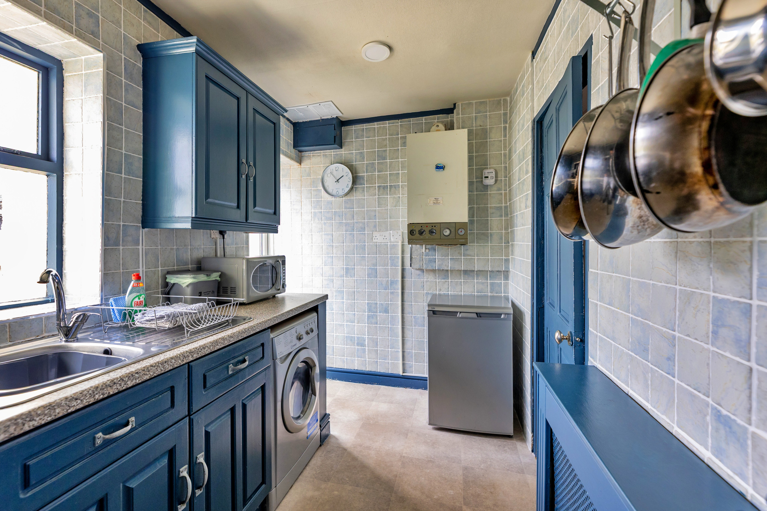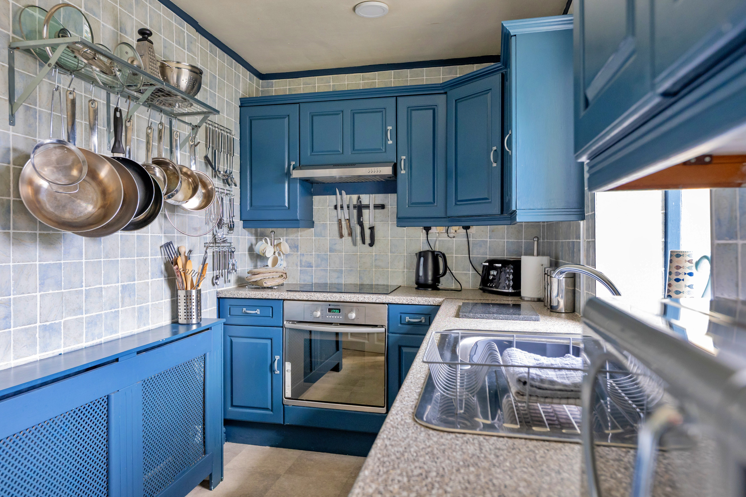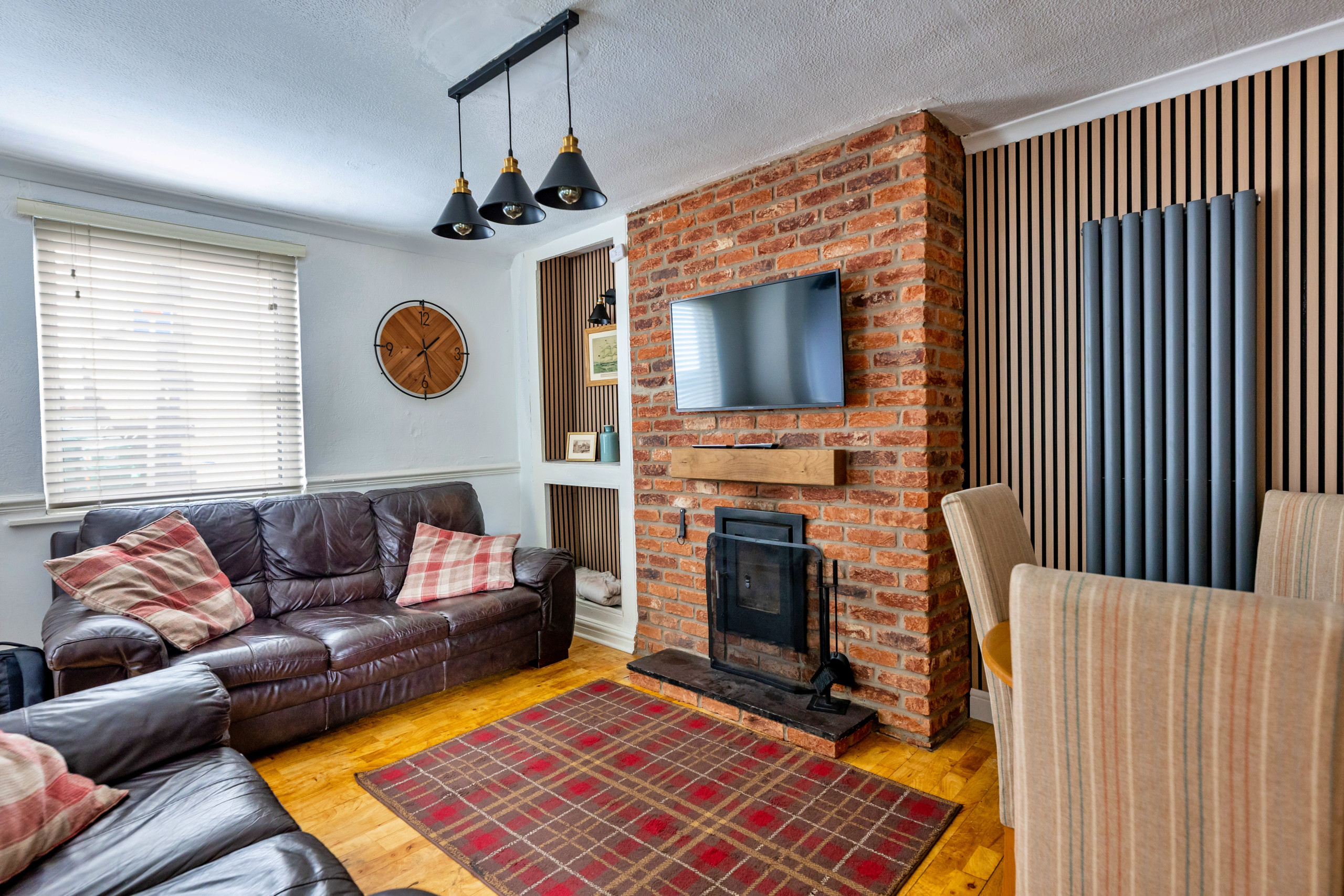 Inside, the living/dining room provides a space to unwind, featuring a woodburning stove and Smart TV—ideal for relaxed evenings in. The well-equipped kitchen has everything needed for a self-catered stay, including a washer/dryer and dishwasher. From here, step out to the enclosed rear patio, where a fire pit awaits and with stunning views of Conwy Castle.