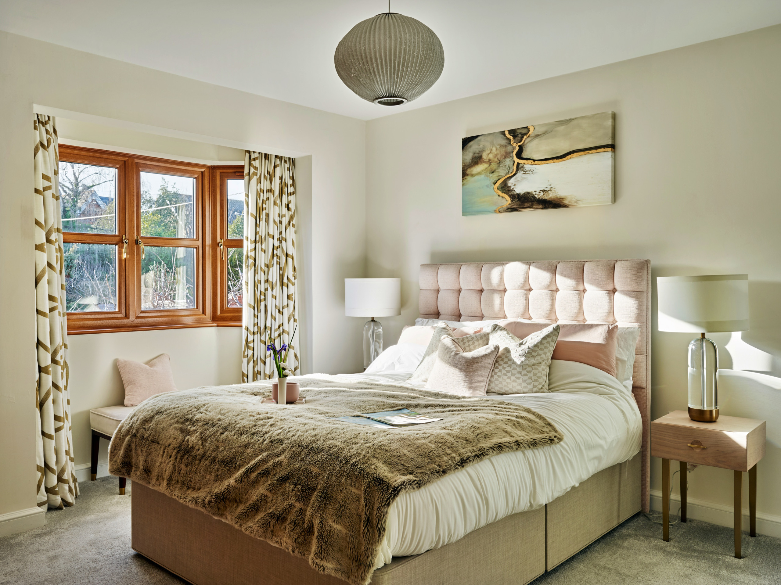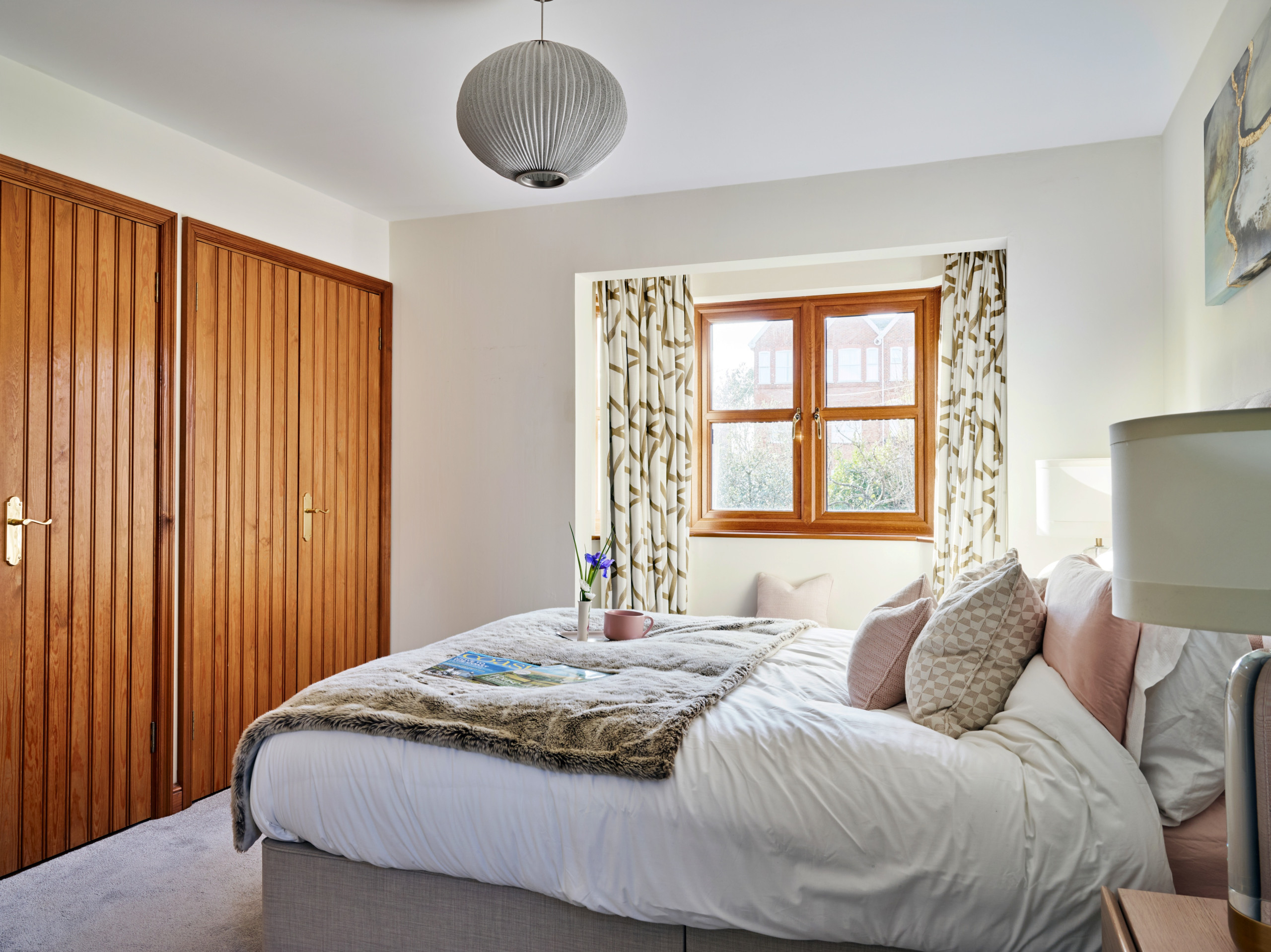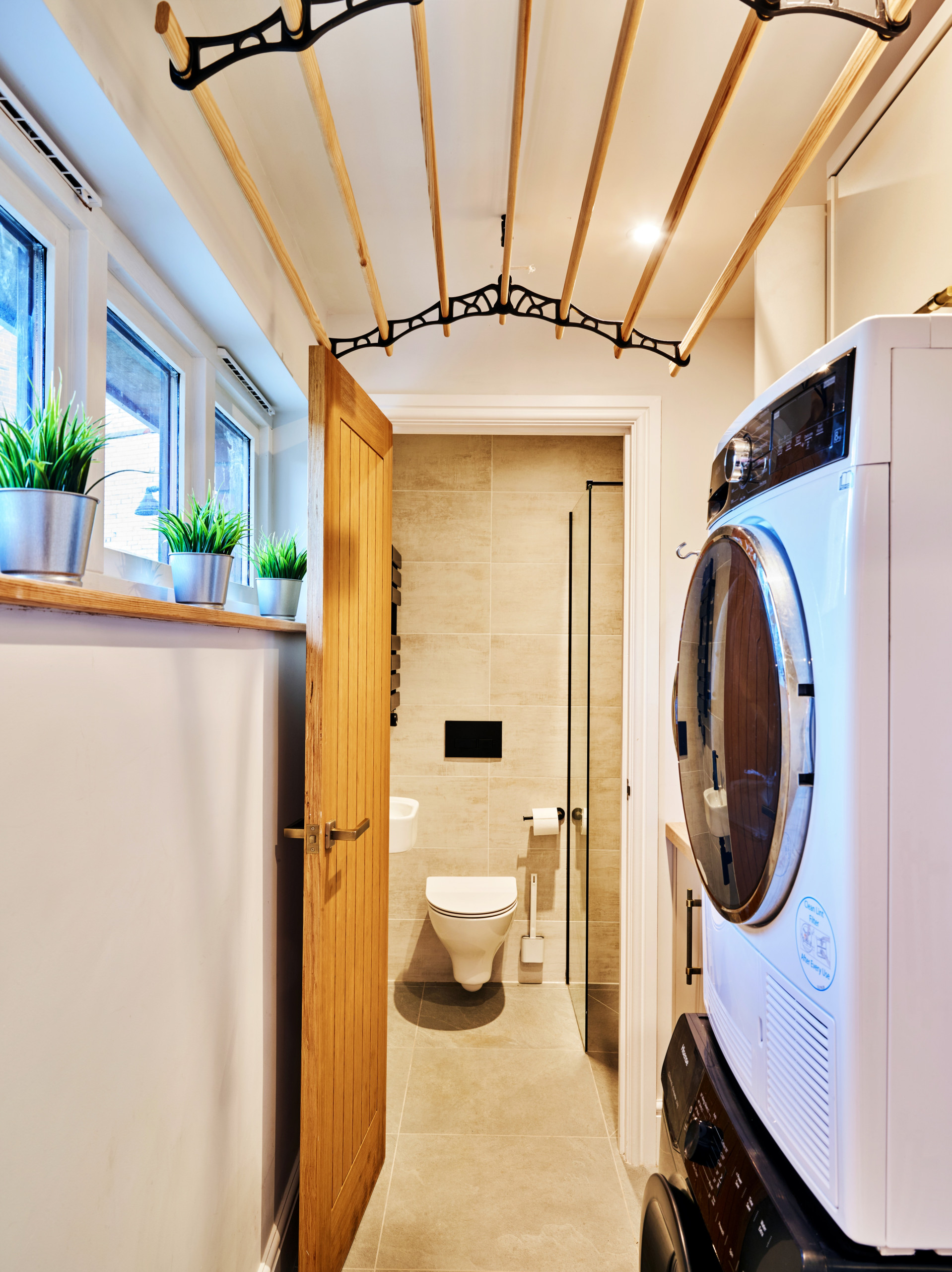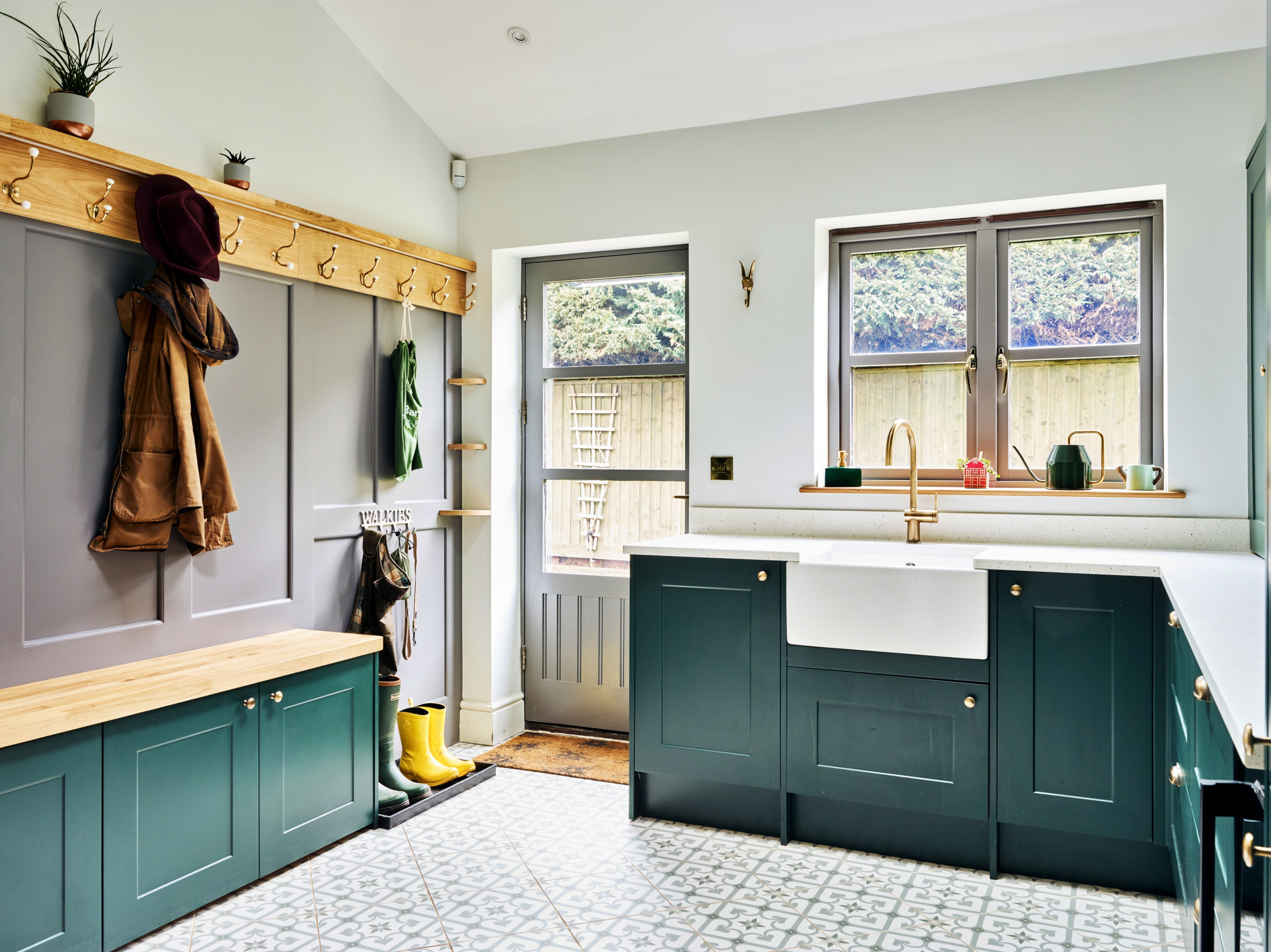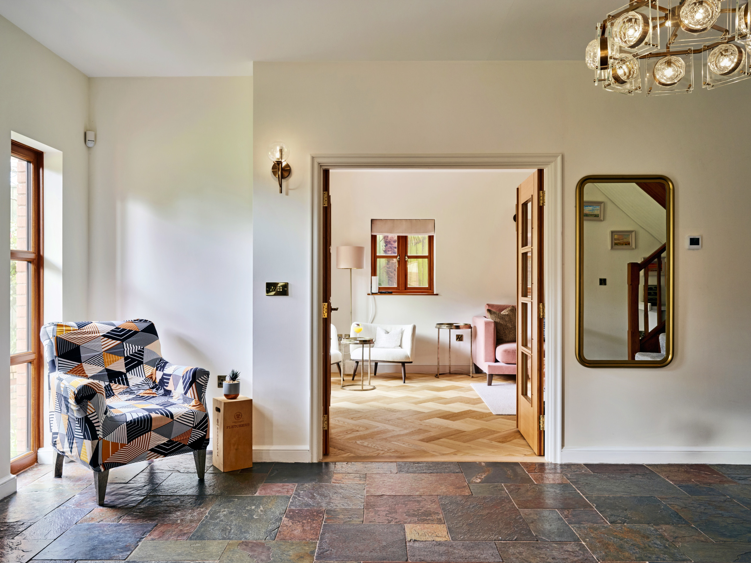 The ground floor is designed around comfort and easy social living. A large entrance hall leads to a light-filled living area that forms the heart of the home, with comfortable seating and a dining area set within the same space. A separate, spacious kitchen diner offers a more informal setting for cooking and eating, fully equipped for everything from quick breakfasts to long, sociable meals. Just off the kitchen space is a snug, perfect as a quiet retreat and for relaxed movie nights. The ground floor also benefits from a large boot room, complete with butler sink, bespoke cabinetry, practical storage and a built-in dog bed, along with a convenient downstairs WC. The entire downstairs area is warmed throughout by underfloor heating for toasty tiles under feet.