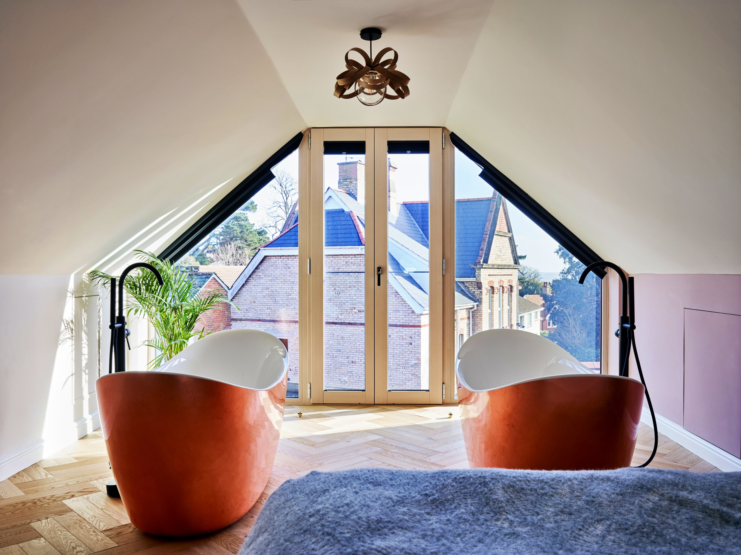 Occupying the top floor, the master suite is a true highlight of Sea Gables. This impressive space features a king-size bed, separate dressing room and a luxurious en-suite bathroom with his and hers sinks, dual rain showers and two freestanding bathtubs positioned side-by-side to make the most of the sea views. Juliet doors open to great views over the garden, while underfloor heating in the bathroom and air conditioning in the bedroom adds an extra layer of comfort, creating a private retreat that feels both indulgent and serene.