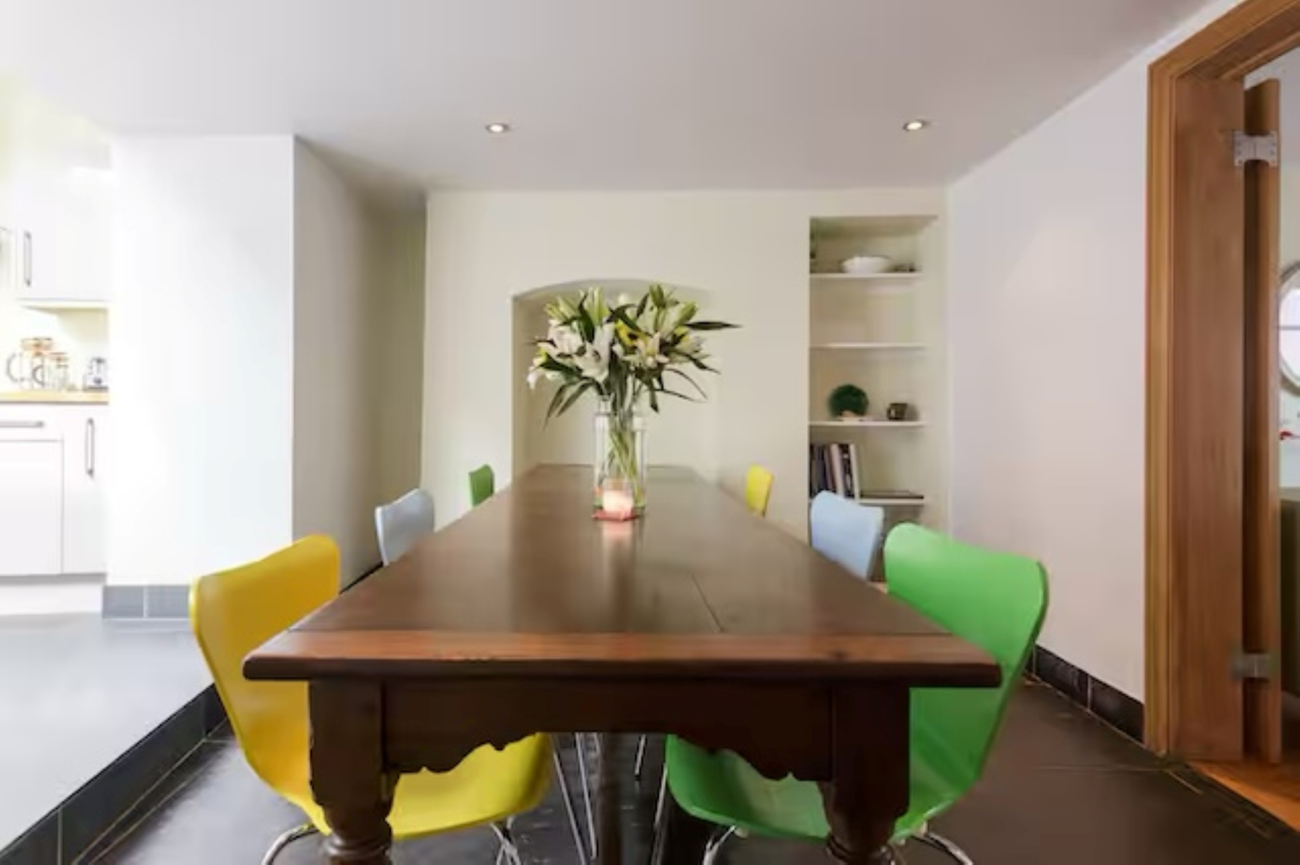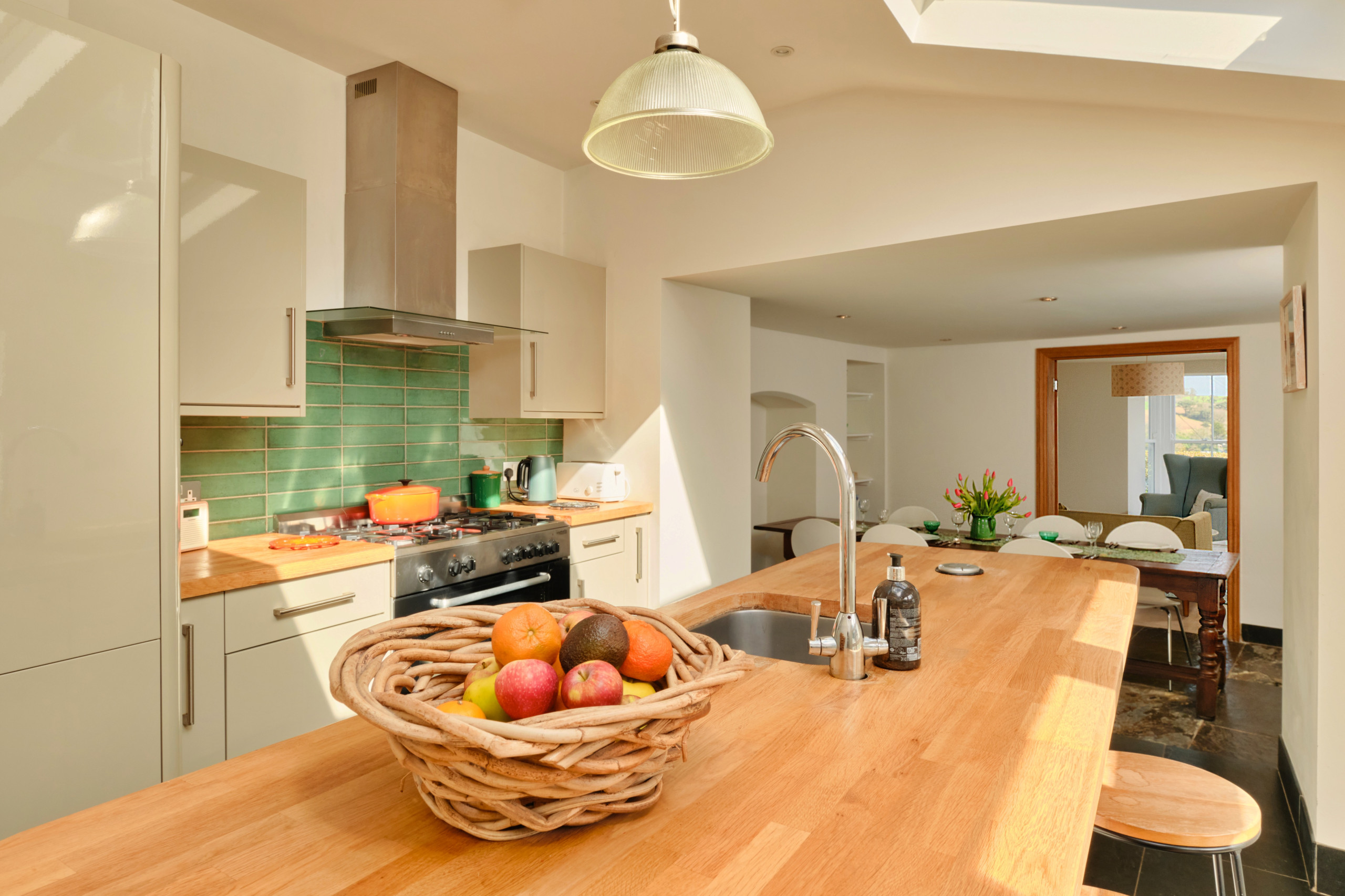 The fully equipped kitchen features a range cooker with electric oven and five-ring gas hob, dishwasher, fridge freezer, cafetière and Nespresso Vertuo coffee machine, ensuring everything you need is at hand. The adjoining dining area provides a welcoming space for shared meals, while the large family sitting room offers plenty of room to unwind. A second generous sitting room provides additional space for relaxation, perfect for larger groups or quieter moments.