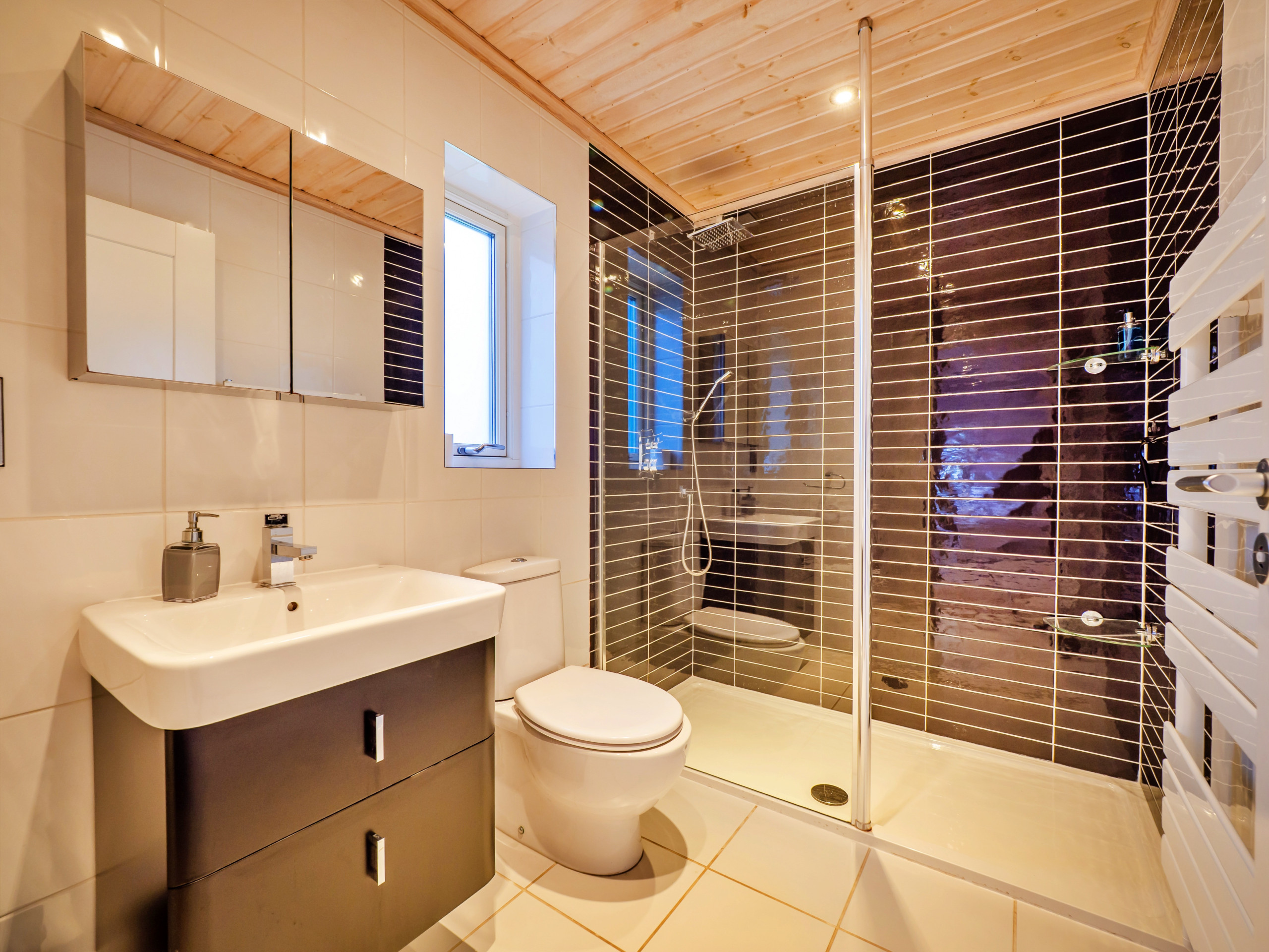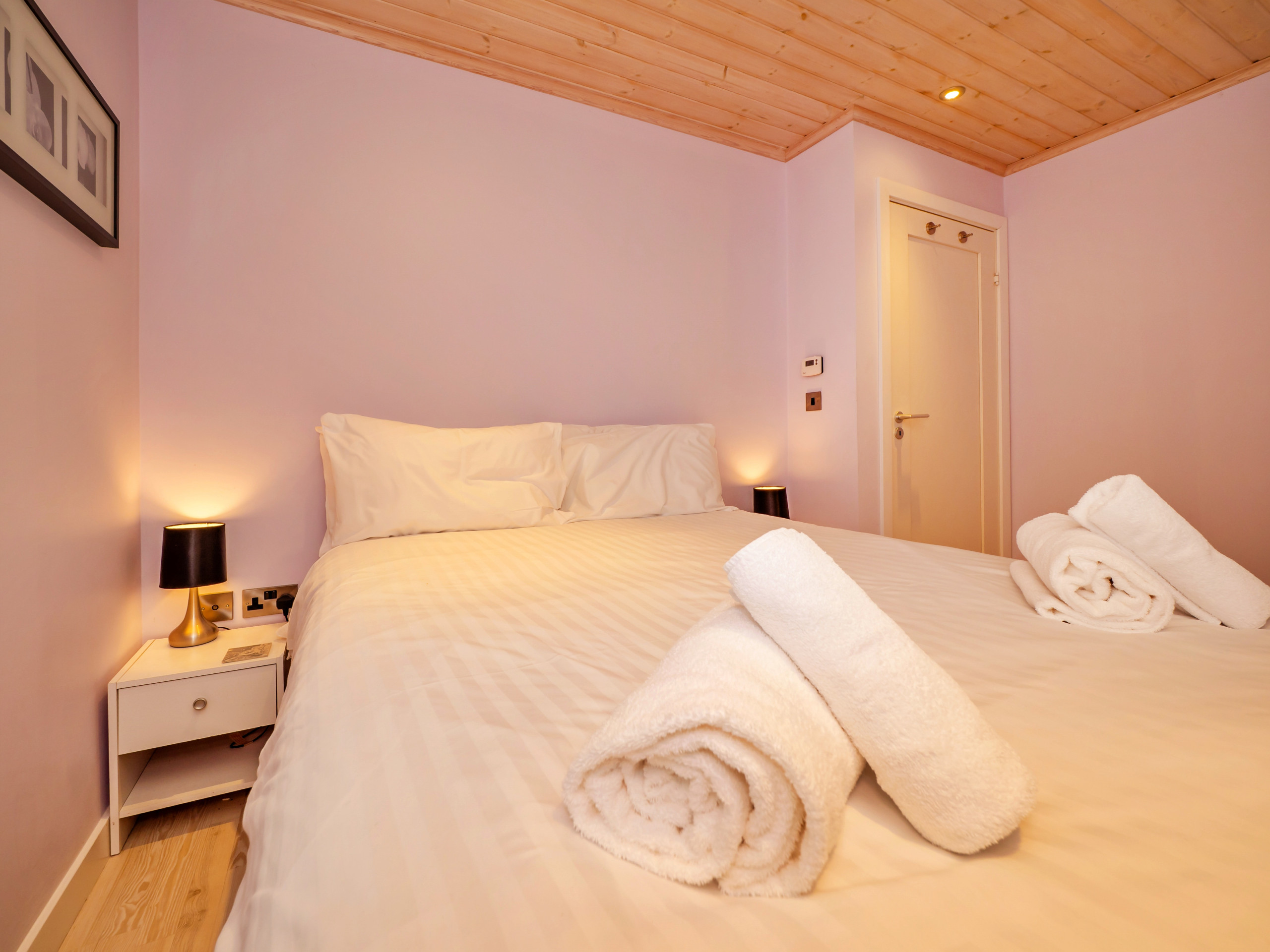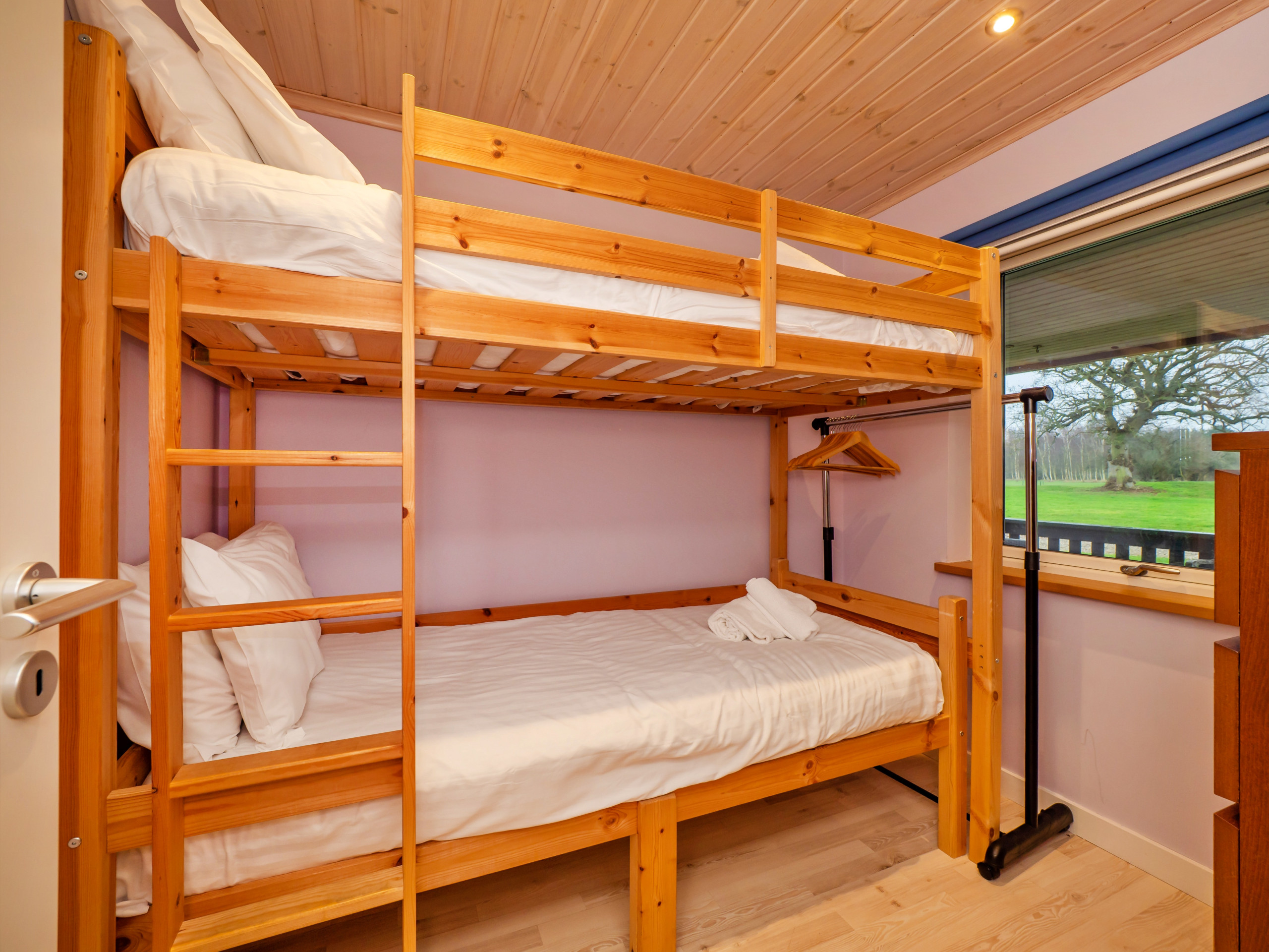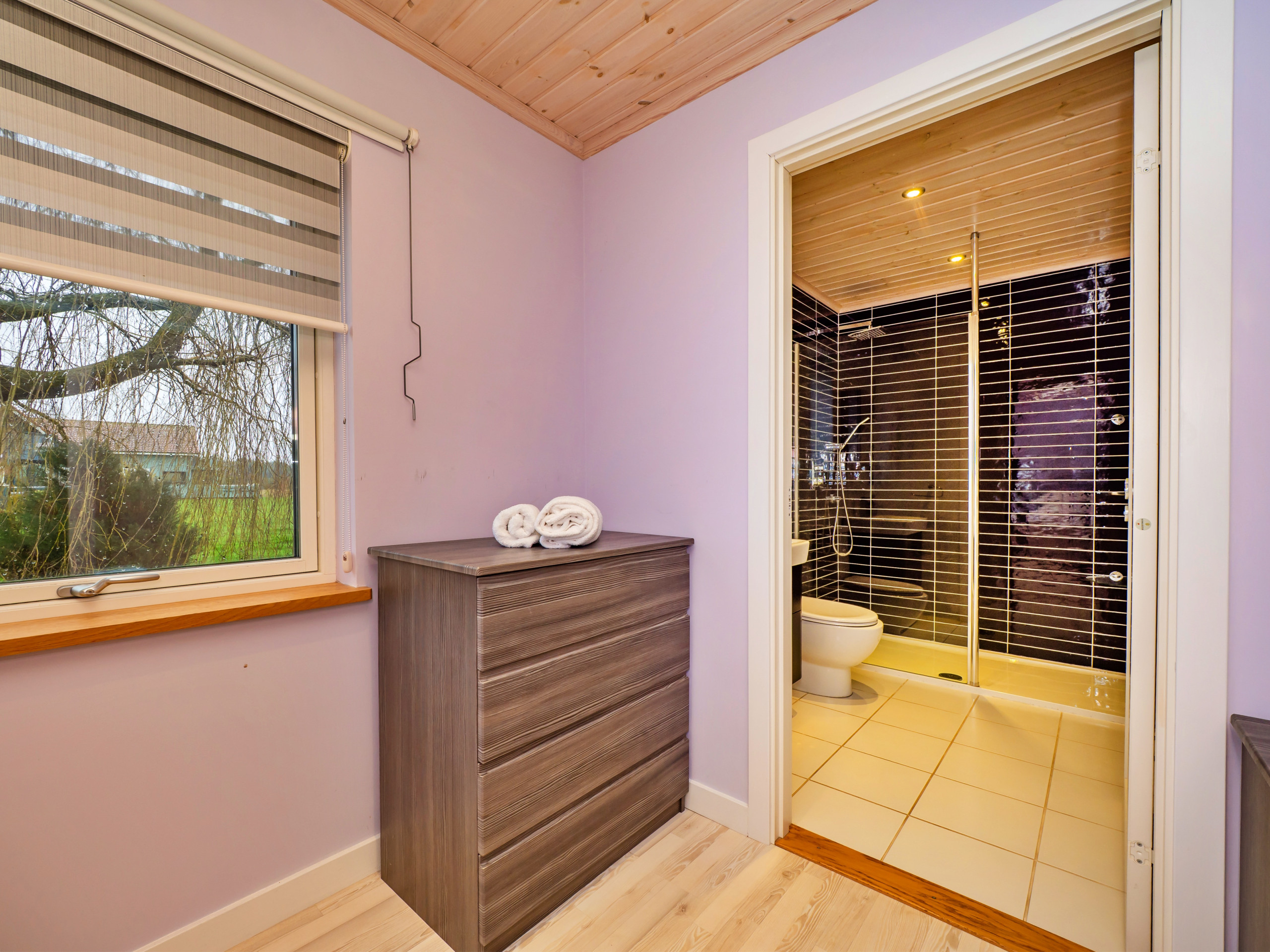 The ground floor hosts all three bedrooms, comprising a bunk room, a king-size bedroom with access to a covered courtyard seating area, and a master bedroom with a super-king-size bed and en-suite shower room. A family shower room and separate WC are also located on this level, providing convenience for all guests.