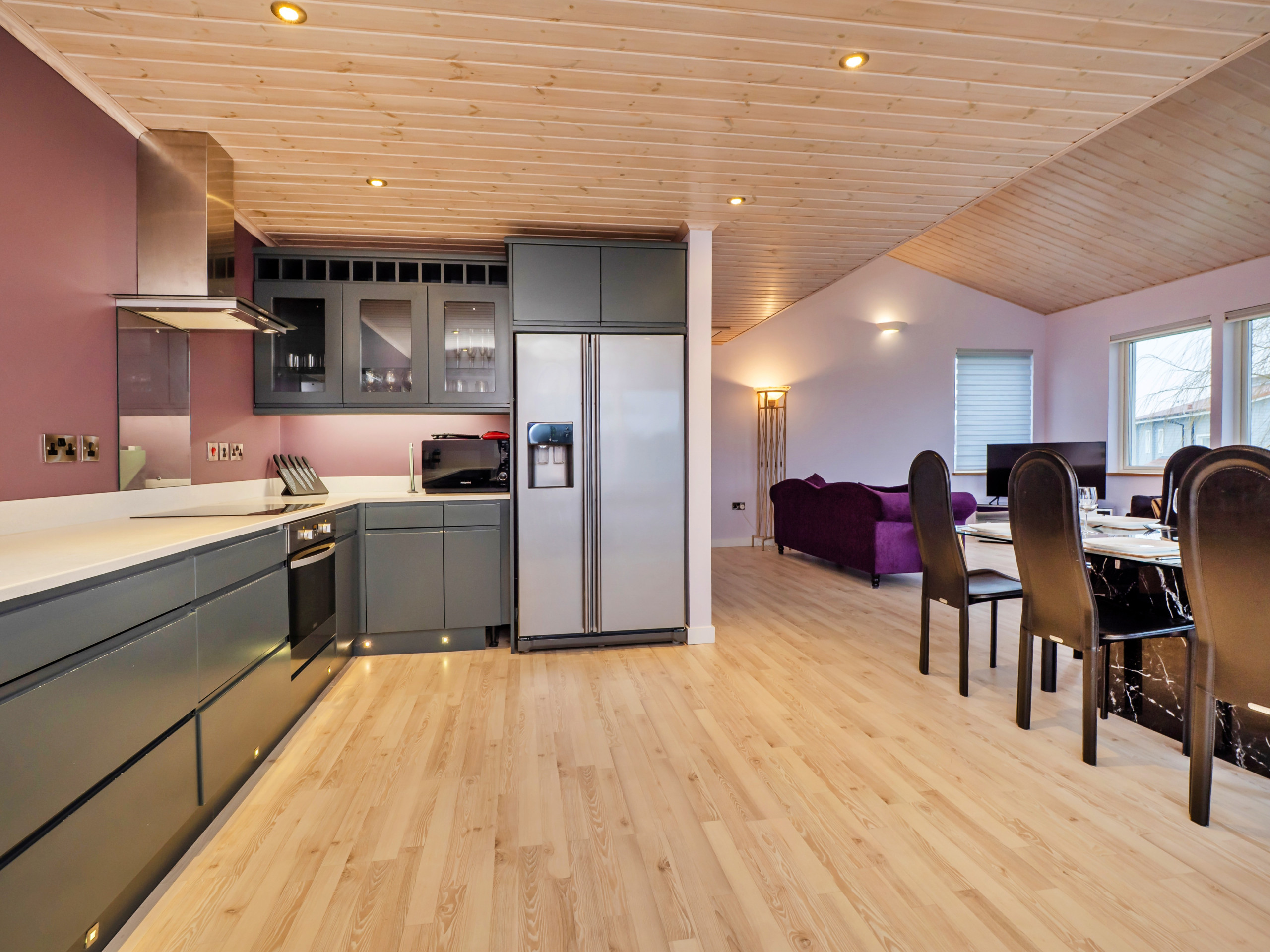 Upstairs, the spacious open-plan living area enjoys lovely views across the lake and golf course. The lounge is comfortably furnished with sofas, armchairs, and a Smart TV, while large windows allow plenty of natural light. The dining area features a modern glass table, and the well-equipped kitchen includes an electric oven, induction hob, microwave, and an American-style fridge/freezer with ice dispenser. A WC is also located on this floor, with a separate utility room downstairs housing a washing machine and tumble dryer.