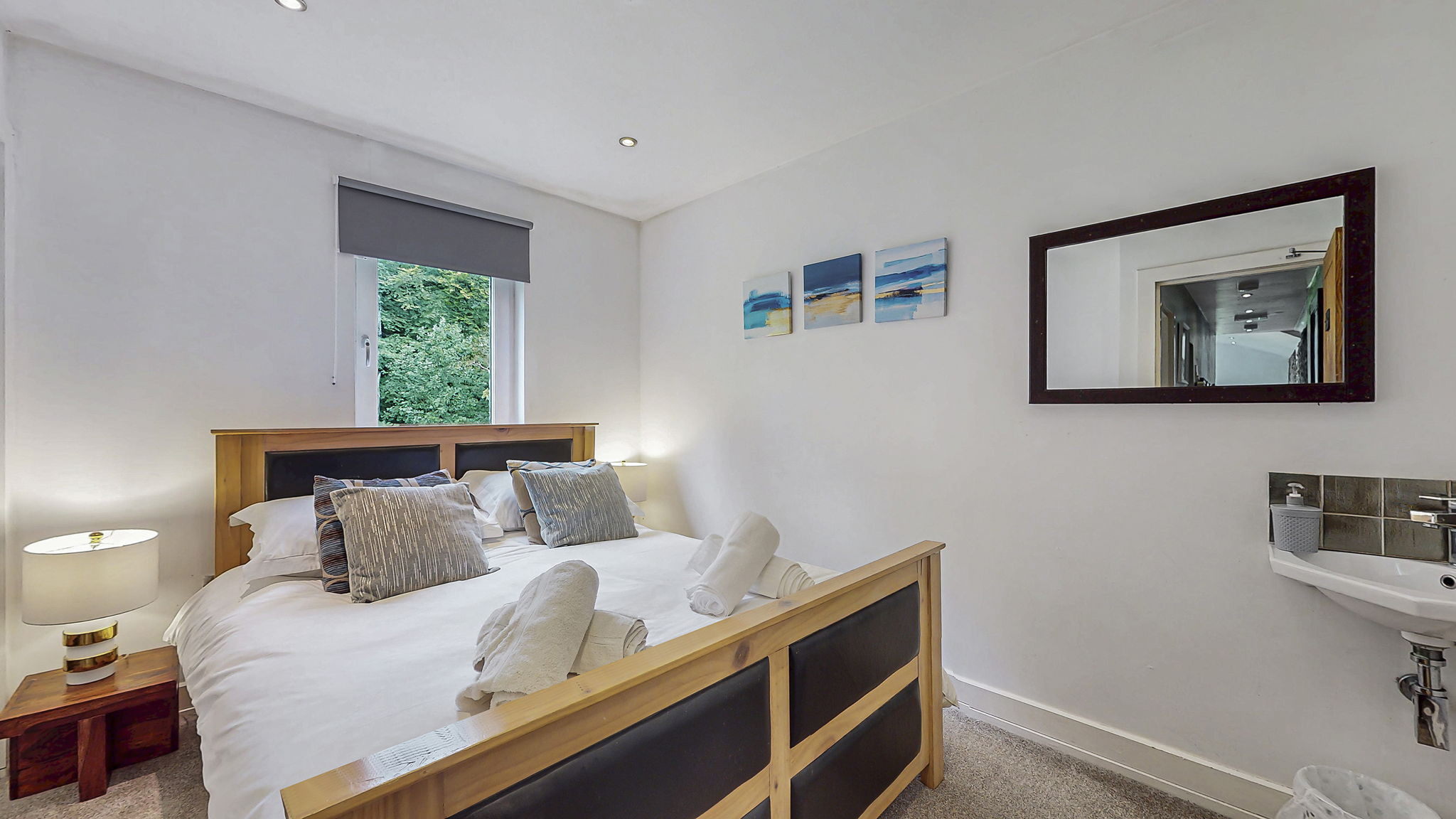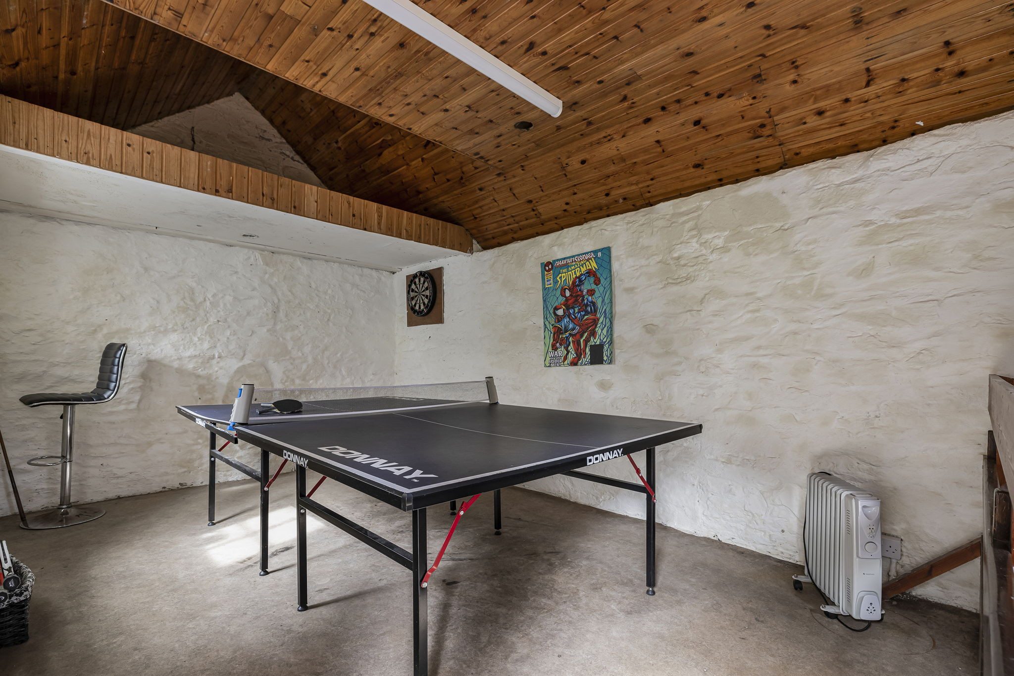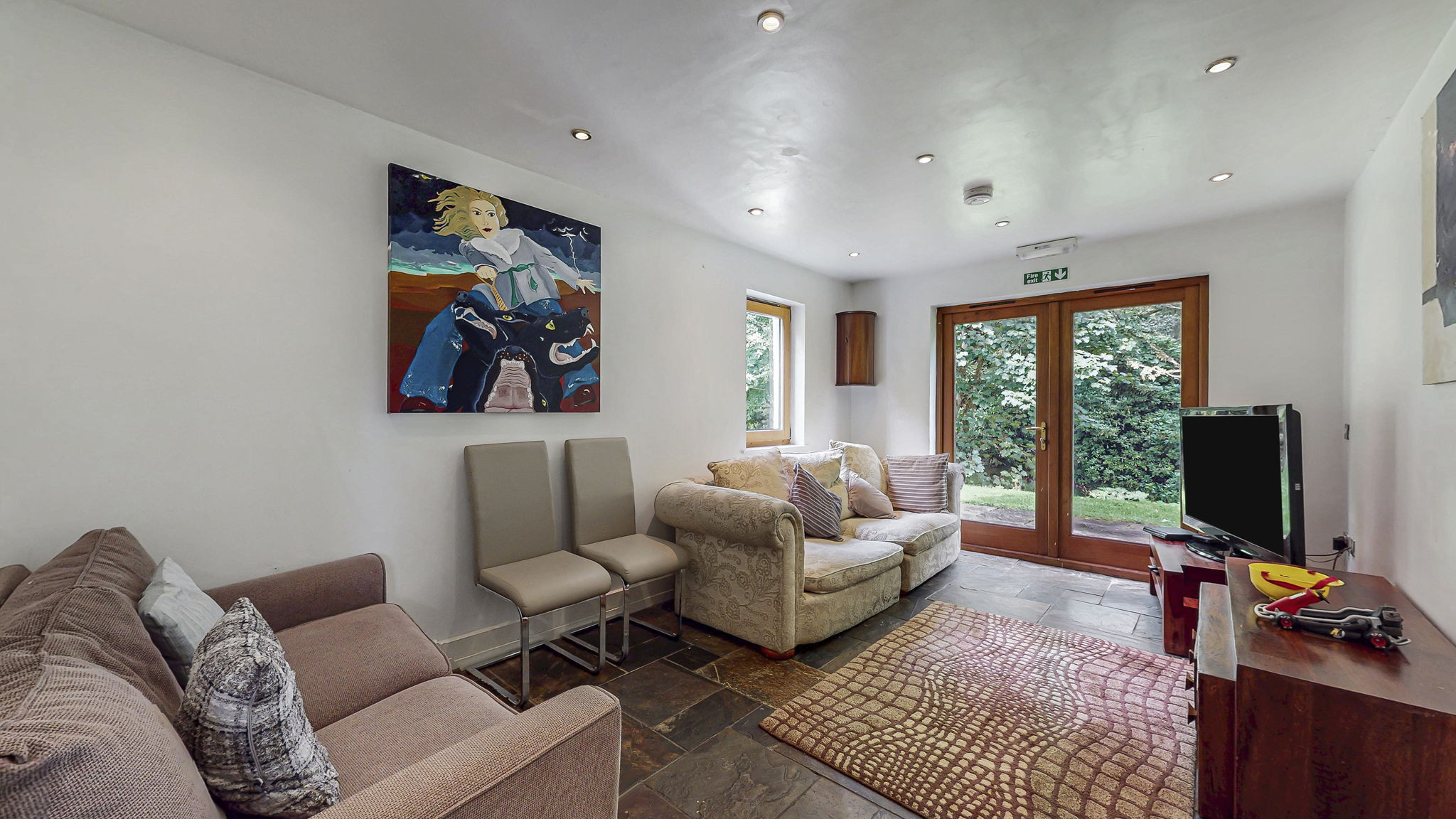 In addition to the main socialising space, two additional reception rooms each open through French doors onto the private gardens that sweep down to the river. Children have their own dedicated playroom just behind the living area, with two sofas and full Sky TV—perfect for downtime or movie nights. On the mezzanine level above the kitchen, a charming smaller lounge with seating for five leads out to a suntrap patio complete with BBQ, original bench seating, and a seven-person hot tub overlooking enchanting woodland and forest scenery.